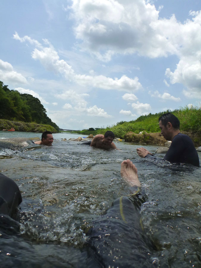 しか〜し、今回はそうはならないのです。な〜ぜだ〜? その味を凌ぐ素晴らしさを味わったからです。この日の最高気温は多分35℃前後だったのでは?そんな暑さの中訪ねたのがここです。 もうおわかりでしょう。到着した1〜2分後にはご覧の通りです。夏雲が浮かび太陽が照りつける中での至福の時!冷たい水の中にいつまでも浸っていたいと思わされました。参加者の平均年齢ウン十歳代。しかしてその平均精神年齢は『美しい十代』でした (^○^) アップ宣言はまだしません。本日のルート。 ツール・ド・国東は完走は当たり前、タイムが問題。しかし、『阿蘇望』は完走が最大の勲章。挑戦すること6回、完走は2回だけです。大会名称は『阿蘇望』而してその実態は『修行』か『苦行』か! 昨年5月からのトレーニングで、自転車力は格段に向上し(多分)、体力的にもパワーアップ。写真は整骨院で計量した結果です。拡大して体内年齢だけでも見てやって下さい。まっ、自慢ですから無視されて結構ですが、、。 阿蘇望の完走、必要なのは雑草の逞しさに違いありません。明日は逞しさの芽のかけらを育むために遊んできます (^。^) 皆さん、完走の念力を送って下さいね〜。