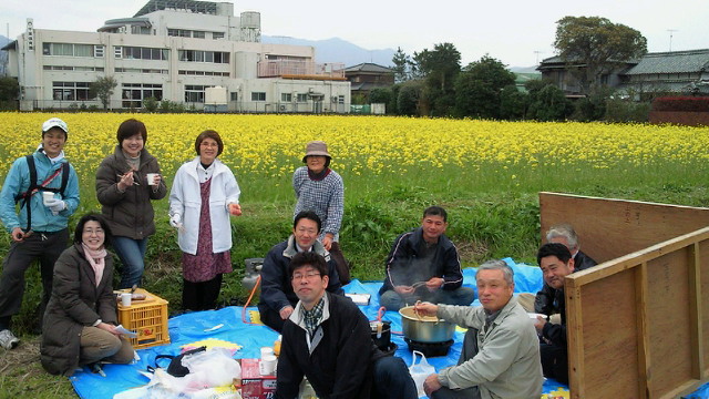 春をお届けします!土曜27日は油山で知り合いになったHideki君とサイクリング。バイクを売って自転車購入。自転車歴3日ピッカピッカの一年生Cyclistです。ただ今人生修行中。明るく何事にも前向きな好青年。サッカーで鍛えられただけあり、初心者といえども既に自転車脚の持ち主。糸島半島、日向峠を走りましたが、遂に先輩らしく引き離すことは出来ませんでした。 今回のサイクリングの大きな目的の一つは、春を思う存分味わうこと。撮りたての春どうぞご覧下さい。もっともどちらのお宅でも春爛漫。宅配は不要かもしれません。解説、勿論不要ですね! さて、今日は楽しいハプニングに恵まれた一日でもありました。二見ヶ浦では随分久し振りに砂浜に足を踏み入れました。今回のように夫婦岩を間近に撮った写真は初めてです。そして、これも初めて訪ねた『つまんでご卵ケーキ工房』 糸島半島を走るCyclistの皆さん!心地よい汗を流した後は、是非この店で炭水化物の補給をどうぞ。明るい店内で景色を楽しみながらのケーキ。そのケーキの厚み!店員さんの明るい応対で、気分も和みます。至福のひとときとなること請け合いです。 そして本日最後のハプニング。有り得ないほどの楽しいハプニング。 糸島半島から日向峠を目指し、周囲の景色を楽しみながらペダルを踏んでいました。突然鮮やかな黄色が眼に飛び込みます。菜の花畑です。蜜蜂よろしくハンドルを切り吸い寄せられます。 そこは別世界。甘い香り漂う菜の花畑での花見です。『花見ですか』の一言を切っ掛けに、仲間に加えて頂きます。引き入れられたと言うべきか、厚かましく入り込んだと言うべきか。答えは明々白々ですね。 骨付きの猪肉の旨いこと旨いこと。最高の味でした。収穫間もないエノキダケの香りの素晴らしさ!ホイル焼きに鍋。そして味ご飯のおにぎり。まるで仲間のような歓待を受け、言葉だけは遠慮。実際はたらふく頂きました。 『主船司倶楽部』の『菜の花を育てる会』 周船寺を菜の花の咲き誇る町にしようと立ち上がった同志の皆さんの花見でした。来年はもっと盛大な催しにしたいとのことです。秋のコスモスもまた然り。このような陰の力に支えられてこその美。そんな人知れぬ労に感謝の気持ちを忘れたくないものです。 今日は本当にごちそうさまでした。来年も是非仲間に入れて下さい!