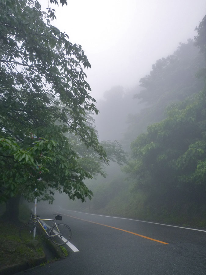 日曜が悉く雨にたたられ、長距離サイクリングを楽しめないのが残念です。 しかし、お陰で身近にあるものを如何に見過ごしてきたかを痛感しています。まだまだ市内や近郊に知らないとこが山とある。いや、場所に限らず、なにごとであれ知っていることが如何に少な いか、、。もっと貪欲に挑戦しなければ。 さて、自転車。雨ニモマケズ頑張っています。それも、今まで走ったことのない道に乗り入れるのが面白くなりました。日常を破ると言うと大袈 裟だけど、今までと違ったことをする。それだけで心が躍ります。何度も走った油山にも知らない激坂がありました。既に挑戦三度。転倒の不安と戦いながら上る快感。いや〜、味わってほしいですね。挑戦し乗り越えたところに感動はある。そう思います。 そして半年ぶりに登った片江展望台。雨に煙る景色も捨てがたいものです。降り募る雨の中、大輪の花を咲かせるタイサンボクもなかなかです。 背振山も2度登りました。コースはそれぞれ微妙に変えて、どこに出るかワクワクのサイクリング。口に広がる木イチゴの甘い味には、遠い昔にタイムスリップさせる魔力があるかのようです。そんな脊振で撮った写真の内、滝の写真中央部には撮影する私と愛車の影が映り込んでいます。わかんないだろうな〜。 梅雨は、瑞々しい緑がいいですね。雨に濡れた黒い樹幹との対比があればもう最高! 雨も厭わず淡々と走り、今月の累計500k 超になりました。八大竜王へ贅沢なお願いを一つ、長距離サイクリングを楽しむため、日曜だけでも雨やめ給へ!