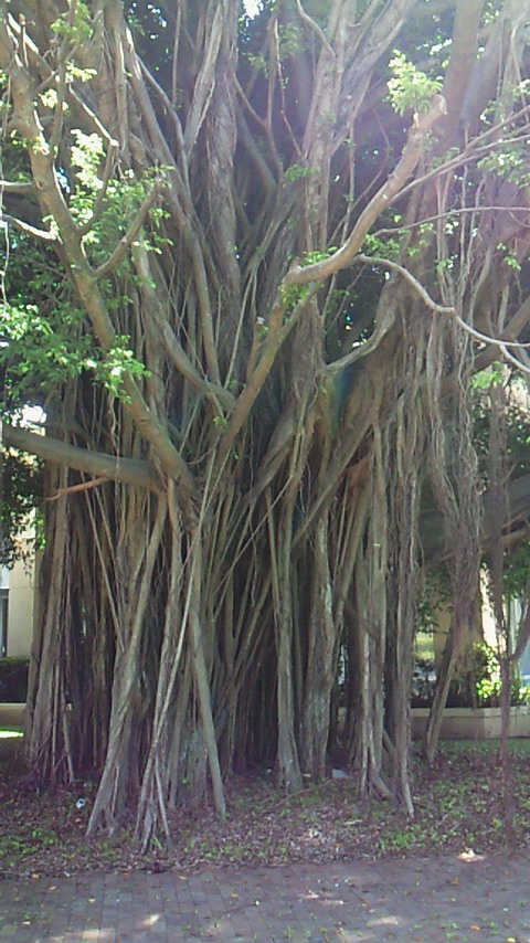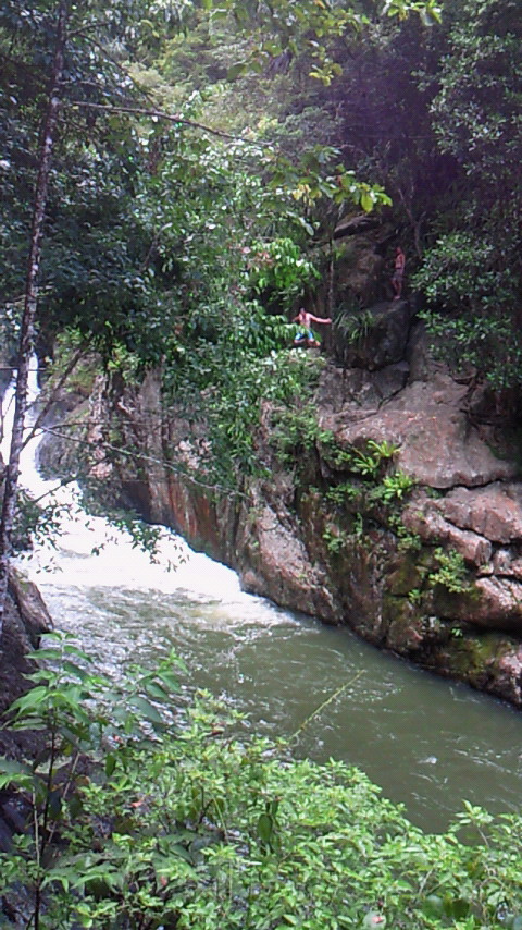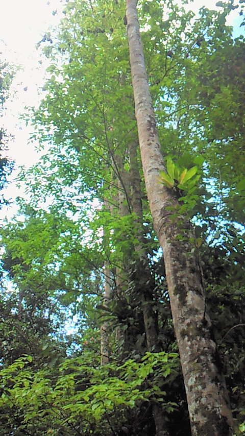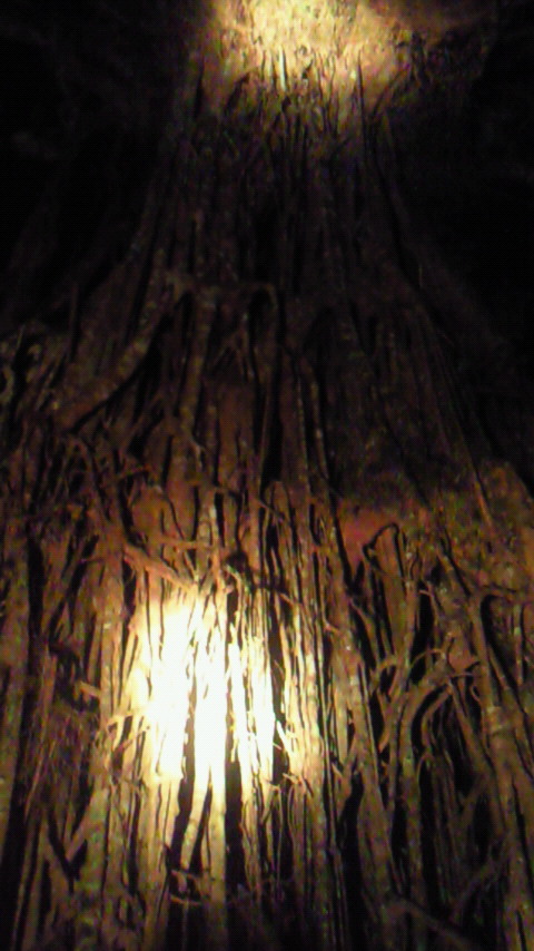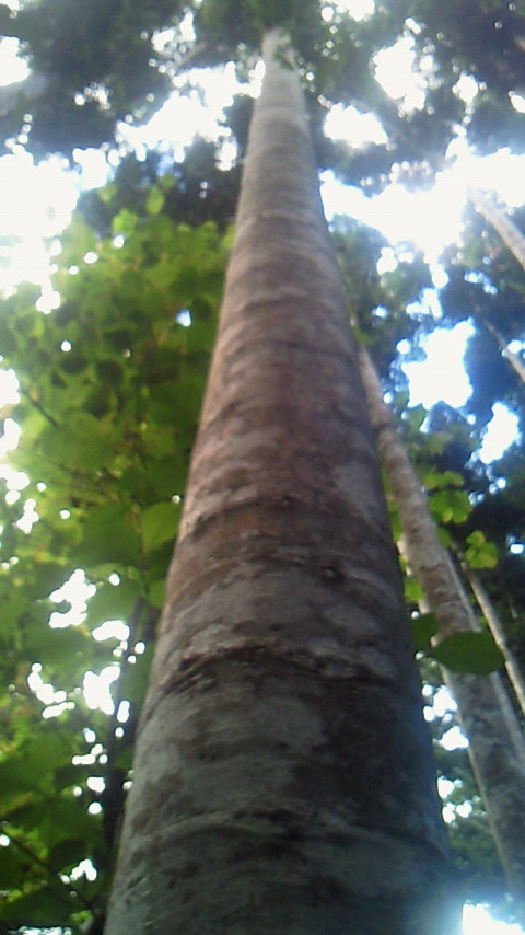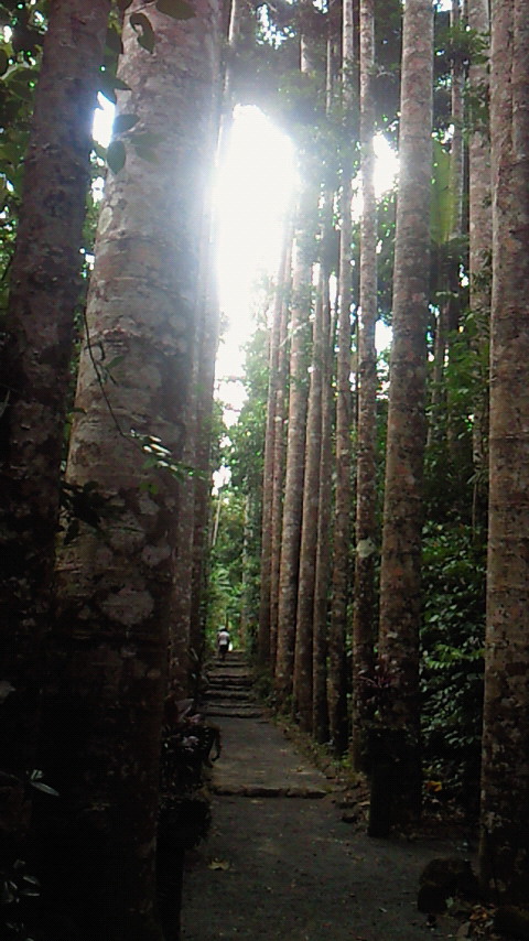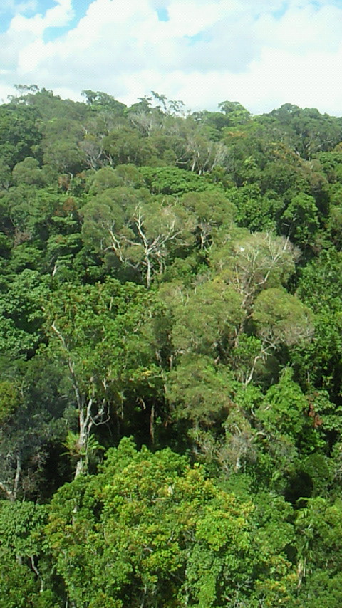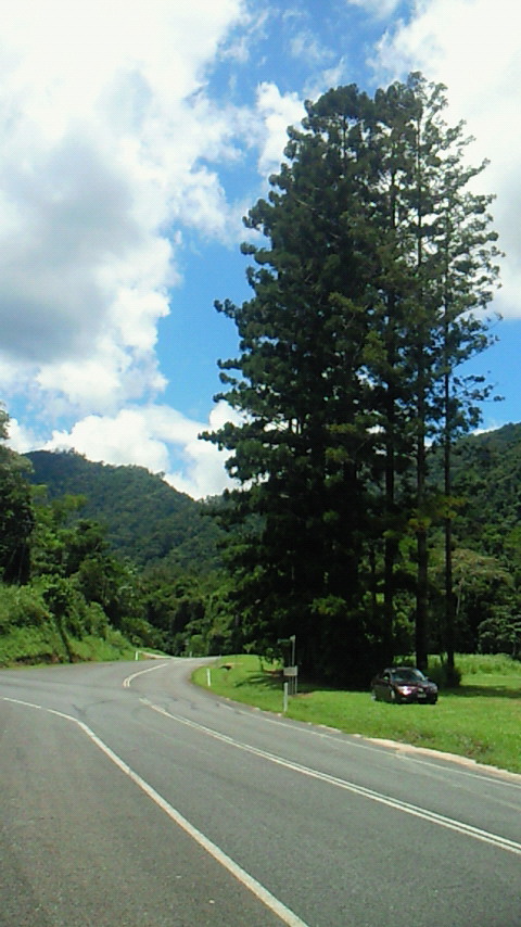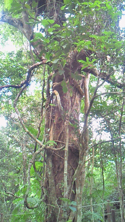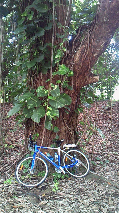 この木何の木、気になる木。気になる木の中から2つ。 絞め殺しの木、イチジク。他の木の樹上に育ち、地上に根を伸ばして、やがては宿主の木を絞め殺す。 至る所イチジクの根あり 巨木聖堂(宿主は絞め殺され空洞に) 上のライトから下は根 賢者の木、カウリマツ。生長とともに下の枝を自ら落とし、絞め殺しの木を宿らせない。適者生存を地で行く賢い木。 カウリマツは純情一直線 幼木には所々に下枝も 右端写真上部の黒点は蝙蝠 サイクリングは、余りの蒸し暑さと恐らくは強烈な紫外線のため体力消耗、結局1日75km走っただけ。しかし、最も印象深いものでもありました。バロン渓谷とクリスタルカスケーズを訪ねました。日本の21倍の国土に、五分の一の人口。日本の観光地と違って店も自販機もなく、あちこちに散らばり各人が各人流に楽しんでいる風でした。 豪雨の影響?濁ったバロン川、増水でテーブルは、、。 地元の貫禄ライダー 道中2景 クリスタルカスケーズ・豪快ダイビング↑必拡大 もう一つ最も印象深い経験。熱気球でのアサートンテーブルランドの空中散歩。地上すれすれの低空を飛んだり、1キロ以上の上空を飛んだり。心躍る1時間でした。 搭乗した熱気球 出発地点を望む 日の出前の静けさ