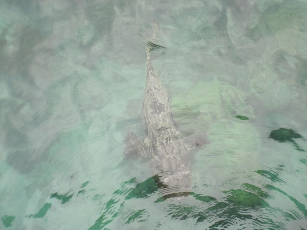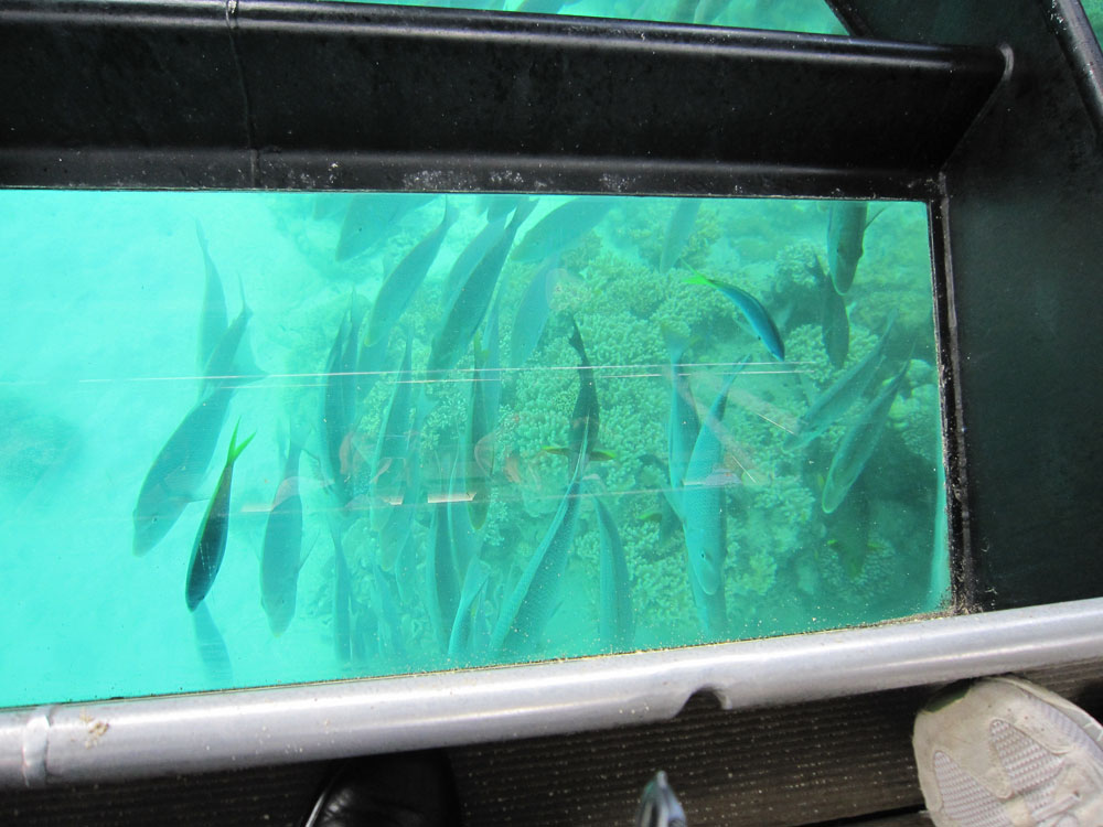 鳥の鳴き声も聞き慣れたものではなく、まさにジャングルの趣 グラスボートからは魚の群れと珊瑚等々、桟橋からは巨大な魚も間近に