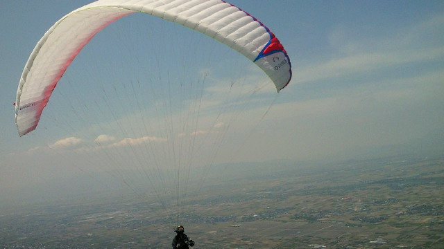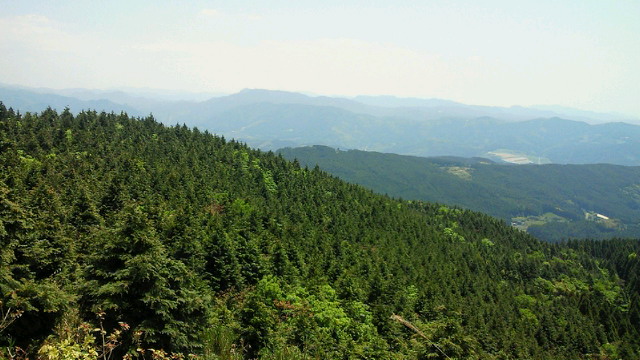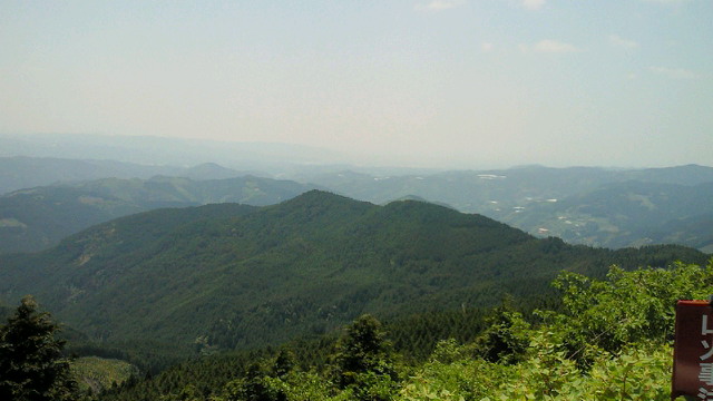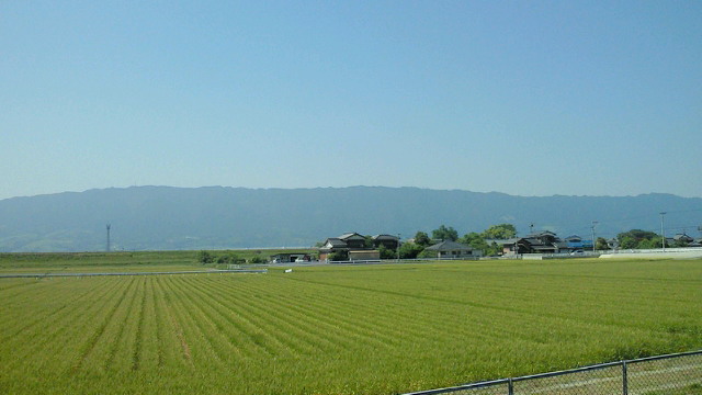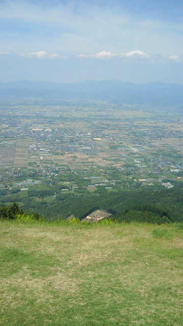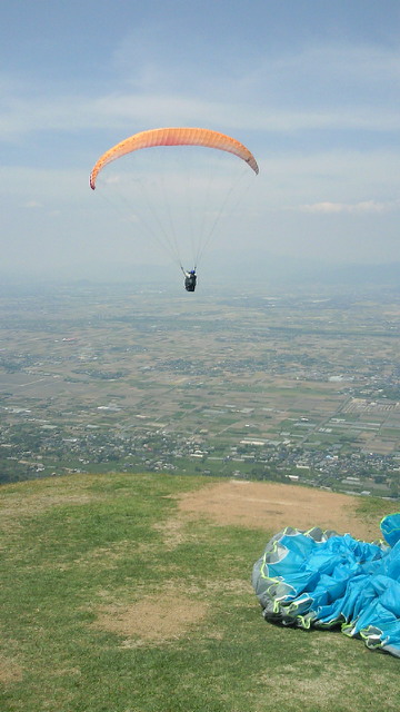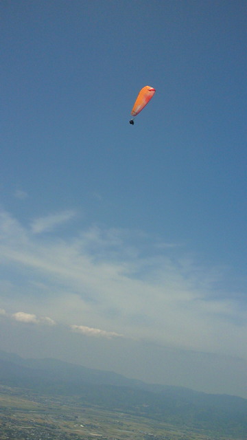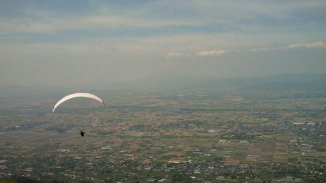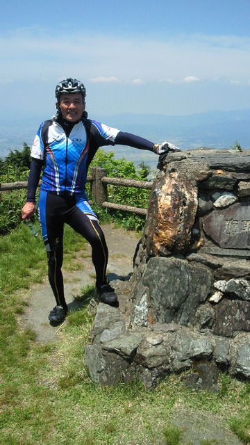 その第1弾。Dancing所謂立ち漕ぎの技量アップに挑みます。そこで16日に向かったのが耳納山地鷹取山。下の3枚の写真の奥に連なる山並みが耳納山地。鷹取山はその左端辺りにある標高802mの山です。左端の写真は、紫蘇畑と背景の色のコントラストが見事でついシャッターを切った次第。右端は鷹取山登り口近くの歴史公園で撮った1枚。美しい緑と間近に迫った鷹取山を見てもらいたい写真です。 今回の目標は、登り口から山頂までの全コースをサドルに座ることなく一気に上りきることです。 青空が広がり、気温もぐんぐん上がる「悪天」の中、平原公園から山頂を目指します。汗を滴らせながら『根性!根性!』とペダルを踏みます。 しばらくすると、遠く麓の方でサイレンが聞こえます。音はどんどん背後から迫ってきます。『俺が倒れると見越して霊柩車のお迎えか?』と訝る私を追い越し、救急車は山道を上ります。しばらく行くと今度は救急車が下りて来ます。擦れ違って更に5〜6分。 Shocking!! 一気に上りきる目標はあっさり捨てて自転車を止めました。 写真の説明はしません。車のボンネットは凹み、ヘルメットがぶつかったかフロントガラスは蜘蛛の巣状態。幸いにもライダーは意識はあった由。ガードレールの向こうは断崖絶壁。不幸中の幸いとしか言いようがありません。 山道をかなりのスピードで下っていての事故のようです。道である以上どんな道であれ車も走ります。交通量に関わりなく安全優先で楽しみたいですね。 気持ちを切り替え、いま少しツーリングの報告。事故現場に7〜8分止まり、再度Dancing。結局平原公園から1時間5分ほどで鷹取山頂着。全て立ち漕ぎで上りきりました。山頂での写真と、耳納山地の反対側のどこまでも山並みが連なる眺めをお届けします。 前回訪れた時と違い、黄砂の影響もなく遠くまで見渡すことが出来ましたが、更に今回は、グライダー山でパラグライダーが飛び立つ場目に遭遇する幸運に恵まれました。ご覧下さいこの写真!『私は鳥になりたい』そう思わずにはいられません。 本日の全行程約140km。月も後半になりましたが、累積距離も何とか500㎞。スロースタートになった5月ですが、月間目標達成も視野に入りそうです。 次の日曜日にでも鷹取再挑戦。全コースDancingの仕上げをする予定です。その結果も含め、来月早々に5月締めくくりの報告を致します。蛇足ながら全コースDancingを果たすことが出来れば、長岡君提案のツール・ド・SYAKAにも挑戦の予定です。