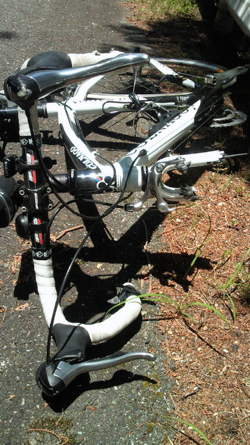 頑張っているのでなく工夫をしているのです。 明日の鷹取山ダンシング登山は、天気予報からすると無理でしょう。 しかし、6月6日決定。お受けしましょう。激坂2か所は押し覚悟で! 事故の画像。まさに二年前の事故が蘇ったからこそ写しました。 他のライダーへの警告を込めて撮ったものです。 あくまでも趣味。命と引き換えに楽しむようなものではありません。 それでは6日。お手柔らかに、いたわりの心で付き合って下さい!