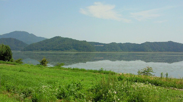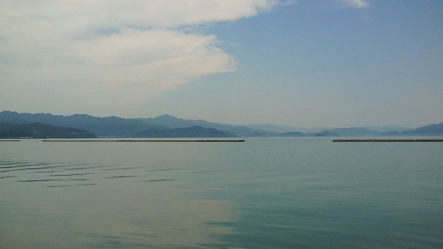 羽田野君を見送った後、何となく気合いが入らない。ホテル出発は、なんと9時過ぎ。既に暑い。ひたすら8号線を走る。加賀辺りだったか、山が幾重にも連なりその上に、雲が一直線に切れる形で、かかっているのが面白くて(写真)。 また、福井市では、九頭竜川が(写真)を撮る意欲をそそった。 それにしても、今日は北海道的な坂が多かった。アップダウンの連続。加えて厳しい暑さ! こたえました。水分補給で、コンビニへの駆け込みが増える。その最後を締めるのが越前から敦賀に抜ける坂。武生トンネル前後から道の駅河野までの区間。 坂の終わり方も劇的。道の駅の直前がピーク。道の駅の展望台に行くと断崖!一気に敦賀湾に落ち込む。そして、眼前には敦賀半島。原発があるからでもなかろうが、霞んでいる。(写真2)をご覧下さい。なんとも不思議な印象。 残り20キロ余りは楽勝。快適な下り坂。今日の宿、敦賀の街はこじんまりした印象だ。本日134キロ走破。 宿の近くで夕食の帰り、よろける程の荷物を積んだ自転車。その主は19歳の若者。優しい印象だが、すっかり日に焼け逞しい。聞けば、高校卒業後仕事をし、貯金ができたところで、自分を試そうと日本一周に挑戦。野宿で食費を切り詰めての旅。風呂に入れないのが辛いと彼。 コンビニで夕食になるものを持たせ、絶対に最後までやり遂げろと激励。握手で別れる。いつまでも私を見送っていた。 目が生きている!大丈夫!頑張れ!