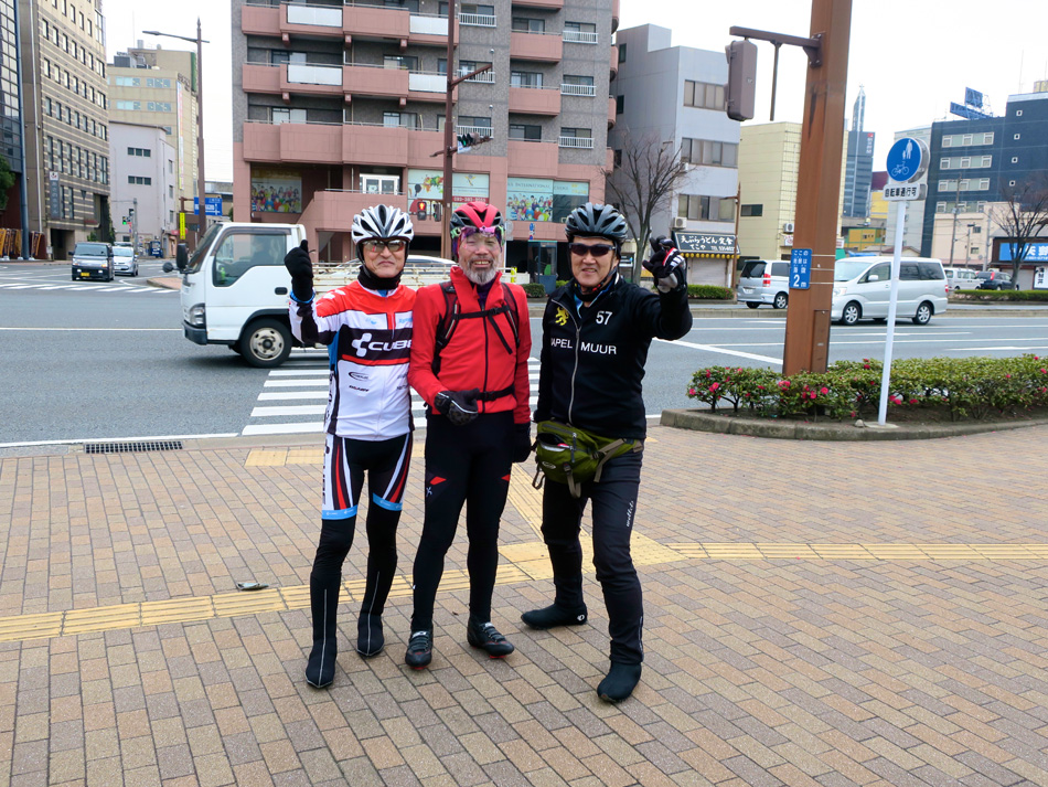 ス下見ツアーと自己中な企画。(冷汗) 7時スタート。ノンストップで福津市『麦の香り』へひた 走った。 小腹を満たし幸せ顔の urumanさんと私、それに何と〜〜 2年ぶり復活マッコチさん!! マッコチさん、ほとんど自転車に乗ってなかったそうだが 根性の走り健在でした! 久し振り自転車のマッコチさん、自重してここでお別れ。 マッコチさん、今後はちょくちょく参加ですよ〜! 別れてしばらく、赤間のコンビニで北九州組と合流。初参 加 110ウィルさんとヒロさん、お待たせしました〜! ウィルさんの超高級ハイテクマシンに話が盛り上がった。 後ろから接近する車を検知し通知するなど超優れモノ! 合流後は道を知り尽くすヒロさん先導のままに走った。 時に残雪のある峠道等々、迷路を走る気分でございました。 始めて続きの道を巡り巡って到着したのは『いーとん』 こだわりの人気カレー店。 昼食にスパイス薫るスパイスチキンカレー賞味。 空腹を満たした後マラソンコースを案内してもらった。 剛脚北九州組にはマイペース、いやハイペースで走りを楽 しんでもらうべく小倉駅付近で案内を丁重に辞退した。 『今日は本当にありがとうございました!』 別れた後の我等福岡組、いつものまったりペースで門司港 駅を目指した。 お日様マーク一日晴れの予報はハズレて、青空を一瞬も望 むことなく110㎞のツーリング終了! 門司港駅構内『雀のなる木』が最後の見物。(笑) 帰りの車内、楽しい一日の出来事に話が弾みましたよ! 皆さん楽しい時をありがとうございました。また是非一緒 して下さい。 よろしく〜! それにしてもコースを試走するジョガーが沢山いたな〜。 自転車で走るのがやっとの自分、、、顔晴らにゃ〜〜!! |