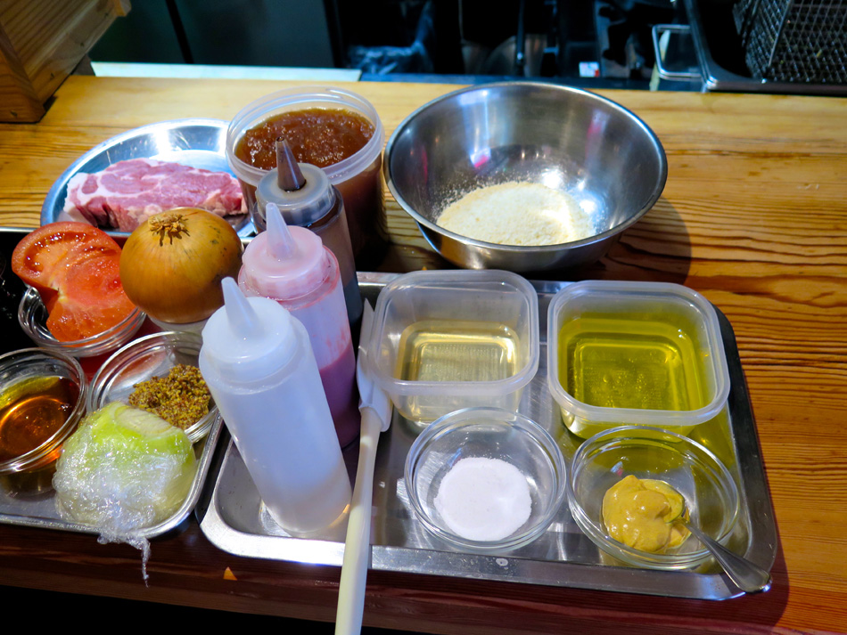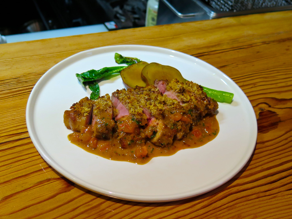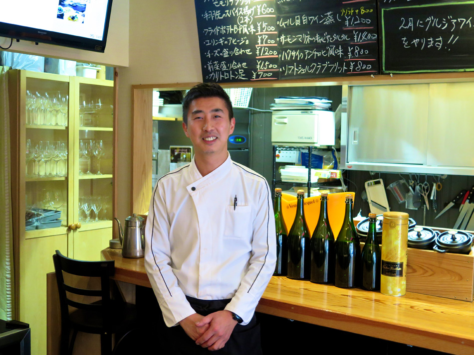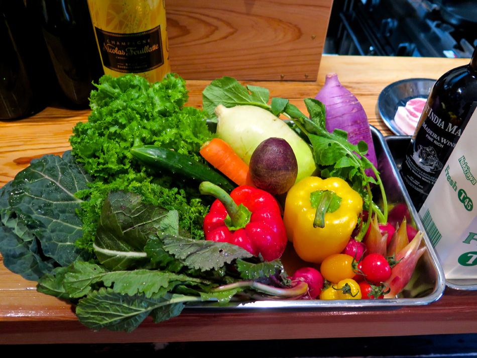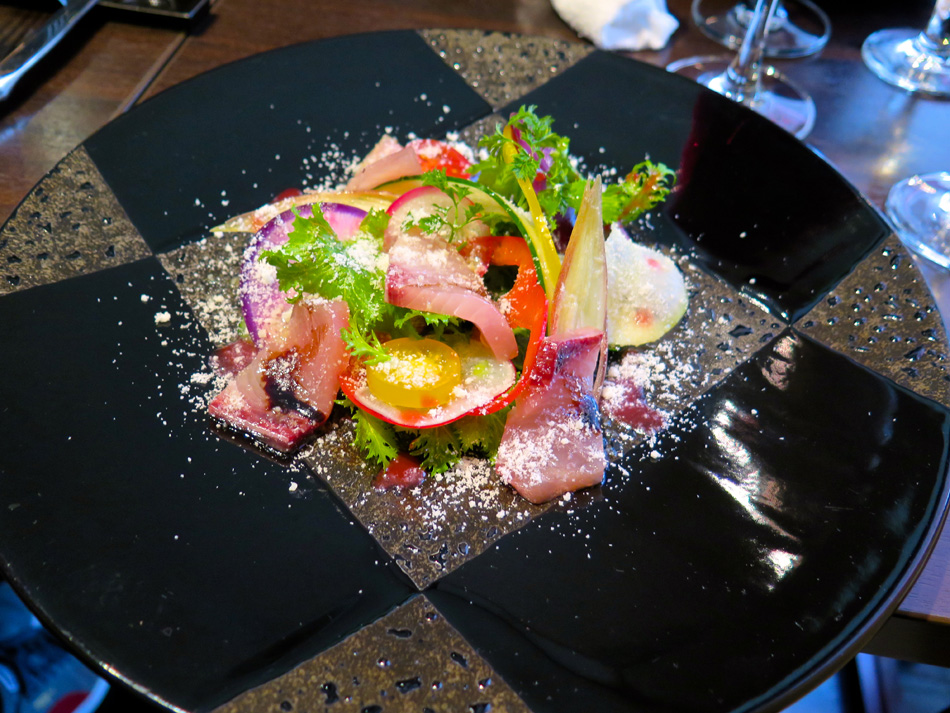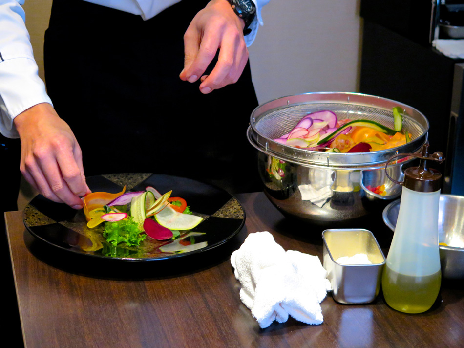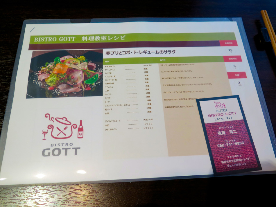 今日はその初日。会場の店を訪ねた。いつもギリギリ男が 20分前には現着一番乗り! 遠足の日の小学生だね・・。 講師は後藤周二オーナーシェフ、爽やかな笑顔の好青年。 緊張することなくすんなり雰囲気に馴染めた。 今日の食材 今日の料理は二品。手作りのレシピが嬉しい。 写真の品と『豚肩ロースのハニーマスタード焼き』 サラダの盛りつけ。ニンジン・キュウリを縦長にスライス することに新鮮な驚き、そして盛りつけの美しさで納得。 『寒ブリとコポ・ド・レギュームのサラダ』できあがり。 ちょっとした芸術作品! マジックだね! メインの『豚肩ロースのハニーマスタード焼き』 実際に調理を体験するものと思っていたが、TV料理番組 の現場に居合わせる感じ。シェフが調理するのを見ながら、 説明を聞き、質問する形式。 レシピ一杯にビッシリ書き込んだメモを考えると、実習形 式よりも実際的・現実的かも知れない。学生時代同様復習が 重要ということか? これが苦手なんだよね〜〜。(汗) デモの後はワインを味わいながらのランチタイム! 受講者は6名、4名が女性! 女性苦手人には男性受講者 が一人でなくホッ!? 予定時間を超過して美味しく楽しい 時が過ぎた。