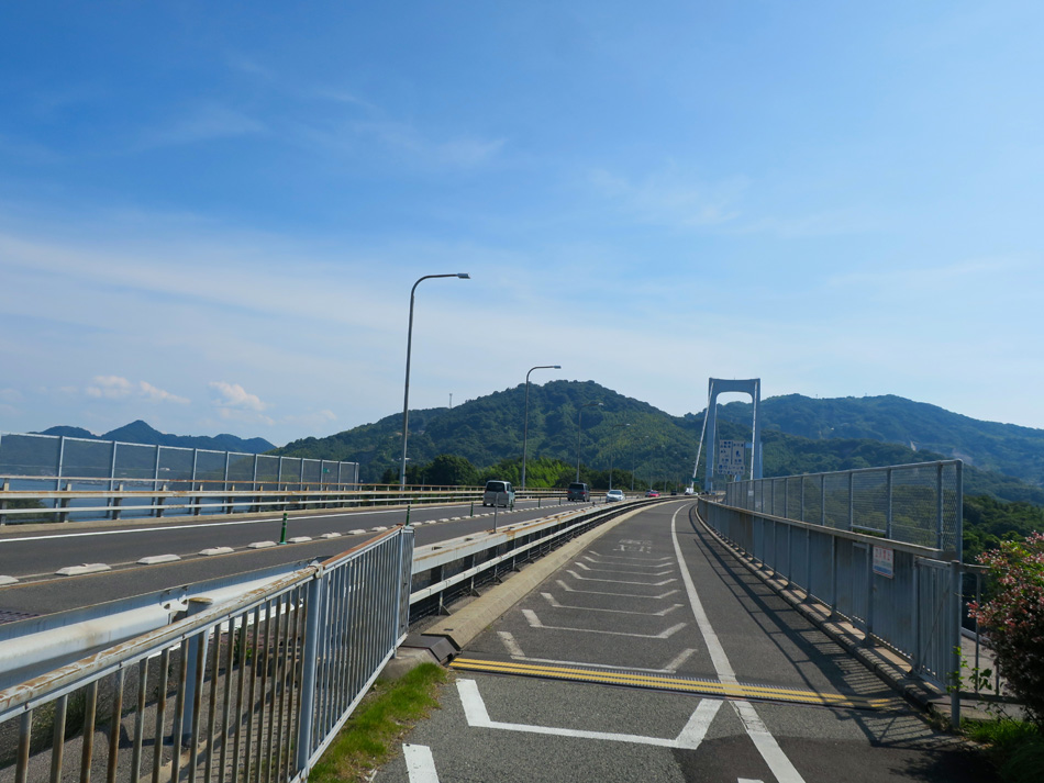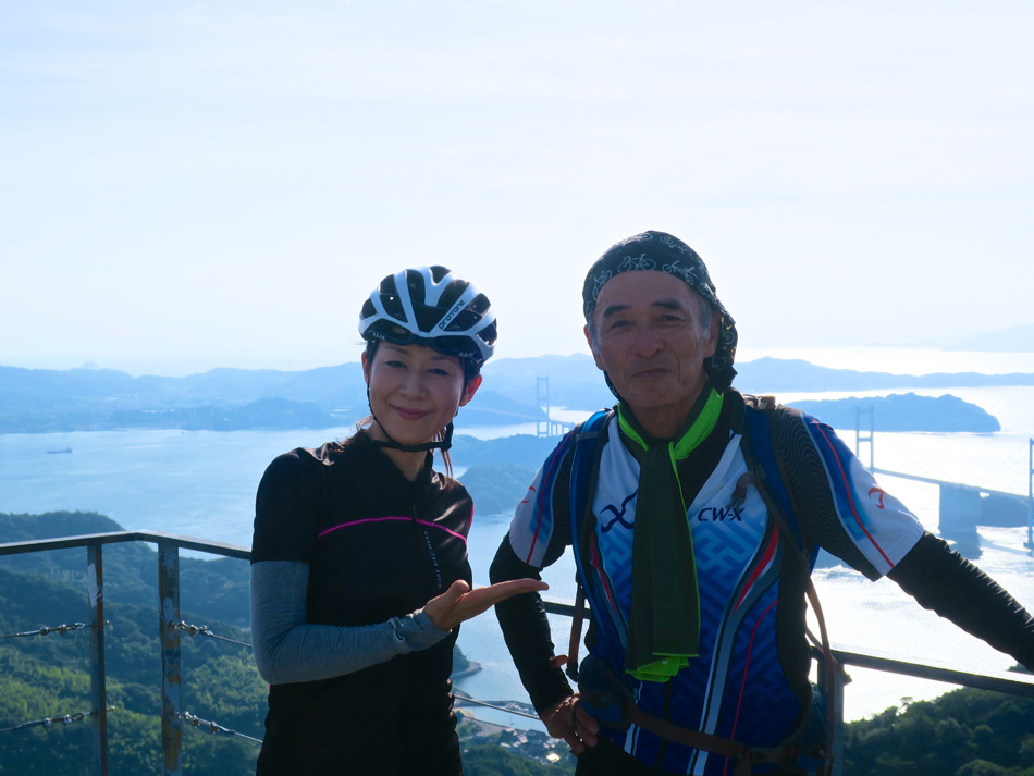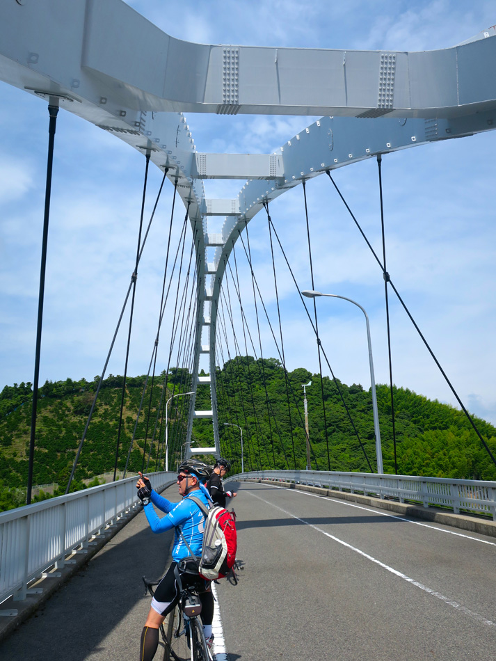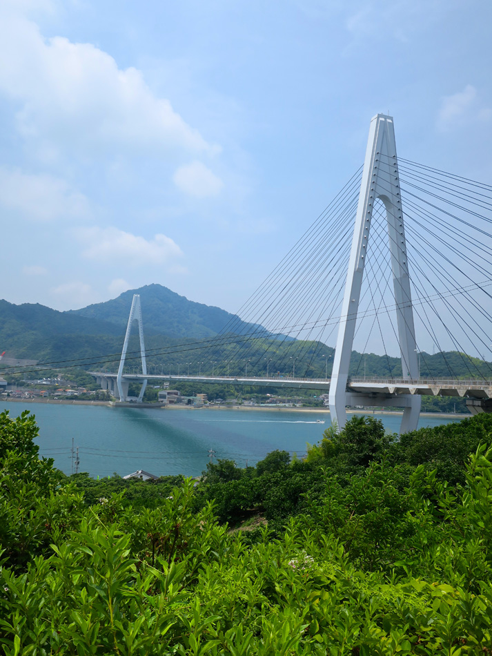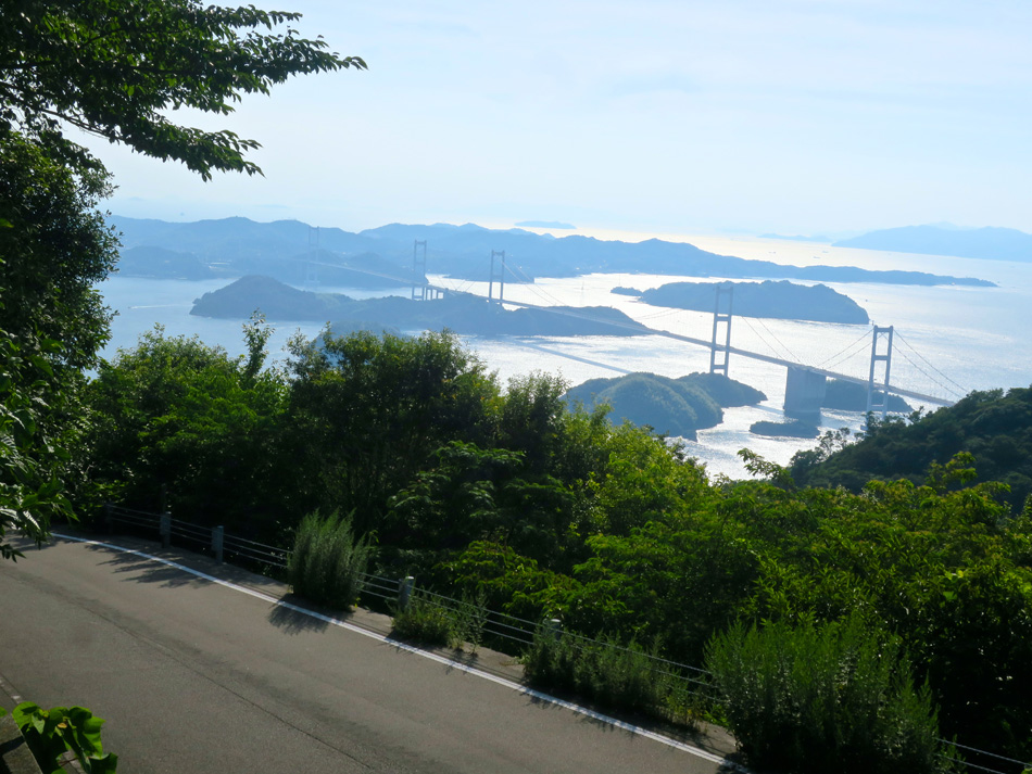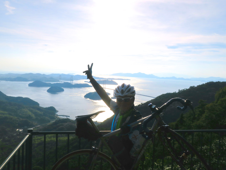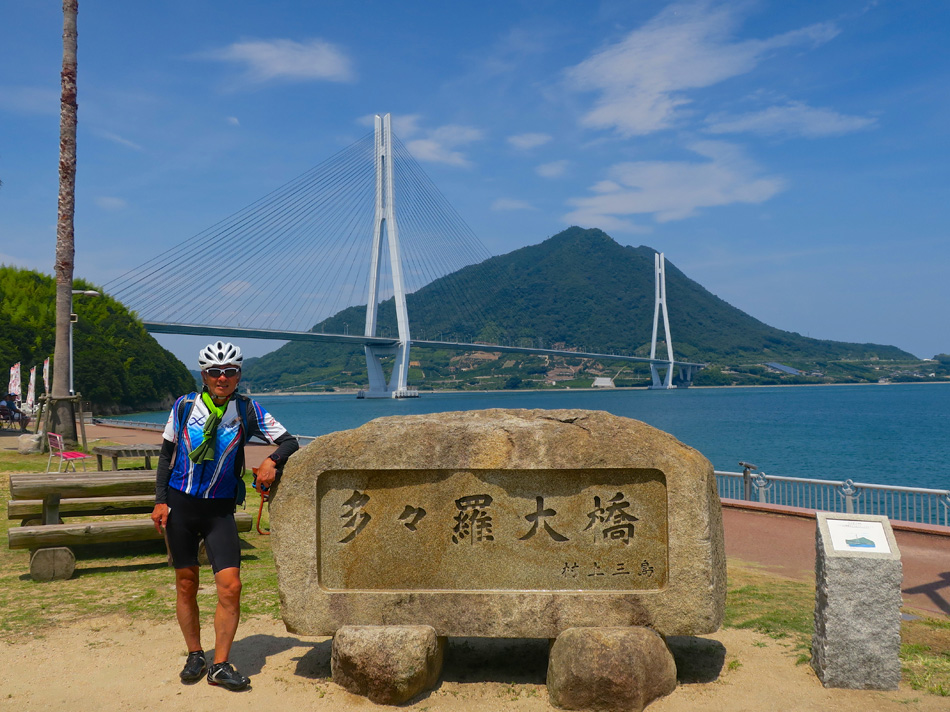 朝6時、スマイリー、グレッグ、uruman三氏にCycle 86 の4人が博多駅集合。 今日は超お久〜、しまなみ海道・とびしま海道ツアー敢行 の日! maple氏が朝倉豪雨災害対応で急遽不参加となった のは残念だが、復興のため頑張って下さい! 博多駅を発つや心は学生時代にタイムスリップ。楽しい旅 の予感に心が弾み、話が弾んだ。 9時前新尾道到着、渡船で尾道を後に向島へ渡る。 向島では、先ずはグレッグさんお薦め『住田パン』で小腹 を満たした。列車疲れ?で3個も食べた。ネジぱんは腰があ り絶妙の美味しさ。 さて、いよいよツーリングスタート! 今回が最後のしまなみ自転車旅行かも知れない。そんな思 いで風景をしっかり目と心に刻みながら走った。 先ずは向島と因島を結ぶ因島大橋。二層構造の橋で車道の 下を走る。この橋はいつも旅への期待を膨らませてくれる。 そして、因島と生口島に架かる生口大橋。 これは一つの芸術作品! 次に生口大橋に似た多々羅大橋が生口島と大三島を結ぶ。 橋の大三島側にあるのが道の駅『多々羅しまなみ公園」こ れは忘れられない場所だ。 12年前の福岡西方沖地震。『家の屋根が壊れた!』との 娘からの衝撃メールを受信したのがここ。今回は食事をした だけだが、その味は超塩辛かった。サイクリストの塩分補給 を考えた、、にしても酷い・・。ここはどうも鬼門だ。 次は大三島・伯方島間のアーチ橋・大三島橋。 機能的な力強い美しさを感じる橋だ。吊り橋の多い中いぶ し銀的存在。見てほっとする橋。 主役登場前の最後を飾るのは伯方・大島大橋である。伯方 橋は一番地味な桁橋、大島大橋は吊り橋で両者は一体になっ ている。写真手前が伯方橋。奥が大島大橋。 伯方橋、山椒は小粒でも、、、見晴らす景色は負けない! そして、大島側から見た大島大橋。 さて、いよいよ真打ち登場! 真打ちに出会うにはそれなりの儀式が求められる。儀式は 時にそれ自体が真打ちとなる。今回がまさにそれだった! 『亀老山展望公園』への挑戦。猛暑と激坂との闘い。鍋ヶ 滝ツアーの辛さを凌ぐ試錬。何度足を着こうとしたことか! しか〜し、激坂を乗り切った先に報酬あり! ご覧あれ! 眼下に望む来島海峡大橋! 更に、汗ダ〜クダクのヘ〜ロヘロの体に鞭打って頂上への 階段を上ると、そこは報酬の宝庫!? 大橋の6つの主塔が一望できる。 そして、魅力的美女との出会い! 心もメ〜ロメロ! 堤里砂さん、uruman情報では愛知で人気のアナウンサー だそう。辛い激坂も疲れも吹き飛んだ! なおか〜つ、自転車自走で上った実力派サイクリスト! 天は二物を与えず? いえいえ、二物も三物も与えます! ますますのご活躍をお祈りいたします。 魅力的なのは景色もまた然り。今治方向の眺め。 限りなく続く瀬戸内の海原 しまなみ海道来し方の眺望 来た、見た、勝った! 来島海峡大橋を渡る途中、一枚の写真も撮らなかったのは 今回が初めてだろう。それほどに強烈な印象を与えてくれた 亀老山であった!