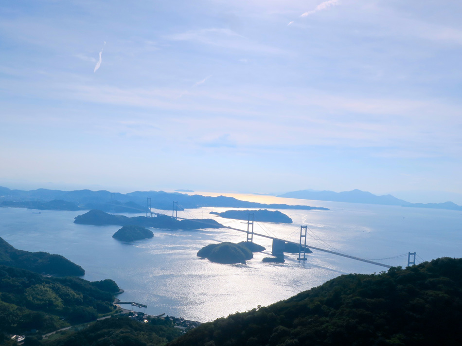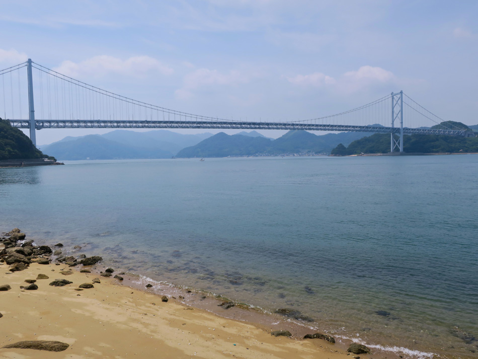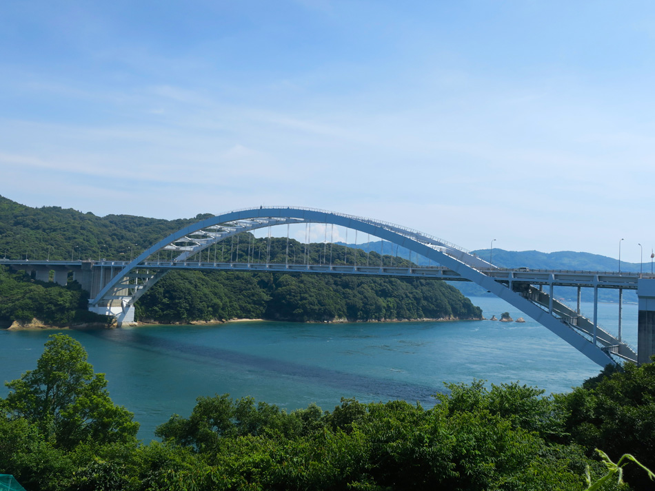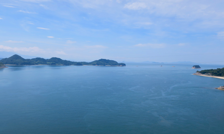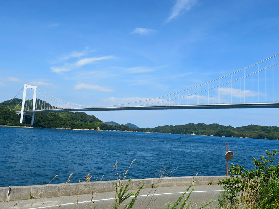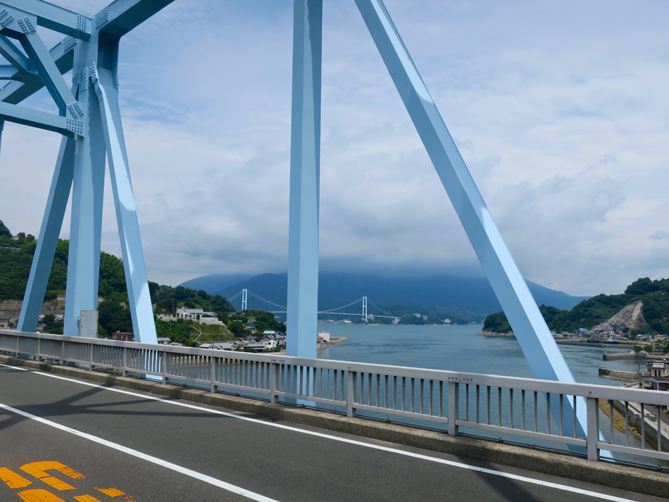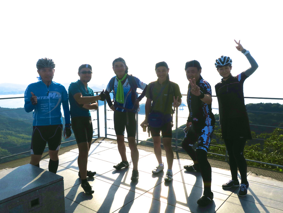 朝6時、スマイリー、グレッグ、uruman三氏にCycle 86 の4人が博多駅集合。 今日は超お久〜、しまなみ海道・とびしま海道ツアー敢行 の日! maple氏が朝倉豪雨災害対応で急遽不参加となった のは残念だが、復興のため頑張って下さい! 博多駅を発つや心は学生時代にタイムスリップ。楽しい旅 の予感に心が弾み、話が弾んだ。 9時前新尾道到着、渡船で尾道を後に向島へ渡る。 向島では、先ずはグレッグさんお薦め『住田パン』で小腹 を満たした。列車疲れ?で3個も食べた。ネジぱんは腰があ り絶妙の美味しさ。 さて、いよいよツーリングスタート! 今回が最後のしまなみ自転車旅行かも知れない。そんな思 いで風景をしっかり目と心に刻みながら走った。 先ずは向島と因島を結ぶ因島大橋。二層構造の橋で車道の 下を走る。この橋はいつも旅への期待を膨らませてくれる。 そして、因島と生口島に架かる生口大橋。 これは一つの芸術作品! 次に生口大橋に似た多々羅大橋が生口島と大三島を結ぶ。 橋の大三島側にあるのが道の駅『多々羅しまなみ公園」こ れは忘れられない場所だ。 12年前の福岡西方沖地震。『家の屋根が壊れた!』との 娘からの衝撃メールを受信したのがここ。今回は食事をした だけだが、その味は超塩辛かった。サイクリストの塩分補給 を考えた、、にしても酷い・・。ここはどうも鬼門だ。 次は大三島・伯方島間のアーチ橋・大三島橋。 機能的な力強い美しさを感じる橋だ。吊り橋の多い中いぶ し銀的存在。見てほっとする橋。 主役登場前の最後を飾るのは伯方・大島大橋である。伯方 橋は一番地味な桁橋、大島大橋は吊り橋で両者は一体になっ ている。写真手前が伯方橋。奥が大島大橋。 伯方橋、山椒は小粒でも、、、見晴らす景色は負けない! そして、大島側から見た大島大橋。 さて、いよいよ真打ち登場! 真打ちに出会うにはそれなりの儀式が求められる。儀式は 時にそれ自体が真打ちとなる。今回がまさにそれだった! 『亀老山展望公園』への挑戦。猛暑と激坂との闘い。鍋ヶ 滝ツアーの辛さを凌ぐ試錬。何度足を着こうとしたことか! しか〜し、激坂を乗り切った先に報酬あり! ご覧あれ! 眼下に望む来島海峡大橋! 更に、汗ダ〜クダクのヘ〜ロヘロの体に鞭打って頂上への 階段を上ると、そこは報酬の宝庫!? 大橋の6つの主塔が一望できる。 そして、魅力的美女との出会い! 心もメ〜ロメロ! 堤里砂さん、uruman情報では愛知で人気のアナウンサー だそう。辛い激坂も疲れも吹き飛んだ! なおか〜つ、自転車自走で上った実力派サイクリスト! 天は二物を与えず? いえいえ、二物も三物も与えます! ますますのご活躍をお祈りいたします。 魅力的なのは景色もまた然り。今治方向の眺め。 限りなく続く瀬戸内の海原 しまなみ海道来し方の眺望 来た、見た、勝った! 来島海峡大橋を渡る途中、一枚の写真も撮らなかったのは 今回が初めてだろう。それほどに強烈な印象を与えてくれた 亀老山であった!