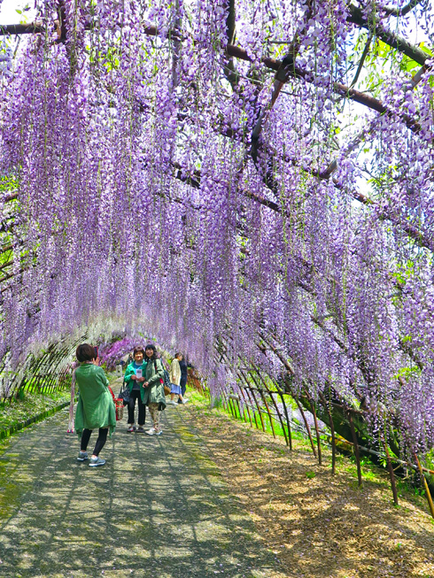 畑隧道まで長い上りが続く。他メンバーがシッティグで走る 中、6〜7割をダンシングで食らいついた。そして、『やっ たぜ!』のポーズ。 八木山峠、そしてこの畑隧道に至る上りは辛かった・・。 『藤 三巡り』と言うより『富士山巡り』をした気分。 しかし、辛さの報酬は快適な下り坂。畑隧道から河内貯水 池まで全員風を切り裂いて下った! 河内貯水池に架かる橋 のスマートなフォルムに目を引かれた。 そして、遂に河内藤園到着! 藤園は多くの観光客で溢れ ていた。そこには団体のアジア系外国人と思われる姿が沢山 あった。声を聞かないと日本人と区別が付かない・・。 さて、藤園に一歩足を踏み入れると鮮やかな色彩の別世界 の風景が待っていた。 いろいろな花色の藤に目を奪われるが、絡み合う蔓の織り なす造形の美にも圧倒される。その迫力には一種の不気味さ すら感じる。 今日の苦楽を共にしたメンバー大集結! Picco さん、撮 影有り難うございました! 早い朝食で空腹を抱えていた我等、ひろさんの案内で八幡 チャンポンを食べ人心地付きました。満腹になり余裕をかま すメンバー! ゴールに到着後の行動でその人物が見える? グレッグさん、自走(自転車)で門司港の実家へ・・! スマイリーさん、Piccoさん、自走で福岡へ! ひろさん、福岡自走組を宗像までお見送り!! 皆さんお気をつけて! 今日は有り難うございました。 私? 八幡駅からurumanさんとJR輪行帰宅・・。 urumanさんノンアル飲料、私ビール3缶・・。しか〜し、 長距離走行後の車内宴会、一度味を占めると止められないん だな〜! 本日の走行距離94㎞。楽しいツアーであった!
