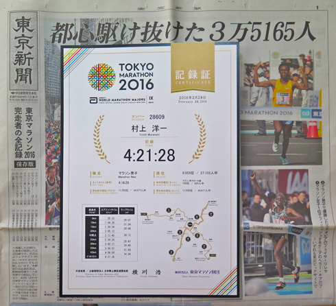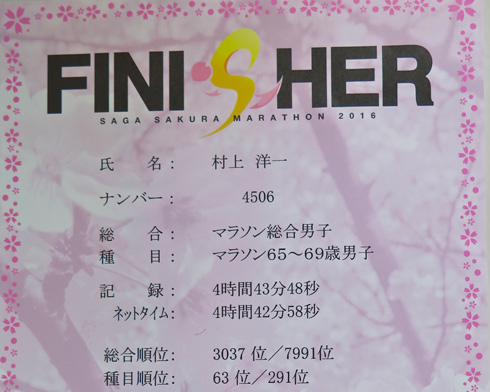 しいでしょうね。 待ちに待った東京マラソン記録証がやっと届いた! 正式の記録、速報値より良くなるなんてことは当然期待し てない! しか〜し、なんだろねこの違い! わずか1秒だがネット タイムが悪くなってる・・。気分は、、、、、悪い! グロスタイム4時間21分28秒 ネットタイム4時間16分28秒 4月3日のさが桜マラソンでフルマラソン出場は15回に なる。この際これまでの記録を公開する。 ハーフマラソン 平成20('08)年11月 2日 シティマラソン福岡2008 (完走) 2時間14分33秒 2時間10分20秒 平成22('10)年10月31日 シティマラソン福岡2010 (完走) 2時間08分51秒 2時間04分22秒 平成23('11)年10月23日 シティマラソン福岡2011 (完走) 2時間07分36秒 2時間03分56秒 平成27('15)年03月22日 (自己ベスト) 小郡ロードレース大会2015 (完走) 1時間54分48秒 フルマラソン ・平成23('11)年11月 6日 下関海響マラソン2011 (完走) 5時間04分02秒 5時間01分51秒 ・平成24('12)年 2月26日 2012そうじゃ吉備路マラソン (完走) 4時間35分56秒 ・平成24('12)年11月 4日 下関海響マラソン2012 (完走) 4時間49分14秒 4時間45分58秒 ・平成25('13)年 2月24日 そうじゃ吉備路マラソン (完走) 4時間34分06秒 ・平成25('13)年 4月 7日 さが桜マラソン2013 (完走) 4時間21分23秒 4時間16分46秒 ・平成26('14)年 2月16日 高知龍馬マラソン2014 (完走) 4時間21分28秒 4時間20分22秒 ・平成26('14)年 4月 6日 (自己ベスト) さが桜マラソン2014 (完走) 4時間00分49秒 4時間00分04秒 ・平成26('14)年11月 9日 福岡マラソン2014 (完走) 4時間10分22秒 4時間09分18秒 ・平成27('15)年 2月22日 2015そうじゃ吉備路マラソン (完走) 4時間11分21秒 ・平成27('15)年 4月 5日 さが桜マラソン2015 (完歩) 5時間31分01秒 5時間28分35秒 ・平成27('15)年 7月 5日 ゴールド コースト エアポート マラソン2015(完歩) 4時間52分03秒 4時間50分08秒 ・平成27('15)年 4月 5日 第28回出水ツルマラソン大会 (完歩) 4時間48分12秒 ・平成27('15)年11月 8日 福岡マラソン2015 (完歩) 4時間40分46秒 4時間39分47秒 ・平成28('16)年 2月28日 東京マラソン2016 (完走) 4時間21分28秒 4時間16分28秒 完走:給水・トイレ以外は走ってゴール 完歩:給水・トイレ以外で歩いてゴール