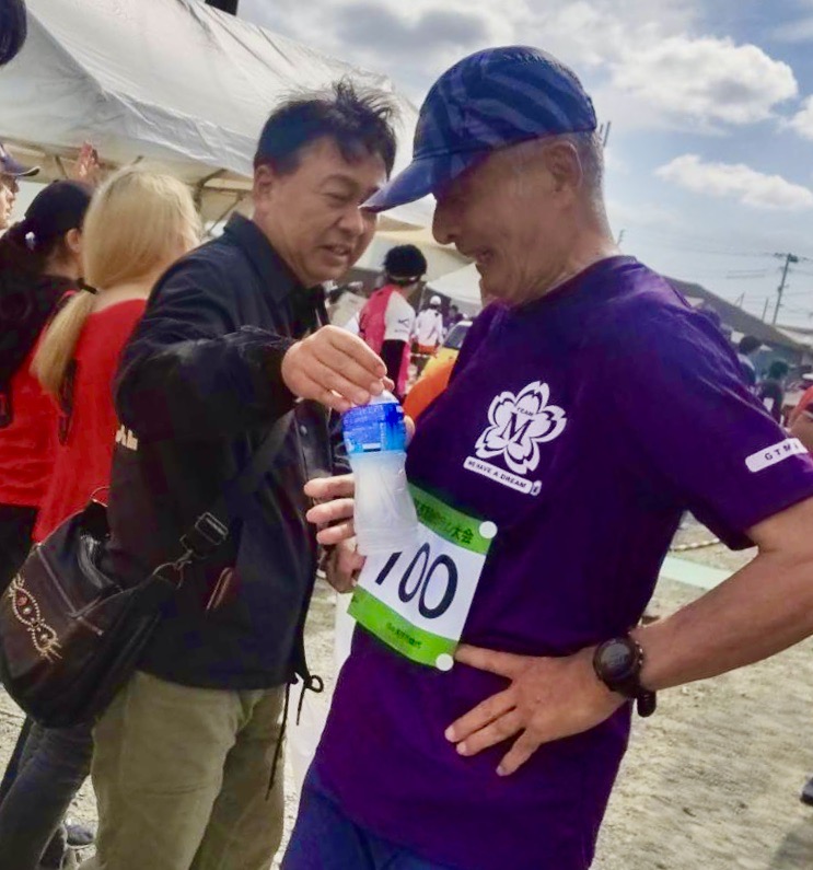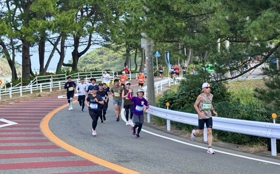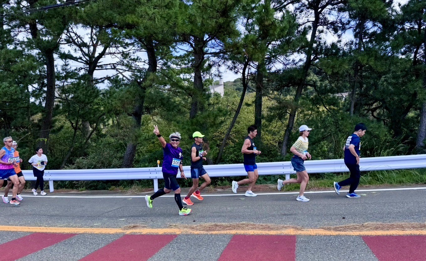 今日10月20日金印マラソンの日、岡君・宮﨑君に迎えてもらい志賀島へ向かった。出発時まずまずの好天だったが、志賀島に近付くにつれてどんより暗くなり、強風が吹き付け、今にも雨が降りそうな様相。スタート地点近い湾外は大荒れ、波の飛沫に包まれ霞んでいる。 待機中の2時間、油断すると物は吹き飛ばされ、寒さに震えた。 しか〜し、天は我らに味方した。 スタート間近、風は相変わらずだったが、青空が広がり陽射しには温かさも感じた! ス タ ー ー ト ! そして5km付近コース一番の顔晴り所、先ずは何川君 次は岡君、余裕の表情! そして、3番手宮﨑君! この後、亀ラマンが昼寝から目覚めると・・。(苦笑) 今回写真が充実してるのは松尾君の声援・撮影のおかげだ。本当に力を貰いました。ありがとう! ゴールでは茂刈君がドリンクを手に迎えてくれた。感激〜! 一枚の紙のため全力出し切った4人! 志賀島金印マラソン:1:12:51 10km おっと、岡君には今回もとんでもない手間をかけました。反省! さぁ、次は福岡マラソン2024、現状では完走は限りなく厳しいが、TEAM・Mの同走メンバーと応援を力に変えてゴールを目指したい。 顔 晴 ろ 〜 〜 っ ! |