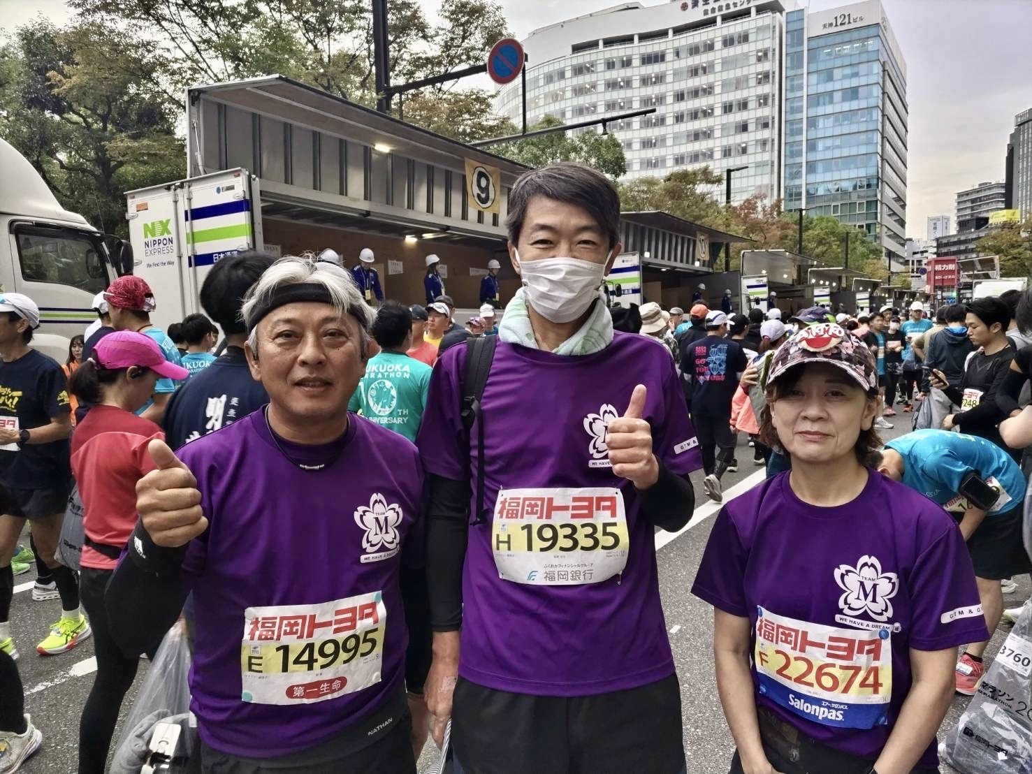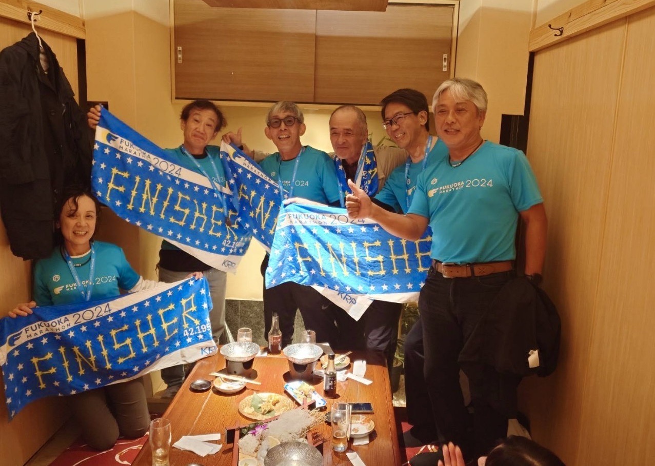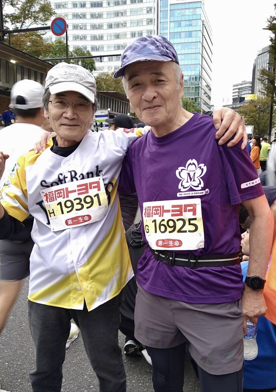 11月10日日曜日、遂に福岡マラソン本番当日! 3時半過ぎ起床、早めに朝食をとり、天神へ出かける。Team・M発足以来初めての椿事、集合写真に間に合った。笑顔を作ってるが不安一杯。足腰に痛み・強張りを抱えたまま今日を迎えた・・。(涙) 同走は、武蔵台3期生何川君、西浦君、岡君、宮﨑さん。 そして、山﨑君も一緒。大のホークスファンで、インプラント治療の名医、共にマラソン・登山を楽しむ仲だ。 おっと、も一人、チーム新メンバー武蔵台5期鳥原君。あし、脚が長〜い、ドーピングはダメよ!(笑) 8時20分、スタ〜〜ト! 岡君デザインのTシャツ効果でメンバーが目立つ。スタート時のTV画面でもしっかり確認できる! ランナー1万数千人、都心を埋め尽くす大観衆。そんな中を走ると弥が上にも気分も昂まる。しかし、高揚感は長く続かない。天神を離れるにつれ自分の心との闘いになる。ランナーに抜かれるばかり、抜くことはない。精一杯走るのだがペースは上がらない・・。 スタート時点から『棄権』が心の片隅にあったが、10kmを過ぎ15kmを過ぎると頻りに頭を擡げる。うるさい奴め! しか〜し、A friend in needでござるよ。どうしよう、どうしようで頭が一杯に成りつつあったその時、友の姿が目に飛び込んだ!! 顔が綻びま〜す、疲れを忘れてしまうよな〜! 『羽田野君、平尾君、ありがとう!』確かに元気を受け取りました! 誓ってご両人には足を向けて寝ません。尻を向けて寝ないかどうかは尻ませんが・・。(笑) 力が蘇った思いの17km付近の応援だった。 しか〜し、20〜21kmの九大付近の上り下りを過ぎた頃、気持ちが途切れ修復が利かなくなった。25km手前までが続けるか棄権かの危険区間だった。30km過ぎると完全に開き直り。他メンバーを待たせてしまうが、歩こうが這おうがゴールまで頑張る! 何度も脚が攣りそうになり、遂には雨にも降られたが、弱い自分を励ましゴールまで粘り抜いた。 『やったぜ〜ぃ!』 感動のゴールの顔! 福岡マラソン2024:9:12 42km 完走証明書の記録: グロス 6:35:45 ネット 6:26:57 糸島〜福岡市内の帰路の待ち時間も重労働的第二のマラソン・・。 止めのボディーブローだったが、出場メンバー、応援メンバー都合14〜15人が参集しての慰労会になった。次の写真は出走メンバー。 参加メンバーの集合写真なく一次会の他の写真は割愛した。次は二次会参加者の写真。 コース各所で応援してくれたメンバー・友人、同走のメンバーは元より、声援くださった沿道の皆様、大会関係者に心より御礼申し上げます。 来年は最低1時間の時短したいね。