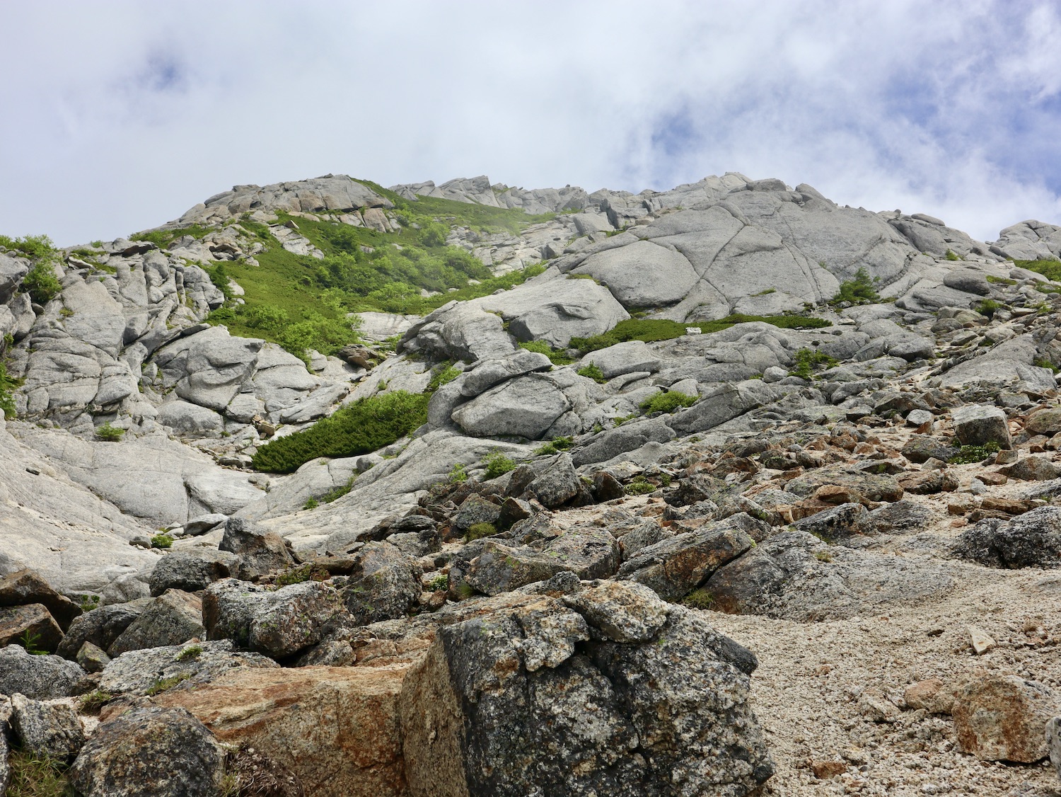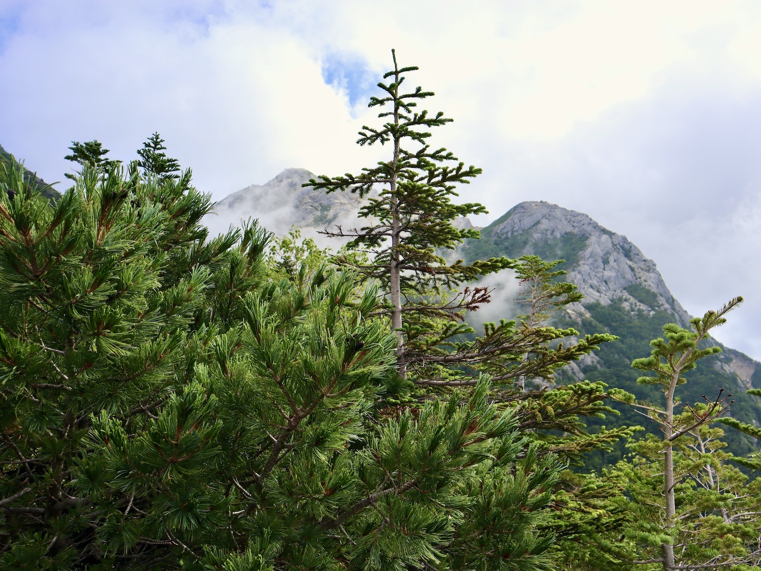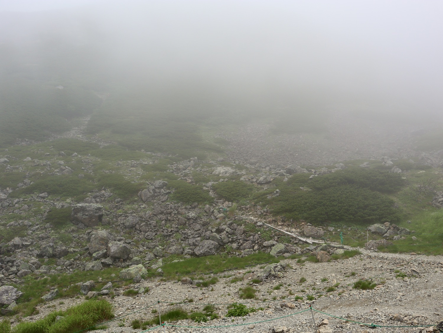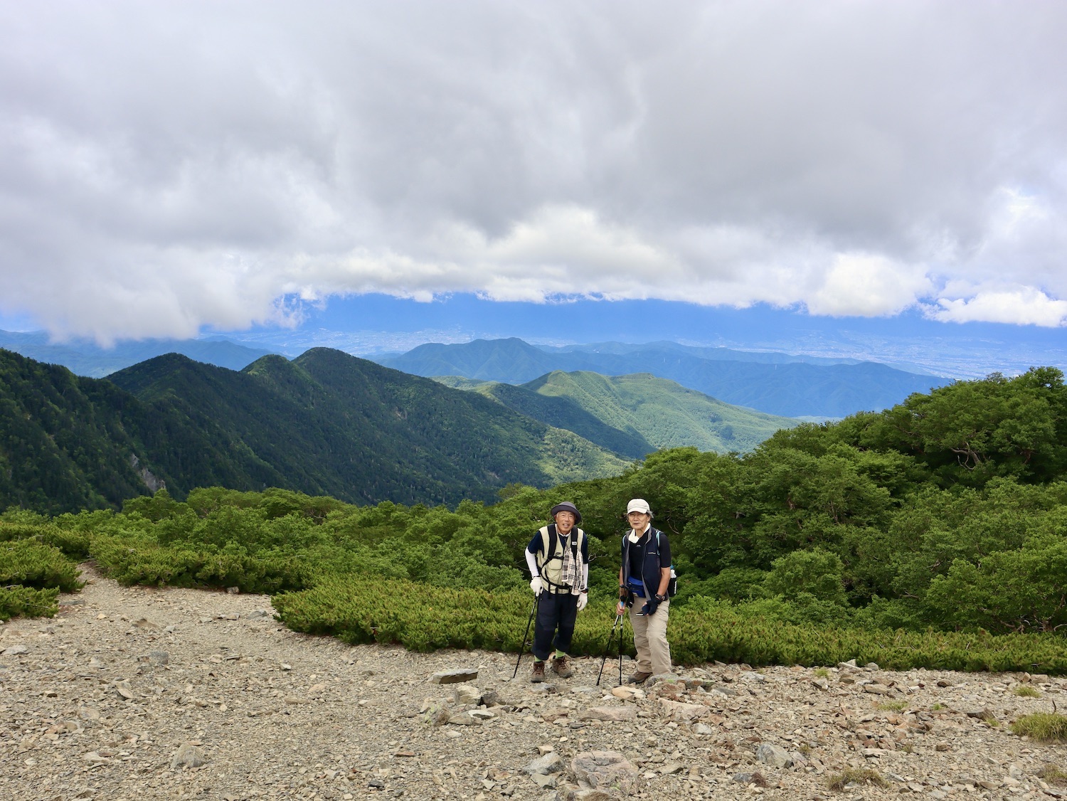 前日令和6年7月29日、山小屋「こもれび山荘」スタッフより『明日は昼前から天気が崩れ昼過ぎ雨になるが、明後日31日は好天の予報です』と報告があった。同行の園田君山﨑君と相談し、メインの甲斐駒ヶ岳登山を31日に回し、今日30日は仙丈ヶ岳登山実施に予定変更した。 山荘は標高2000mで高い山に囲まれ、スマホは使えないしテレビ・新聞もなく、スタッフの情報だけが頼りである。 好天下の活動時間を長くしようと、朝食時間を4:30に早め、弁当を受け取って、5:15山荘を出発した。 山荘周辺の、白っぽい木肌の高木が天を突いて伸びる様に威厳と安らぎを感じたが、登山路に入っても同じだ。 時折樹間から覗く遠い山並みにも元気を貰う。 7:00前、五合目藪沢大滝の頭(2519m)到着。ここから直登し小仙丈ヶ岳をめざすルートを取る。 更に進むこと20分、木々が低くなり背後に鋸岳(2685m)の山並みが見える。そして多分、右手雲の中には木曽駒ヶ岳。 登ること更に5〜6分、刻々と変わる雲の動きが気になる。 と、急速にガスが広がり始め、瞬く間にガスに包まれ強風に見舞われた。山荘に戻ることも考えたが、取り敢えず休憩・補給して様子を見ることにした。 雨は降らず、時折ガスが薄らぐのを幸い、小仙丈ヶ岳(2864m)だけでも登ろうと決し登頂を再開した。 出発から3時間、8:20小仙丈ヶ岳撃破! 園田君、山﨑君の勇姿もガスに霞む。 ガス酷く強風吹く中だが、同じルートを引き返すのも能がないと、仙丈小屋・馬の背ヒュッテ経由で山荘に戻ることにした。山頂を後にする園田・山﨑両君の姿が見る見るガスに溶け込む。 仙丈ヶ岳へ連なる尾根沿いに歩いて、9時過ぎ仙丈小屋との分岐に到着。依然ガス・風が酷く眺望も期待できない。後ろ髪を引かれる思いで仙丈ヶ岳(3032m)登頂断念、仙丈小屋へ向かう・・。 10:00前、仙丈小屋に到着。来し方はガスの中。 ものの10分も経たずにガスが晴れる! 山小屋の厚意で弁当を持ち込んで昼食にした。熱いコーヒーをいただき20分ほど休憩して小屋を出ると仙丈ヶ岳がきれいに見える。 記念に写真を撮り10:00過ぎ仙丈小屋を発った。 10分ほどして振り返ると左に仙丈ヶ岳、右に大仙丈ヶ岳(2975m)、間に仙丈小屋が見える。 西に目を転じると遠く市街地が見える。 雲に隠れてるのは中央アルプスか? 更に40分ほど歩き馬の背へ向かう途中、小仙丈ヶ岳と仙丈ヶ岳を写真1枚に収めた。驚いたことに写真を拡大すると、右端近く仙丈小屋が写っている! デジタルカメラの凄さ? このゆったりした山容ゆえに仙丈ヶ岳は「南アルプスの女王」と呼ばれるらしい。因みに、明日登る甲斐駒ヶ岳は存在感と威圧感の大きさゆえに「山の団十郎」と言われるそうだ。 「馬の背」へ行く目的はお花畑だった。しかし、天気の心配もありここで中断、「馬の背ヒュッテ」へ急ぐことにした。 しか〜し、女王のお花畑は人に優しい。 馬の背ヒュッテへの登山道沿いこそお花畑! 上の黄色い花はマルバダケブギ。 次は有名なトリカブト、見る分には問題なし。 戸台川に連なる流れの傍にはクルマユリの花。 藪沢の流れ沿いをこもれび山荘へ下山開始して間もなく、12:30頃だったろうか、雨脚が一気に強くなり土砂降り状態・・。写真を撮るどころじゃない。 山荘に戻って登山リュックを改めると、中身はまさに水浸し状態。夕食時の明日は好天の言葉が今は救いだ。 途中、雨は収まり最後の山荘への道を歩く。この静寂にして幽玄な雰囲気がとても気に入った。3時前無事山荘に帰着。足の疲れがやや不安だが、ガスあり強風あり本降りの雨あり、勿論絶景あり。苦っ楽しい一日に乾杯〜!! (第1日 完) 『待った〜! タイトルの女神って何じゃい』 これは失礼。今日私は南アルプスの女王に会い、女神に出会った。女王については既に語った。女神について一言。 下りの終点の大平小屋前で休憩していると下山して来た女性が『このサックみなさんのじゃありませんか』 我が雨具サック・・。雨の降り始め、直ぐ使えるよう装着したのを落としたらしい。土砂降りの中、拾ってずっと持って来てくれたのだ! 『なかなかできることじゃないね』と友の言葉 『いや〜、彼女は俺の女神だよ』と私。 女王が見せてくれたさまざまな景色に劣らぬ感動を受け、穏やかで豊かな気持ちになった。『ありがとうございました』お礼は言ったが名前さえ聞いてない。改めてお礼を言えなかったのが心残りだ。