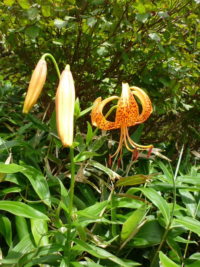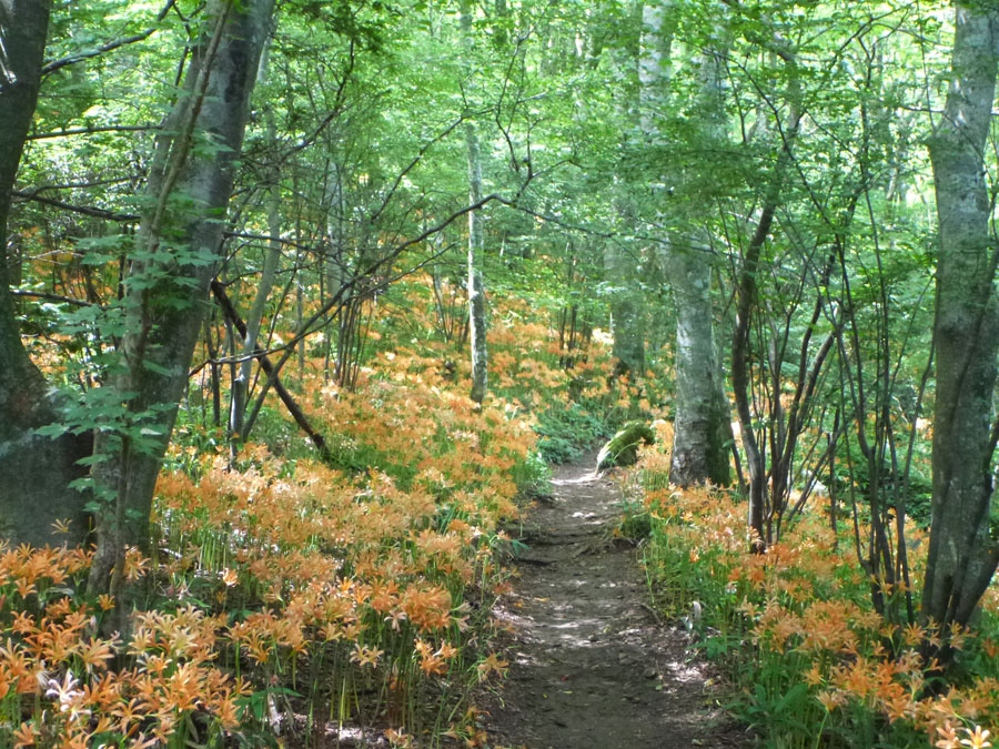 な筈ありません。もう一つの見所、キツネノカミソリの大群生です。彼岸花科の植物であるのは直感的に分かります。それにしても歩けど歩けど続きます。yamamenさんも感動を抑えきれない様子。『すっごいですね』の連発です。 ここで、今回登山中に見た花々をご紹介。また、できれば名前を教えて下さ〜い。 膝に徐々に痛みを感じながらも、次なるアンノ滝を目指して再び登り、そして下りの辛さに耐えます。しか〜〜し、ここで万能野外活動家yamamenさんの本領発揮です。私の疲れた様子を哀れんだか、目敏く源流を見つけ沢に下ります。手際よく、鍋やコンロを取り出し源流水で素麺をゆでます。そして岩の間から流れ出す冷たい源流水で締める。それを特製めんつゆで頂きます!シコシコの麺、美味さが喉を通り体中に広がります。く〜〜〜っ!最高の贅沢!!そして究極の源流コーヒー!yamamenさん、ご馳走様でした。重い荷物を一人で持って、、、唯々感謝です。 すっかり生き返り、膝の痛みもものかは最後のスポット、アンノ滝へ歩を進めます。 これまた感動ものでした。滝の周辺のひんやりとした冷気を楽しみ、子供に返って落ちてくる水しぶきを受けながら写真を撮りました。 ああ〜〜、素晴らしい自然の中で命の洗濯をさせて頂きました \(^O^)/ 歩行ルートはこちら。GPSの不具合でちょっと変ですが、、。