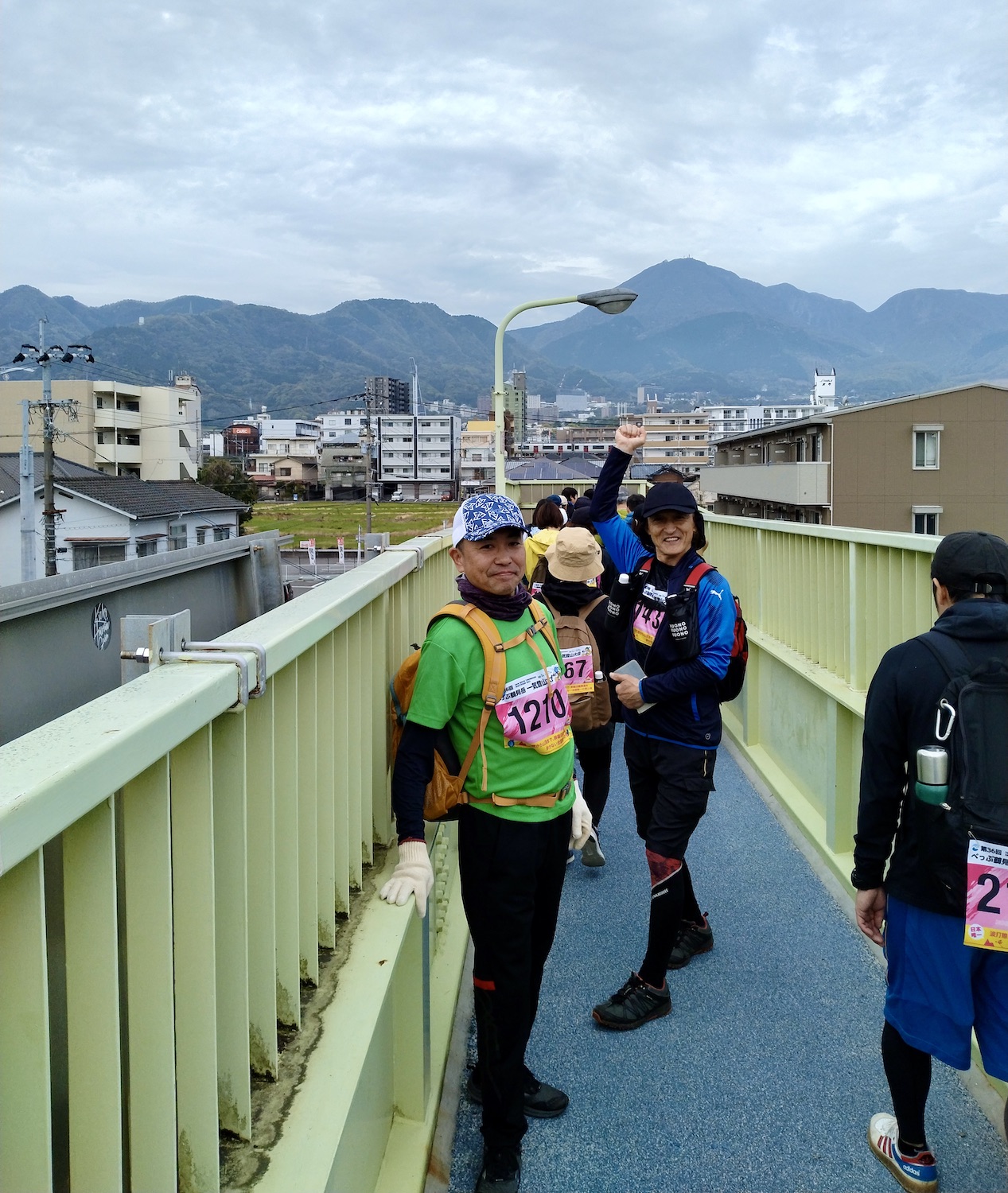 『別府の海岸から鶴見岳山頂まで登りませんか』ヒロさんからの誘いに一発即決参加決定! しか〜し、体調・足調に不安がありSOS発信、犠牲的敬老精神を発揮してくれたのは教え子の冨岡君。3人でのチャレンジになった。 海抜0mから1375mまで一気登山、冒険心をくすぐられる。正真正銘謳い文句に偽り無し。念には念を入れた証拠写真をご覧あれ! 海抜マイナス10cmからのスタート! 靴が濡れたぜ・・。 上の写真奥の山は高崎山、目指す鶴見岳は歩道橋の先。 『低い〜』ですと? 標高1375m、地図でご確認あれ! 最初の3km程は境川の河川敷。人一人通るのがやっとの所が何ヶ所もあり渋滞の連続。前半の1/3は牛歩、満開の桜が慰めだった。 河川敷を抜け、家並みを抜けると時折別府湾が姿を見せる。 やがて、爽やかな新緑の中を歩く。 晴天の暑い中、緑の木立を縫って気持ちよく歩き、11時半を回った頃ハーフコースのゴール到〜着〜! 鶴見岳ロープウェイ乗り場近い標高480〜490m、スタートから約2時間15分、走破距離約6.5km地点だ。 『後はロープウェイ終点まで登るだけ、楽勝やん!』 山頂ゴールまであと一息。いざ、ロープウェイ乗り場出・発〜! しか〜し、その意気込み、1時間とは保たなかった・・。 来し方行く末、見下ろしても見上げても、人、人、また人。 力が入らない。ともすれば足元がふらつく。登れど登れど続く激坂。只々山頂の出現を願い、裏切られ、絶望的気分・・。 ヒロさん・冨岡君の励ましがなかったら、へたり込んだに違いない。夜明けの前が一番辛い。終わりのない坂はない。その通〜〜り! 見よっ! 由布岳、国東半島、別府湾! 水平線上には四国? 感動のゴール!! ヒロさん、冨岡君、お二人のおかげでゴールできました。また面白いイベント一緒してください。楽しみにしてます! べっぷ鶴見岳一気登山:11km 4:38:55 しかし、あのゴール前は何だったんだろう! そして思い出した、北岳登山初日の出来事を。ガス欠だ〜! あの時と同じ状態だった。 今回、訳あってほぼ朝食抜き状態で登山に臨んだのだ。そして、再三補給の助言を受けたのに、見栄張って我慢してしまった・・。 最低目標の5時間内登頂は果たしたが、近々再挑戦、4時間内完走を達成するつもりだ。勿論、朝食をしっかり食べてね。(笑)
