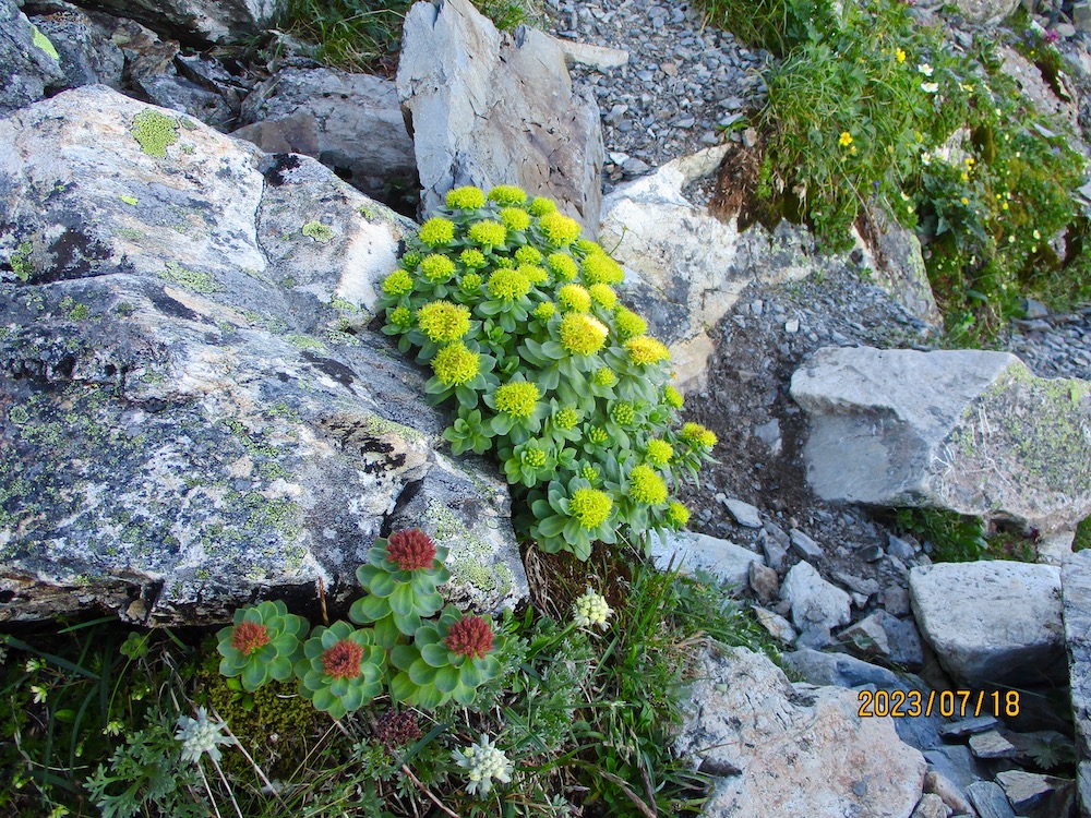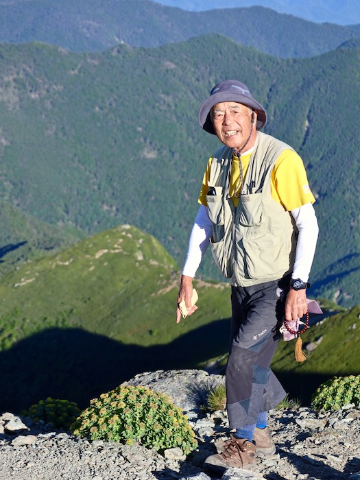 も一つおまけに、初日難儀した『草すべり』ルートを回避し、二俣経由で下山することにした。 出発直後こそガスがかかり肌寒かったが、すぐに晴天になり暑さに耐えながらの山行になった。徐々に近付く白い雪渓が癒やしの景色。 癒やしの景色だが、北岳との別れの時を感じる景色でもあった。 二俣到着、雪渓から流れてきた冷たい水で、喉を潤し帽子を濡らした。雪渓の眺めもここまで。 高山の花たちともお別れだ、今日も元気をもらったよ! そして、遂に白根御池小屋到着。時間まだ8時少々。弁当には早すぎる。今日もアイスで元気回復。余裕の最終日。 この時、下りの厳しさを間もなく思い知らされるとは夢にも思わなかった。二日間で疲労がピークに達していたのかもしれない。 しか〜し、当初予定より早い10時過ぎ全員無事下山。終わり良ければ全て良し、だよね! さらば北岳! 翌20日飛び切りのビールと運命的出会い。『青い富士山』 しか〜し、この景色がやっぱ一番だぜ! 登山二日目18日、ご来光を拝もうと4時過ぎ外へ出た。 刻々と空の表情が変わる。 富士山ともご対面! そしてご来光! 4時42分 モルゲンロート! 朝食前の贅沢! 一度は日本アルプスに登りたい。そこから霊峰富士を眺めたい。その夢は叶ったね! しか〜し、その贅沢で満腹とはしないね。昨日の轍は踏まない、朝食後弁当受け取り6時出発。今日は北岳・間ノ岳往復縦走。 疲労は残るが、40分程で北岳3193m撃破! 仙丈ヶ岳は昨日より一段低くなり、その先が見晴らせる。 甲斐駒ヶ岳も近付いた印象だね。 そして富士山! 標高が200m高くなると印象も違う。 だが、今日一番の目的は眺望ではない。 今ここにはもう2人立ってる筈、だった。脚の不調で不参加の羽田野君、それにスイスで滑落、帰らぬ人となった木内君。その木内君の御霊の安寧を祈り供養するのが大きな目的だ。 園田君が場を定め全員祈りを捧げた。 写真の木内君と四人で記念撮影。 気持ちを切り替え、7時前北岳を後にした。それにしても富士山の存在感は凄い。威圧的なところはないが、凛として気高い。 登山路脇のハイマツの根だろうか、富士に負けぬ存在感を感じた。厳しい風雪に耐えた逞しさ故か。 北岳から下り基調だが、勾配は急でガレ場も多く気が抜けない。 尚か〜つ、登山路は延々と続く。遥か下に赤く北岳山荘、そこから再び登って中央右寄り高い山辺りが間ノ岳。往復できる・・? 北岳山頂から苦闘2時間、9時前中白峰山3055m撃破! 中白峰山から望む間ノ岳(右端)意外に近い? と喜んだが、目と鼻の先の天辺に小さな人影を認め絶望・・。 険しい行く手に心が折れそうだ。 しか〜し、進むほどに遠のく間ノ岳もいよいよ近い。 中白峰山から1時間、10時過ぎ間ノ岳3190m撃破! 素晴らしい眺望が、それまでの疲れを吹っ飛ばしてくれた。 寄せ来るガスと富士に、葛飾北斎の神奈川沖浪裏が重なった。 道は更に、次の農鳥岳3025mへ続く。 しかし、我々は間ノ岳が終点、北岳の肩の小屋へ戻る。 望遠レンズのように北岳が手繰り寄せられたら良いのだが・・。 『君が行く道の長手を繰り畳ね焼き滅ぼさむ天の火もがも』 往路2時間のルートを引き返す。日差しと険しいアップダウンで体力消耗したが、今日も高山植物に力をもらった。 それにガス欠の昨日と違い復路、中白峰山で弁当を食べ、北岳山荘ではアイスで、エネルギー充填100%! しか〜し、 これが最大エネルギー源! 帰路間ノ岳を発って間もなく、雪渓に立ち寄り天国を味わった。 この至福のひととき、決して忘れない! 2時半前、無事肩の小屋帰着。 |