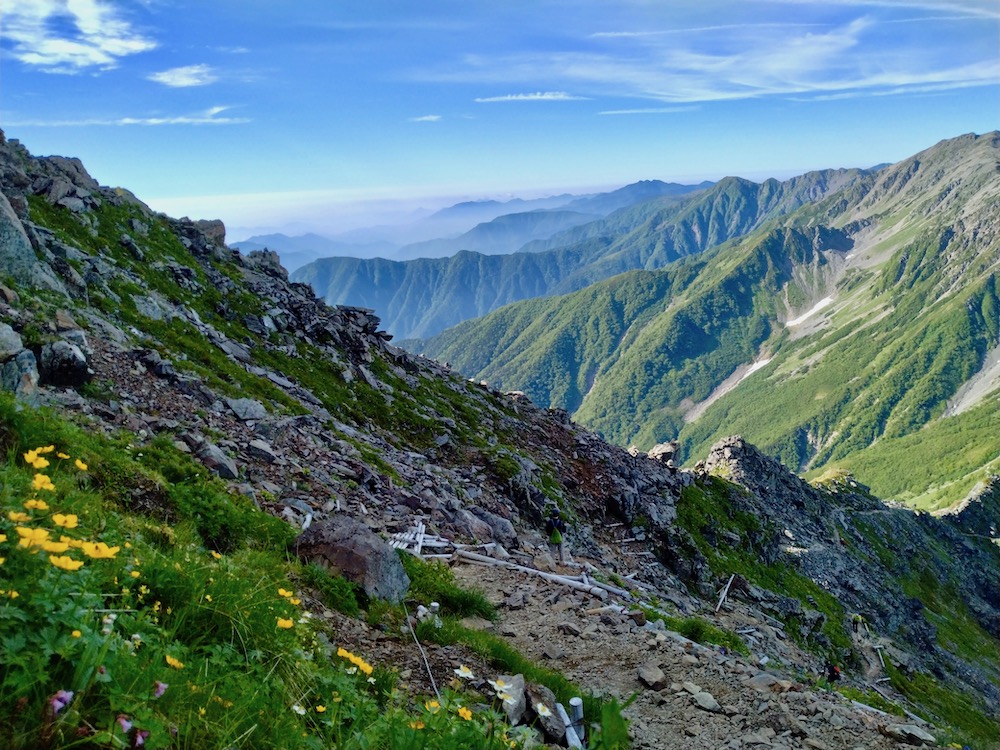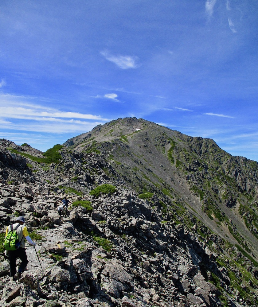 初日は1500mを直登、昨日、北岳〜間ノ岳往復で疲労は溜まってる筈だが、心配・ご・無・用。今日は下山だし、朝食を済ませ弁当もある。更に、予定を早め5時半前肩の小屋を出発した!