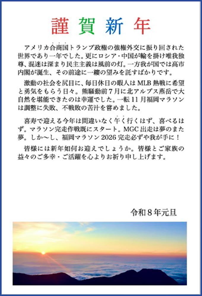 先週 1月 年間累計 ラ ン 21㎞ 30㎞ 30㎞ 先週、珍しく南公園WALK続いた。しか〜し、喜べる状況じゃない。アメリカ合商国のベネズエラ攻撃、他国がすればテロ・侵略! 強欲傲慢商人国、確かにMAGA、Make America Greedy Again、Donroe主義はDonkey主義の間違いでは? と思うは自分だけ? そのアメリカが日本・日本人を骨抜きにすべく粗製即製した憲法を、平和憲法と拝み続ける日本に未来は? 寒さ到来とともに、解散風が吹き始めた。我が思いは我が思いとして、今後の流れをしっかり見守ろう。個人的には悔いなき人生を実現すべく福岡マラソンに向け顔晴るのみ(笑) 現役時代『継続は力なり』を唱え続けた人間、一度くらい『継続は力なり』を実践・体感しなきゃ、詐欺罪で訴えられそうだ(苦笑) 登山予定と同行者募集 ①1月21日(水) 三郡縦走 中止 (悪天または積雪・降雪の場合中止) 今週のムッサン 17日(土) あいさつ活動休んで幾分熱下がってきたが、体がふわふわしてる。体力低下・・。今日明日休養で復活果たしたい。 16日(金) 完全休養。天気晴れ、心曇り・・。 15日(木) 体が火照り目覚めた。またまた熱発。 急遽あいさつ活動中止・・。 14日(水) 今日も南公園! 昨日の反省で少し早めに出動。オレンジ色の空は拝めないが、早めの空の眺めもこれはこれで良いもんだ。 体が重く感じられペース上がらなかった。 南公園WALK:6km 15:03 13日(火) 今日も南公園W出動! スタートが少し遅くなったが、おかげで素晴らしい夕焼けが楽しめた。 南公園WALK:6km 14:43 12日(月)成人の日 天気予報外れて感謝、感謝! スタート時こそ寒さ覚えるが、すぐに汗ばんでくる。階段段数一ヶ所数え直した。片道785段に訂正。今日2往復3140段、三郡縦走の脚力アップに繋がると信じ顔晴る! 南公園WALK:6km 14:30 11日(日) 今日は鹿児島『菜の花マラソン』の日。池田湖への激坂に怖気付いて未だチャレンジ経験なし・・。その菜の花マラソンにTeam Mの2人がチャレンジ・完走! 刺激受けないはずなし。今日は南公園2往復6kmじゃ〜。 南公園WALK:6km 14:56/km 確か雪予報、しか〜し期待通り外れ感謝(笑)