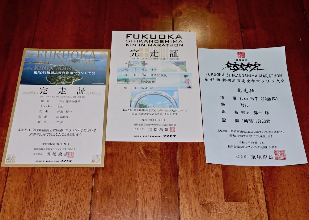 コロナ禍のため、令和元年の前回大会から3年振りの大会。参加者は1700人超。内、60歳以上は194人。 市営渡船で会場に向かったが、曇り予報に反して、恨めしい青空が広がる。 スタート前、それぞれゆとりの表情。(自分も含めて!!!) しか〜し、ピーカンの汗ばむ陽気に不安を覚える。 60歳以上の特権?で、他の4人より10分早いスタート。 少しでもその差を維持しようと走るが、ペースはいつも通り・・。気持ちだけが前へ、前へ、ひたすら前へ。しか〜し、体は鉛。玄界灘に沈みそう・・。 明らかに以前とは別人の自分が走ってる。10分のハンディは流す汗と一緒に削り取られるばかり。コース半ばで次々と抜かれてしまった・・。 敬老精神を教えてなかった自分が恨めしい。(爆笑) だがまた、しか〜し、決して歩かなかった。これが今回の我が勲章である。 5人中、断トツ遅い記録に終わったが、嬉しく喜ぶべき結果と受け入れるのが高齢者の対応だろう。(笑) レース後、心地よい達成感を反芻する我等! 過去の記録を調べて、脚力・走力の衰えを痛感した。笑ってごまかすよりない記録の低下・・。 本日の記録 志賀島金印マラソン10km:714