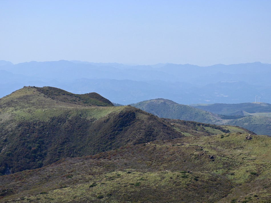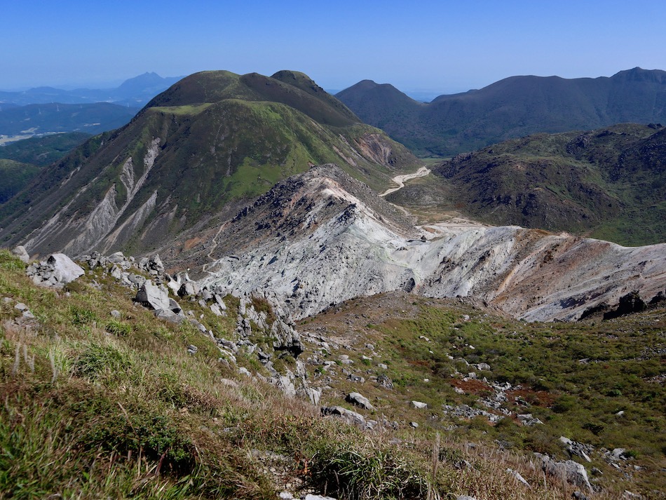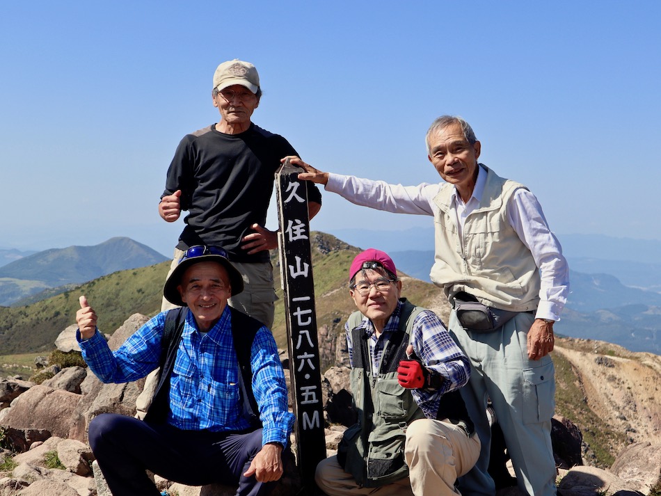 10月2日朝6時過ぎ、4人は九重山を目指し福岡を出発した。中止になった北海道幌尻岳登山の埋め合わせに急遽実現した1泊2日の登山である。 牧ノ戸峠に駐車して、ほぼ予定通り8時半過ぎ牧ノ戸峠から登山開始! まだ緑の支配する山々だが、山の冷気に秋の深まりを感じながら歩く。 小さいけれど、リンドウの花の青が目を引く。 紅葉シーズン前だが、コロナを逃れ自然に親しむ登山者は多い。 平坦な登山路が久住山に続くが、ちょっと予定変更。分岐で星生山への細い登山路に入った。 結構な勾配だが、景色がそれを忘れさせる。特に地塘は存在感が大きく何度もカメラを向けた。 辿って来た道は遠く下から続いてる。目が眩みそうだね。 20分ほどで尾根筋に辿り着くと、更に素晴らしい眺め! 手前に伸びる登山路は牧ノ戸峠〜久住別れの平坦路。その先遠く霞んで見えるのは阿蘇根子岳。 福岡方向を眺めると、 分岐から30分少々、標高1762m星生山撃破! 星生山から星生崎までの眺望最高。星生山初登頂なれど、、、 惚れたぜ星生 No.1! 見よ! 硫黄山、三俣山、その奥に平治岳、大船山。 危険を覚える岩場も多いが、それが却って感動を盛り上げる。Mの極致ですな〜!(笑) 明日のゴール長者原も遠く望める。 最後の登りを終えると星生崎、そこから下を覗き込むと、、、引き込まれそう、ちょっと背筋ひんやりしますねん・・。 星生崎から下ること約20分、久住山避難小屋前から改めて星生崎を仰ぎ見る。(感動!) 避難小屋前で昼食を取り温かいコーヒーを飲んだ。山登りで覚えた楽しみの一つは、温かいコーヒーの美味しさ、料理の楽しさ。それに、余分に水を運ぶとトレーニング効果も高まる。 つまり一石二鳥って訳だ!(笑) この後はメインディッシュ久住山。山頂周辺の眺めをどうぞ! 先ず星生山〜星生崎の眺め。目を凝らせば避難小屋も見える。 硫黄山沿い北千里ヶ浜を望む景色。 阿蘇の山々。 遠く望むは由布岳だろうか。 最後は宮崎方向の山々。 避難小屋から25分、1時半久住山撃破。四人揃って標高1786m久住山で意気揚々。我等ベビーブーム世代、まだ若いもんにゃ負けへんで〜っ! 久住山撃破で今日の予定は終わったも同然。後は法華院温泉山荘に行くだけだ。久住別れから北千里ヶ浜へ降り、硫黄山・三俣山を目標にひたすら歩く。 硫黄山からは噴煙が上がっている。 三俣山沿いに歩くと坊がつる前の関門で猿岩(ゴリラ岩)が待ち受ける。怯まず颯爽と向かう男たち! 関門を過ぎて急斜面の先に坊がつるを認め勝利確信! 我が憧れの法華院温泉山荘、予定通り4時半到着。まるで子どもの修学旅行気分の夜! 一日の健闘を称え合って『乾杯!』 持つべきものは友。 そして、寒い宿の外に満天の星! 『人生最高!』 本日の踏破距離:10km