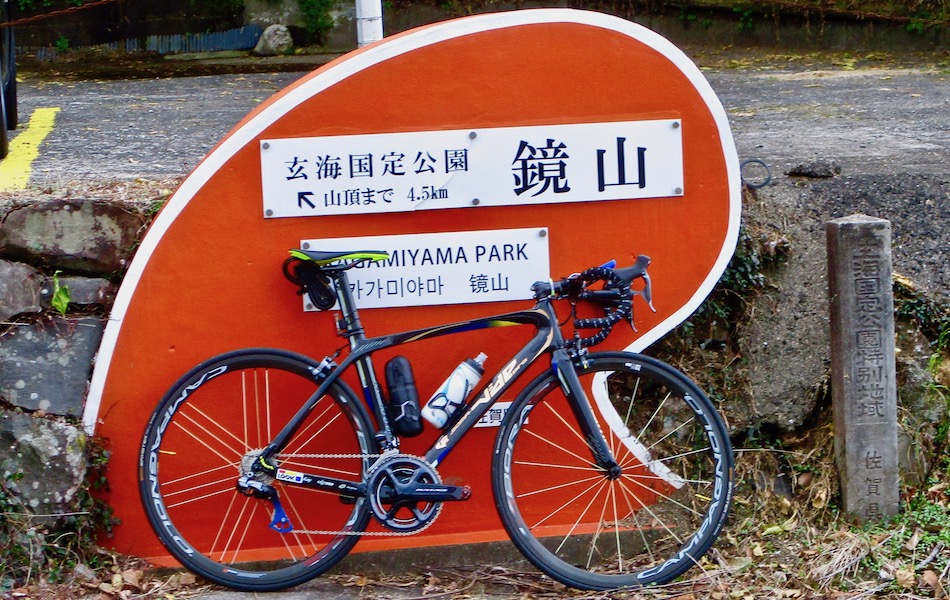参加者無しと覚悟していたが、糸島からわざわざ参加いただいた! 参加車はPiccolino号(ライダーは糸島を愛する『糸しman』) OZ号(ライダーは30そこそこオズの魔法使い的飛ばし屋) HELIX号(ライダーは年齢抵抗男) 昨日の登山の影響も加わり往路でヘトヘト状態だったが、二人の心優しき糸島人に牽かれてアウター縛り・ノンストップ登頂達成! 山頂の絶景にしばし休憩の3車。 眺めは最高だが、曇り空で風も強く寒いことこの上ないが、寒い素振りも見せずカメラにポーズのライダー3人。 写真撮影後はウインドブレーカーを羽織るや一目散に下山開始! 昼食は唐津バーガーのつもりだったが、鏡山を下りた我々は寒さに震えるばかり、合流場所の目と鼻の先のラーメン屋の看板に目は釘付け。意見まとまり即決、GO TO ラーメン!(笑) 私が選んだのは『黒ラーメン』+半チャーハン、店の暖気と温かいラーメンですっかり生き返った。 時折脚に痛みが走ったが、二人の糸島人の牽きと裏道また裏道を案内されいつの間にやら福岡間近。 Piccolinoさん、OZさんに固い握手で別れを告げた。また是非ご一緒しましょう! すべてが楽しいツーリングであった。本日の自転車107km。