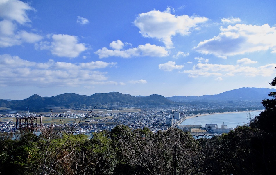 店内はコロナとは無縁の盛況。しかし、あちこちに感染対策がされて安心して品定め。久しぶりの美味しい香りに4品お買い上げ。もっとも1個は自宅への土産になったが。(笑) 数年ぶりに一緒したスマイリーさんだが、今回一緒するのはここまで・・。所用のためここでお別れ、また是非一緒して下さい! Mr.スマイリーの豪脚のお陰で、時間にゆとりあり。予定通り東郷神社へ向かったが、神社への坂は思った以上に険しかった。 神社から少し登った山頂に日本海海戦紀念碑がある。 当初碑銘は「日露戦争戦勝記念」にする予定だったらしいが、東郷元帥が「戦勝という字句は国の尊い犠牲となられた両国軍人のことを思うと忍びない」と反対したため「海戦紀念」となったという。どこぞの国にも見習ってもらいたいと思うのは私だけか。 山頂から福岡市方向の海の眺め。一際色濃く見える島が相島。中央左やや濃く見えるのが志賀島。 上の写真の更に右側を撮ったのが次の写真。拡大すると左側の峰の先の水平線上に小呂島がかすかに見える。 更に宗像方向に浮かぶのが大島。沖ノ島は残念ながら・・。 最後は、津屋崎・福間方向の眺め。 帰路香椎を過ぎる頃、妙に警察官の姿が目につくようになった。我が自転車のスピード監視か、通行マナー監察かと思ったが、、、やがて福岡国際マラソン交通規制の動員だと気付いた。(笑) その後、選手と鉢合わせしないことだけを祈りながら、我が人生同様裏道、裏道を走った裏道サイクリングであった。
