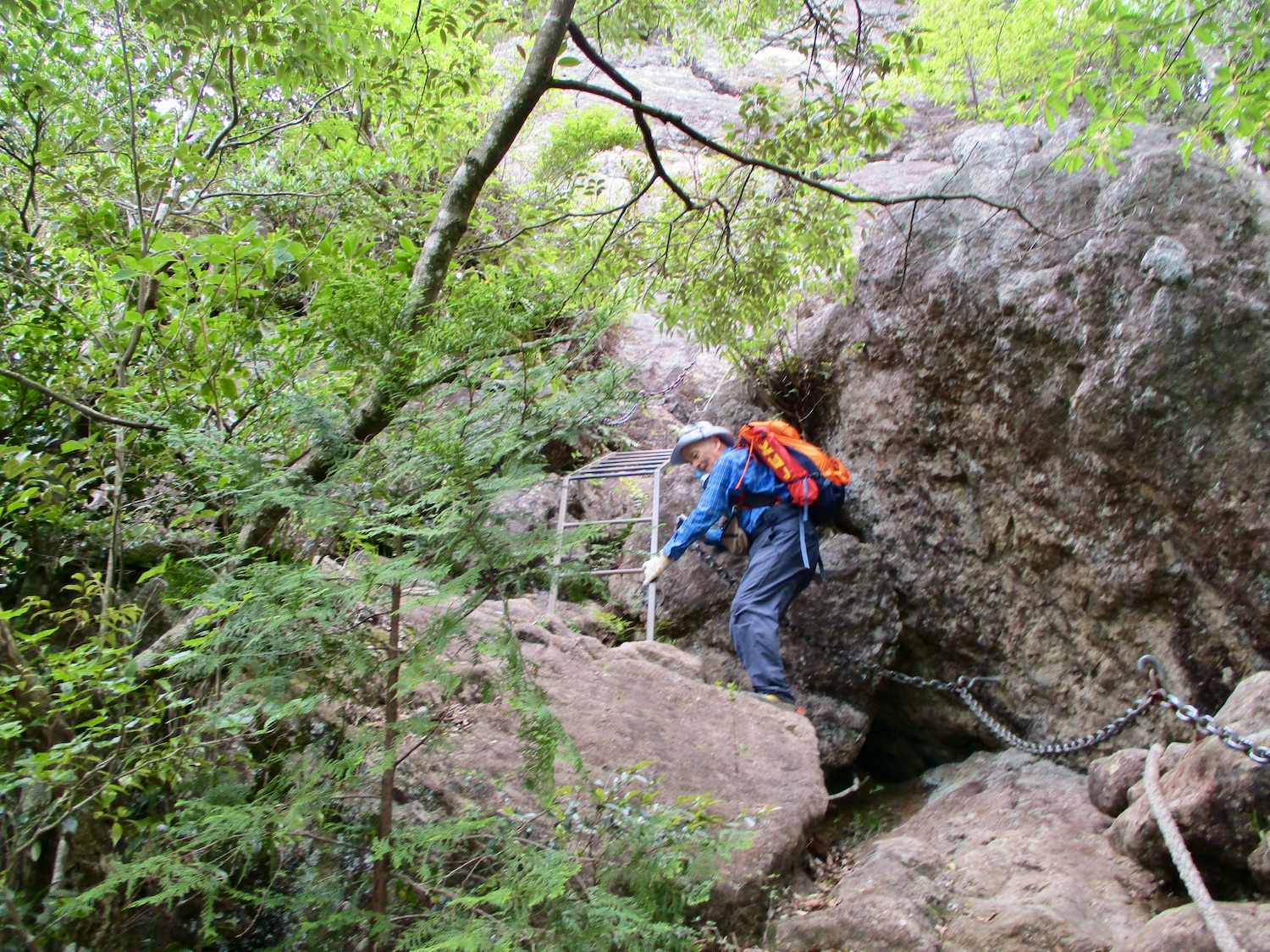 スタートは前回と同じ竜門ダム駐車場。 2回目の挑戦で楽勝、と思っていたが、、、何の祟りかYAMAPがうまく機能しない。いつまでも現在位置は竜門ダム湖ど真ん中・・。なんで、なんで、なんでだ〜!(冷汗) 遂にYAMAP諦めポケットへ、我が曖昧記憶と山﨑君の抜群の勘に頼って登る。暑さもありペースは一向に上がらなかったが歩くこと2時間、例の巨岩に到着。巨岩も凄いが、そこに根を張る樹木もまた凄い。 巨岩を迂回し岩場を登る。 岩場から10分ほどで断崖絶壁到着。花はミツバツツジからヤマツツジに代わったが崖の怖さは変わらない・・。 断崖を抜けると竜門ダム湖を望む展望スポットがあった。駐車場も手前に一部見える。 更に30分ほどで青螺山撃破! ここで奇跡が起きた。まさに青螺山山頂で突如YAMAPが働き始めた。スマホをポケットから取り出したら突如ログの記録が始まっていた。美少女『セーラーさん』の奇跡? 更に30分で『青螺御前』 そして、1時頃見返り峠着。ここまでで最強低山の山場は終了だ。因みに青螺山からの下りで3回転倒したことを告白する。しか〜し、我が名誉の為に記すが転倒3回は自己最多記録である(爆笑) 木立で暑さ・陽射しの和らぐ見返り峠で昼食休憩。しかし、ここで太腿痙攣。今回も青螺山に泣きました・・。 今回も時間の関係で雄岩は割愛、雌岩に立ち寄った。 今回写真のメインは、前回撮り損なった黒髪山頂手前にある岩場での写真。ここだけは青螺山にも増して一瞬の油断もならない。 そして、やっと有田ダムの見える黒髪山頂。やや霞んでるが、よ〜く見ると左に有明海と右に大村湾が写ってるよ。 前回は見損ねたが山腹の手前に雌岩、その奥やや低く雄岩が威容を誇示する如く聳り立つ眺望にしばし目を奪われた。 いや〜、登山、贅沢な趣味だね〜! 大自然が織りなす造形の美を我が物として味わう。最高!! 雄岩は残ってるし、もう次の訪問に食指が動くのを感じる(笑) |