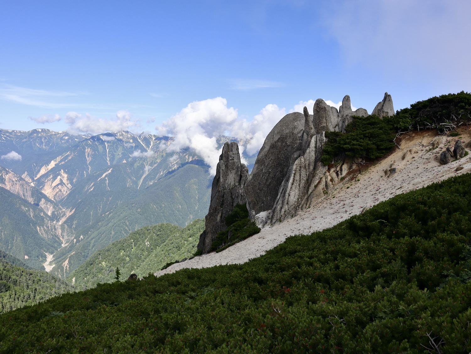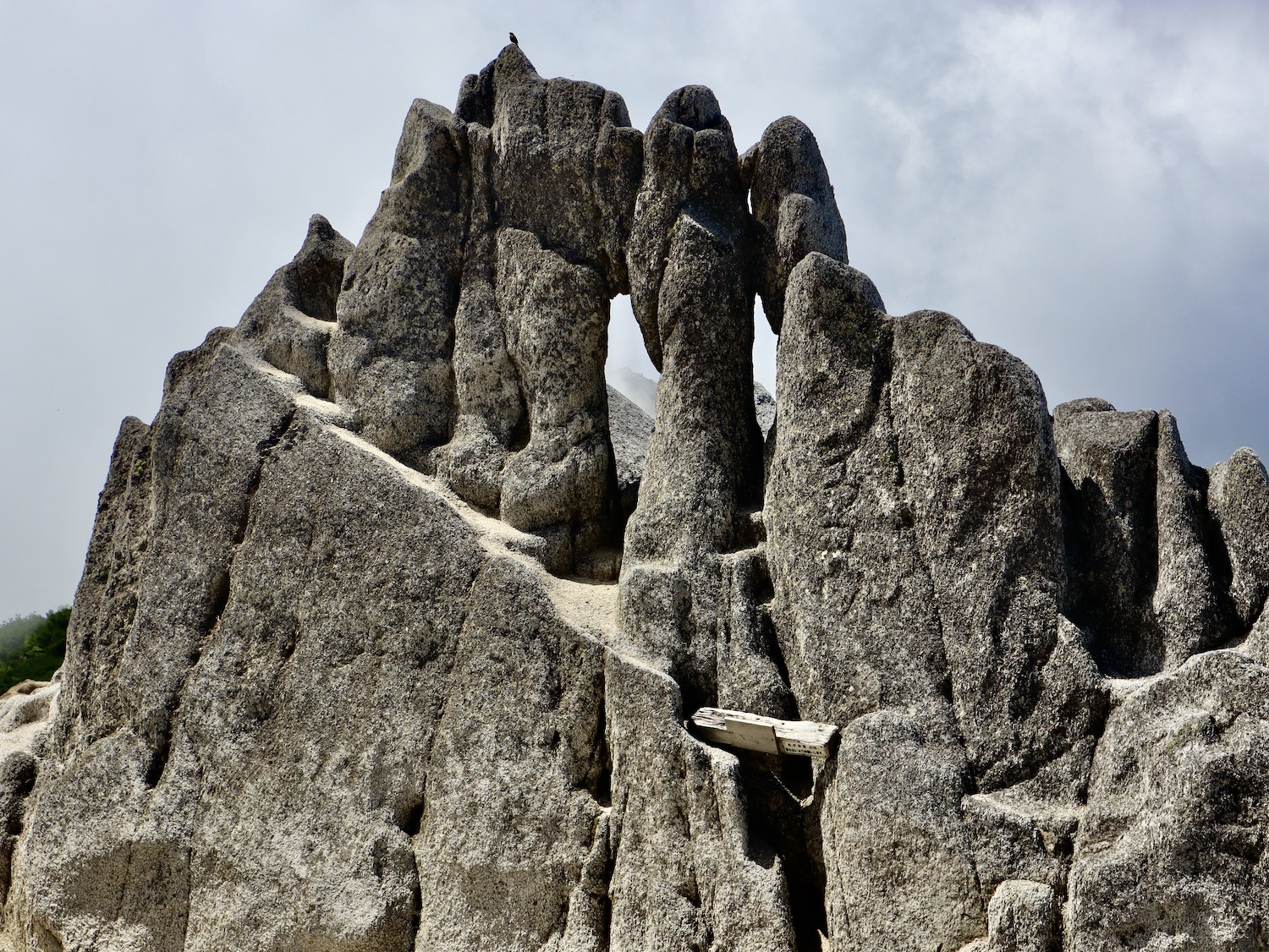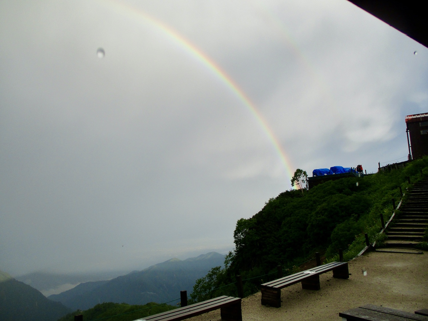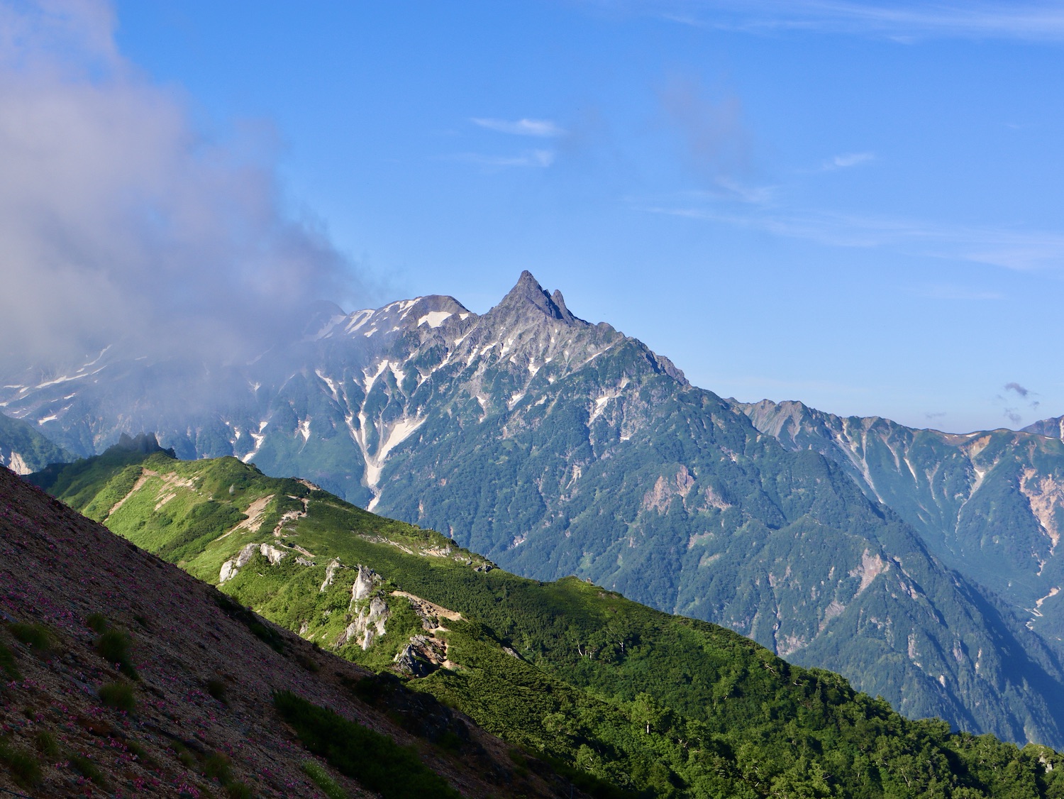 11:00過ぎ穂高駅下車、乗合バス座席も確保、路肩崩落で遅れを心配したが、ほぼ計画通り12:30過ぎ中房温泉登山口より登山開始! ルンルン気分と言いたいところだが、相手は北アルプス三大急登に名を連ねる燕岳合戦尾根、標高差1260mの急登なり。 登山道は明瞭だが、いきなりの急登続き・・。 眺望は、利かない・・。 どの山も同じ、汗水垂らして匍匐前進・・。 だが出発遅れ跳ね返し13:20第一ベンチ定刻到着! 続いて第二ベンチ到着。まだ共に笑顔で顔晴る! そして第3ベンチ。この先雷雨、だが幸い遠雷。 そしてやっとこさ富士見ベンチ。さて笑顔は? 看板に偽りあ〜り、富士山見えないぜ〜。 計画段階から名前で騙された。第一ベンチまで我慢すれば、後は富士見ベンチまで遠くの眺めを楽しみながら歩くものと決めつけてた。それがず〜っと急登、眺望なし・・。 『富士山見せろ! 富士山返せ!』 下調べ不足を棚に上げ恨み節(笑) しかし、遠くは見えずとも絵になる眺めはある。 雨と汗ですっかり濡れて合戦小屋到着! 合戦小屋辺りから眺望が得られるようになった。そして、雨に見舞われてこその景色も楽しめた。 急登に雷雨+疲れで計画より少し遅れ17:00合戦沢の頭(2488m)到着。展望が開け笑顔も復活、あと2km! 見よ、あれが燕岳! 次は、餓鬼岳・唐沢岳方向の眺め。 この後気づかないで良いことに気がついた。スマホがな〜い! 我が最悪持病の落とし物病、忘れ物病・・。 山﨑君には一足先に山小屋へ向かってもらい、小休止した合戦小屋までスマホ探しに戻った。しかし、見つかる筈もなく一人山小屋へ急ぐことになってしまった・・。 時に18:30過ぎ、夕暮れの気配が忍び寄る中、山小屋が目に入った時は流石に一安心、ホッとしたね。もう一顔晴りじゃ〜! 山小屋の灯りを目指し迫る夕闇と先を争った。そして、19:00過ぎタッチの差で夕闇征して『燕山荘』到着! その後もごたごたあったが 『終わりよければすべてよし!』 ビールと夕食でドラマチックな一日を反芻する最強コンビだった。 こんな調子で明日からどうする?