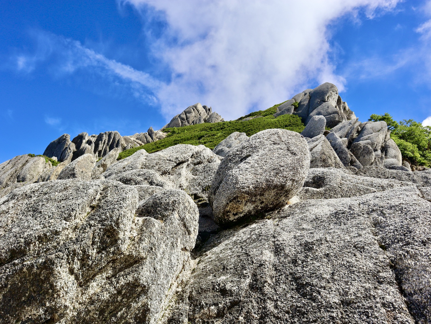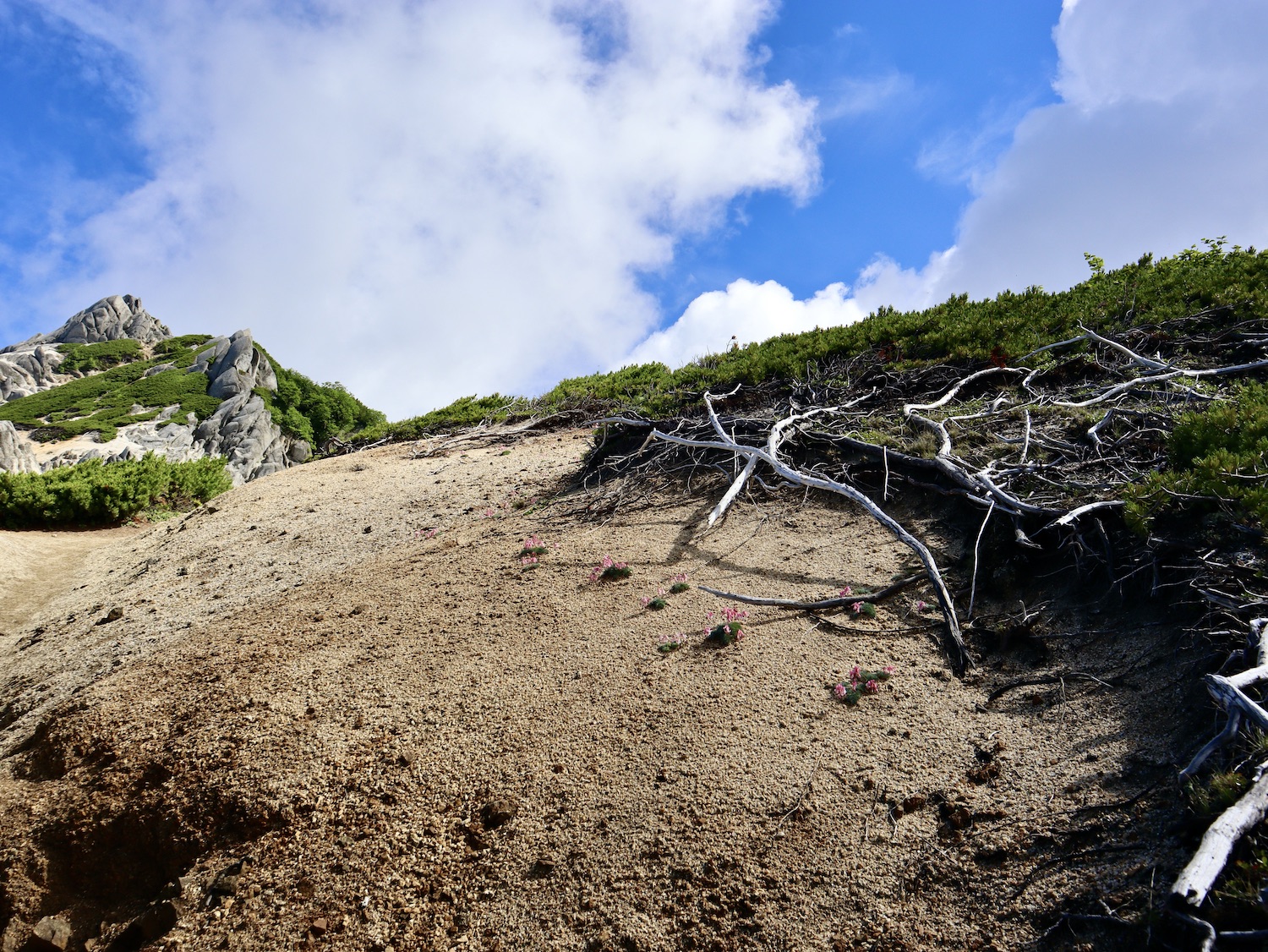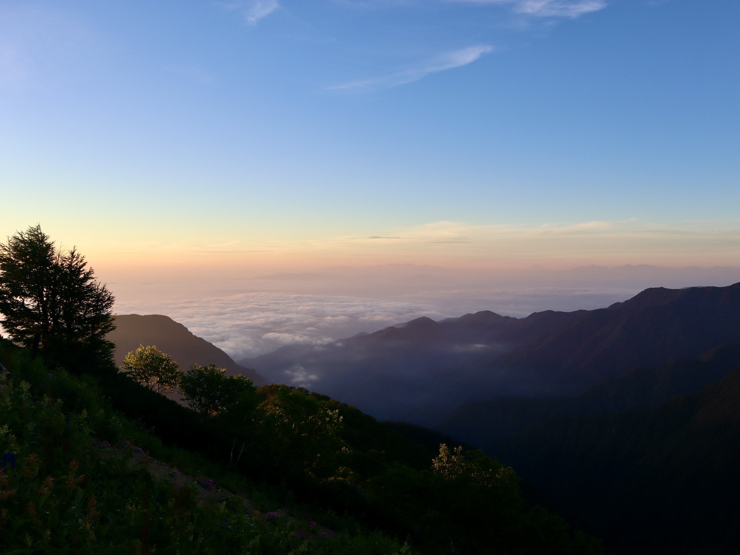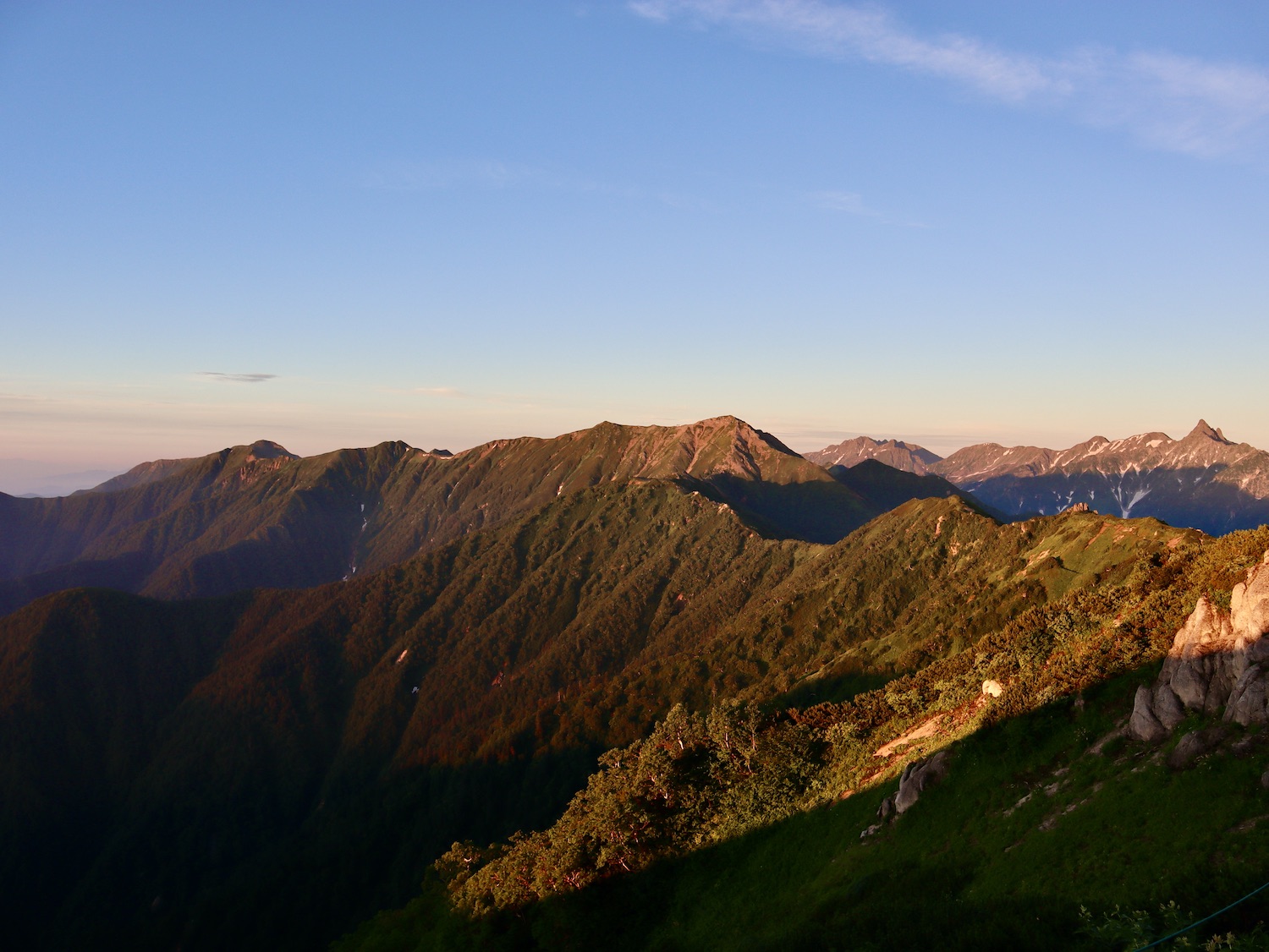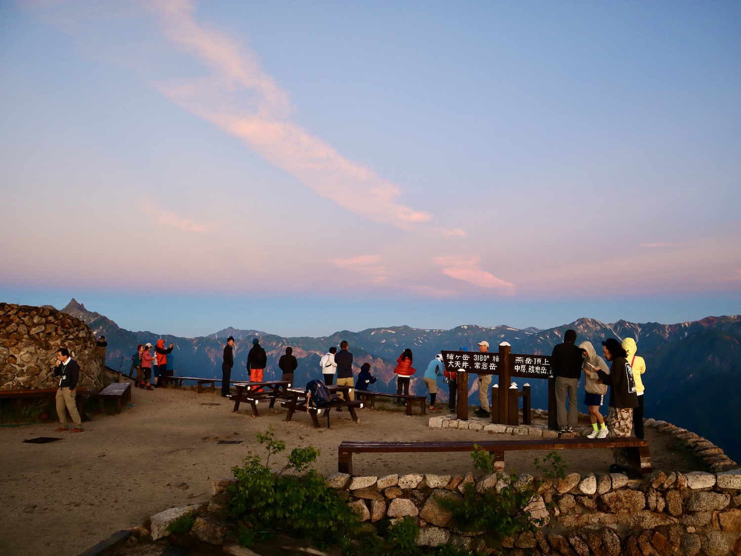 7月23日朝4時10分過ぎ東の空は明らみ月も浮かんでいる。まさに海、山の向こうを雲海が埋め尽くして広がる。そして、その時を待ち受ける人。 西側の空も北アルプスの山並みも赤みを帯びる。 北には今日登る燕岳。 右手が東、左手西。空の美しさに感!動!! 4:46 出た〜、日の出〜! 槍ヶ岳も赤みを帯びて荘厳。朝日を受ける燕山荘は天上の御殿! やがて日は雲海の上にのぼる。右側に視線を移すと山並みが現れ、今日歩く筈だった常念岳、大天井岳、更に槍ヶ岳へと連なる。 朝の光のドラマを存分に堪能した後、ゆっくり朝食をとって7時前もう一度外に出るとすっかり明るくなっていた。南西方向の槍ヶ岳から連なる北アルプスを写真に収める。 多分4枚目写真中央が野口五郎岳だと思うのだが、なにしろ登山初心者、とても断定はできません(笑) 〜燕岳満喫編〜 山小屋情報では昼前後から雷雨・・。 天気不安に加え、スマホ問題、更に疲労気味で予定を変更、山﨑君には申し訳なかったが常念岳への縦走は諦めて燕山荘に連泊、燕岳を存分に味わうことにした。 8時過ぎ燕山荘出発。燕岳には既にガスが迫っている。山の天気は変化が目まぐるしい。 しか〜し、人情の厚さは変わらない。連絡が入った。中房登山口にスマホが届けられたらしい。第3ベンチ辺りで落としたらしい。どなたか存じませんが本当にありがとうございました。心よりお礼申し上げます。 さあ、今日は心置きなく燕岳登山専念だ! 燕岳は花崗岩からなる山、巨岩、奇岩に目を奪われる。登山道も花崗岩の砂礫主体で白っぽく独特の味わいがある。 こんな所にイルカがいるか? イルカ岩 次メガネ岩、レンズ部に槍ヶ岳がのぞく構図を物したく、随分粘ったが頑固なガスにお手上げ脱帽、諦めました・・。 あそこか〜? いよいよ山頂も近そうだ! スタートから1時間、9時ちょうど、 標高2763m 燕岳撃破〜! 山頂から槍ヶ岳方向の眺め、青空が広がるが、槍ヶ岳山頂部には雲が居座り離れない。しばらく待ったが完璧構図の写真は諦めた。 燕岳の先には北燕岳そして東沢岳へ魅力的な山並みが続く。しか〜し、疲労と雷雨予報を考慮し眺めを楽しむだけにした。 北燕岳断念は少し残念だとも思うが、 燕岳の魅力は岩稜や山々の眺めだけではない! コマクサを始め可憐な高山植物もけんを競う。 しかし、コマクサ群生する燕岳・燕山荘周辺の素晴らしい眺めや、雷鳥たちの姿を眺められるのは当然・偶然ではないらしい。20年間にも及ぶENZANSOその他関係者の保護・維持活動で復活した景観なのだ。感謝の心をもって味わいたいものだ。 残念ながら私は雷鳥を目撃できなかったが、燕山荘スタッフブログから写真を転載させていただいた。 〜感動おかわり編〜 燕岳満喫後は山小屋でリラックス。 ビールとカレーで腹を満たし、絶景を眺めながらコーヒーを淹れ味わう至福の時。そして午睡で体を休める。そんじょそこらのホテルじゃ味わえない超贅沢! しかし、予報は的中しその後は時折雷雨に見舞われた。夕食時もまた雨が降り二重の虹にカメラを向けた。山小屋オーナーの登山講話にアルプホルンの響きも心地よい思い出だ。 今日最後の感動は雨後の筍じゃないぜ雨後の雲! とうもろこし雲?(笑)初めて目にする雲だ。 時に18:40、夕陽が織りなす作品にも同じ雲が! 燕岳も立派な芸術作品! 感動に満ちた一日に感謝!
