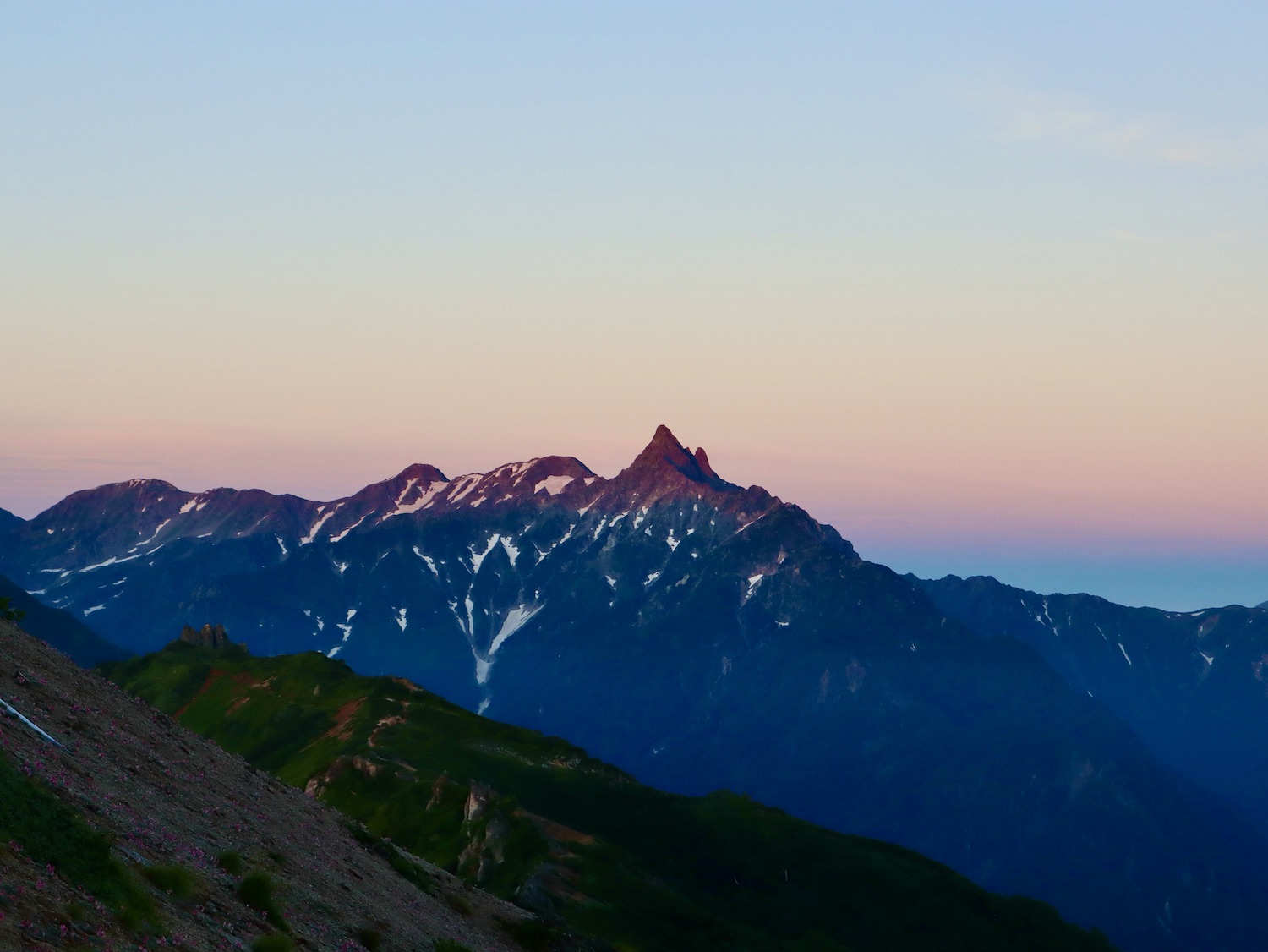 北アルプスの眺めを心に刻み付けようと、4:30前外に出た。新月だろうか月が見えないのは残念だった。 コマクサの群生と槍ヶ岳、 それに続く北アルプスの荘厳な威容。 そして、今まさに目覚めんとする燕岳。 4:46 御来光! 御来光を拝み山小屋最後の食事を済ますと、5:30過ぎ下山開始。 雲海に浮かんだ朝日が眩しい。 お世話になった燕山荘前で記念撮影。 そして今一度燕岳をカメラに収める。 『さらば、燕岳!』 出発間もなく、チングルマの綿毛を見つけシャッターを押した。 これが下山中最後の写真になった。 下山中、改めてこの山の険しさを実感した。結局登山口まで下りの連続、段差も多く大きく少なくとも上りは一度もなかった。歩きに集中しないと事故になりかねないし、写真を撮る余裕はない。流石は北アルプス三大急登! 登山口の小屋で二日振り我がスマホとご対面! 届けていただいた方の名前を尋ねると、 『それはわかりません。山でのことですから』 その言葉が宝物のように感じられた。 今後もこの言葉が死語にならないよう願いたい。 そして、改めて『ありがとうございました!』 穂高駅近くで山﨑君と無事下山を祝って慰労の宴。一人でごたごたを起こしたようで・・。申し訳なかった。終わりよければすべてよし、これに懲りず来年も感動の登山宜しく〜!
