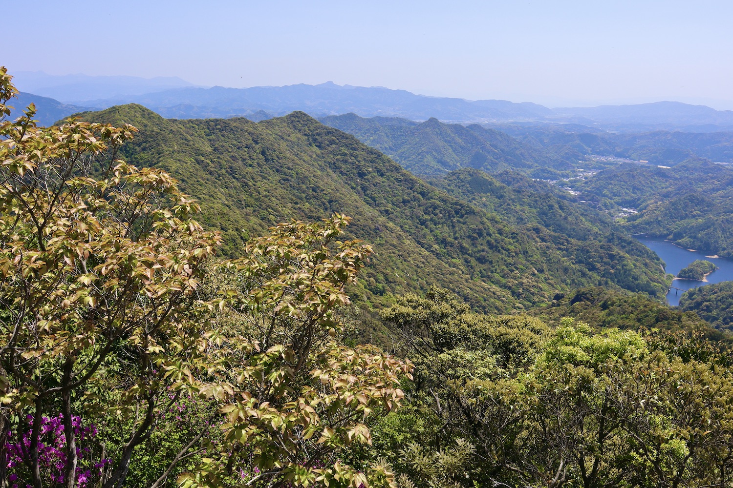 4月29日昭和の日早朝6時、スマイリーこと藤田さんと黒髪山へ向け出発! 有田陶器市で人出の影響心配したが、予定より早く8時前竜門ダム到着。 自転車で何度か来た場所だが、広々とした駐車場があり三方を山に囲まれている。二番目写真右手の建物傍が青螺山登山口である。 8時登山開始。すぐにマムシに注意、スズメバチに注意の掲示。しかし、注意のしようもないのでま無視です(笑) 登山道に入ってすぐに参っちゃいました。落ち葉に覆われ道がわからない。足跡を辿って登るなんて当然できません・・。 その上、いきなり急勾配の直登コース。足元は滑るわ頻繁に進路を確認するわで、ペース全く上がらない。おまけに岩が多く時には巨岩が壁になって行く手を阻む・・。何じゃこの登山路! 牧ノ山分岐そして青牧峠に至ってやや平坦になり一息(ホ) しか〜し幸せタイムは続かない。またまた峻路そして岩壁に打ち当たる。どないして行けっちゅうねん・・。 ♫目〜を凝らして見てごらん、細いロープが見えてるよ♫ は〜い、ここを越えて前進しま〜す!(疲) 越えて間もなく青螺の精の慈悲かミツバツツジと遠景に心身蘇生! と思ったのは束の間。断崖絶壁降臨! 脚が震える思いだった。下の方を覗き込むなんて、できない、出来ない。写真左暗い木々の間を抜けて行く・・。 通り抜けた報酬はシャクナゲ、美し〜い! 更に20分歩いて10時30分 青螺山撃破! 低山とは思えない素晴らしい眺望! 中央部に見えるのは伊万里湾・伊万里大橋。 青螺山『せいらさん』の名前通りセーラームーンの美しい眺めで疲れを癒してくれたが、流石美少女戦士だけに手強い。来し方を振り返れば優しい山並みが続くばかりだが、難所潜む侮れない山だ。 ここから青螺御前を経て見返り峠までは、ロープや鎖等が頼りの険しい下りでペースは依然上がらない・・。 これから目指す黒髪山・竜門ダムへの後半帰路の山並みに戦意喪失する思いだった。 予定より遅れて12時前に見返り峠到着。スタート後2〜3人しか出会わなかったが、ここに来て次々と登山者が姿を見せる。 黒髪山こそ最強低山だそうだが、果たしてこの先どうなる? 青螺山・黒髪山2へ続く