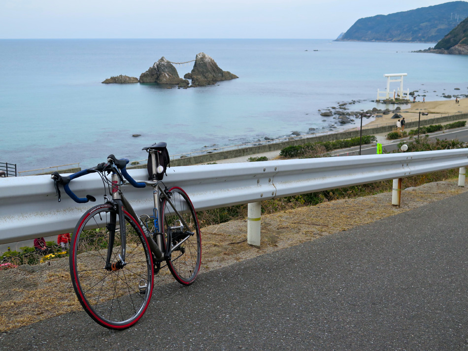 しか〜し、これまでの開店休業状態への申し訳? で日曜サ イクリング決行! urumanさんと二人で走った。 ただし、高い降水確率を考慮して糸島ポタリング。旧三瀬 街道金武宿でパチリ! そのあと日向峠越え。衰えた自転車脚には応える・・。 日向峠手前の一コマ。今にも枯れてなくなりそうなススキと 日の出直後の空のコントラストに思わずパシャッ!! 峠を越え糸島側へ下って糸島富士・可也山。富士の名に恥 じない眺め! 自転車を始めた頃の感動が蘇る。遠出、遠出と距離を延ば してきたが、素朴な感動を忘れていた! どこにも感動は転 がっている。気付かないだけだ。 二見ヶ浦での一枚。見飽きたとばかり通過点にしてしまっ ていたが、どうしてどうしてなかなかの景色である! uruman さんに案内された、直ぐ傍の二見ヶ浦の見えるレ ストラン。もうっ、眺め最高〜〜! タコライス、美味しいけれど量的に今イチ・・? しか〜し、この眺めが全てを埋め合わせるでござるよ! 店の前の砂浜には景色に酔ったカップル?のメッセージ── 『LOVE』── 取り戻したいねこの若さ! 帰宅後しばらくして本降りの雨! ラッキー! 行き先変 更正解!! ツーリング決行正解! 本日の走行距離66㎞ urumanさん、また次回もご一緒下さい!