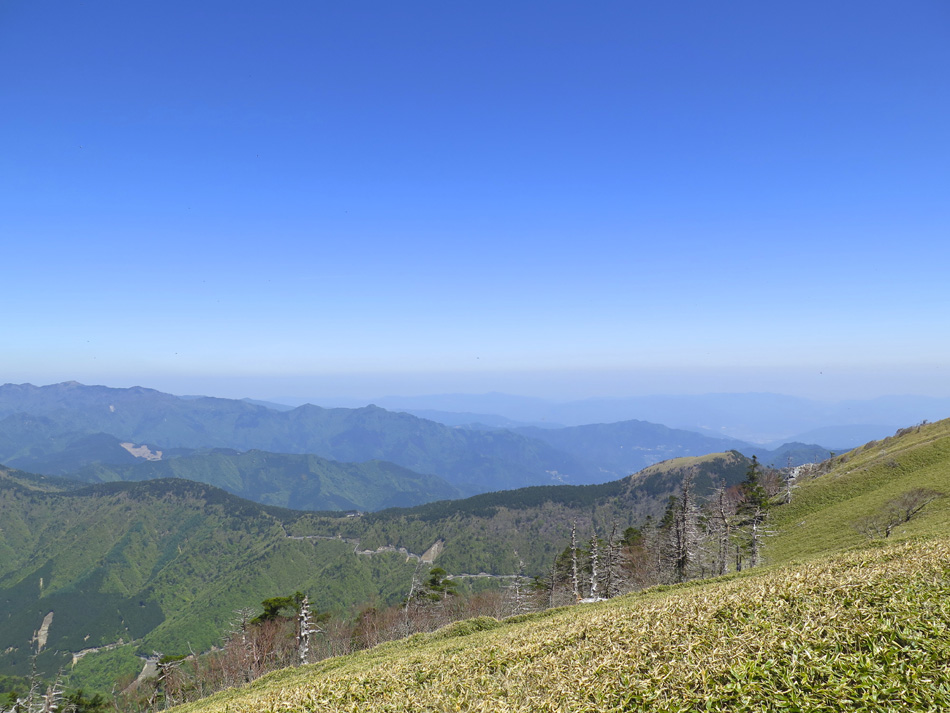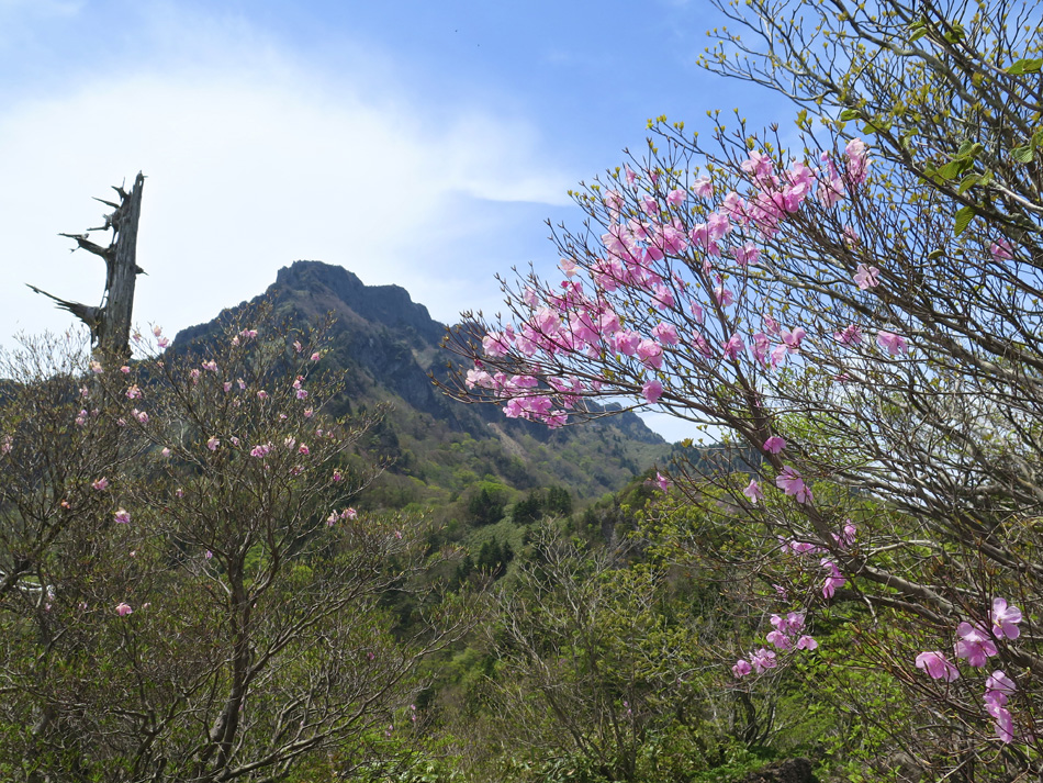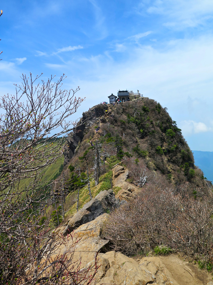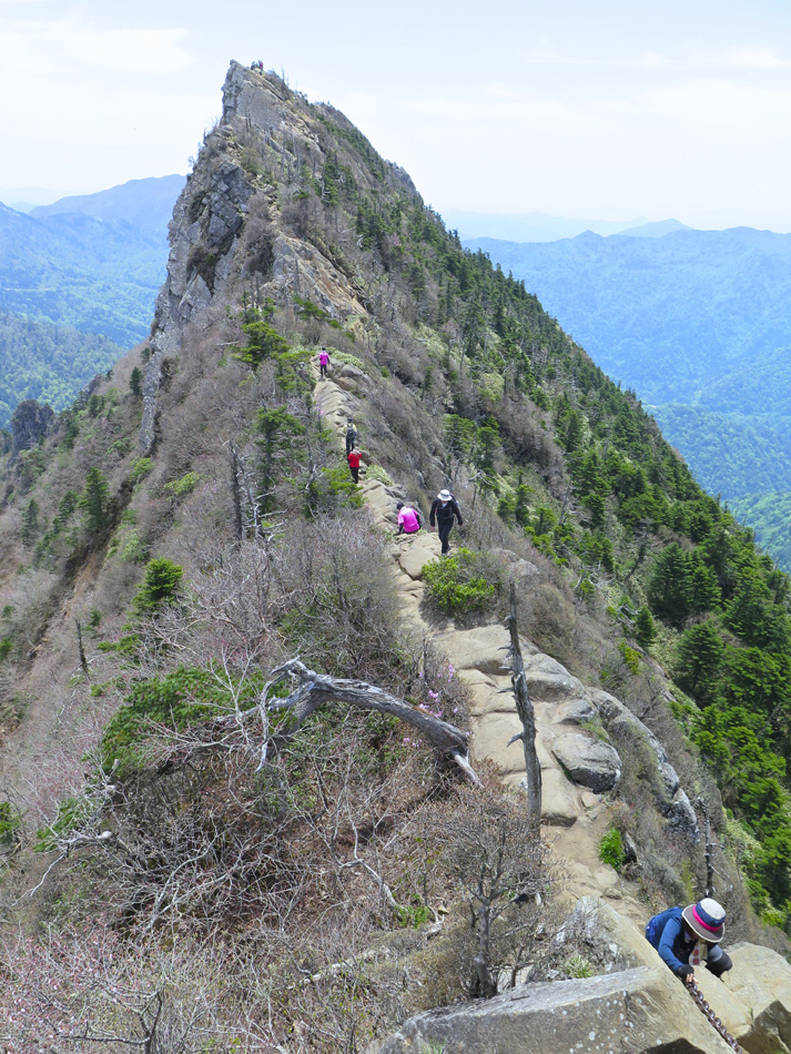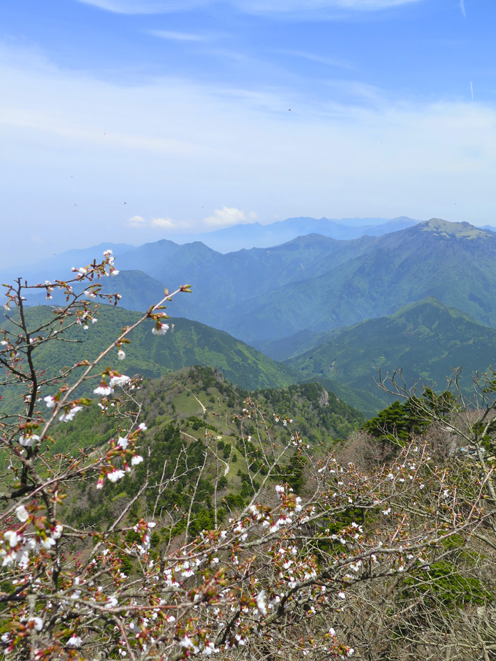 今日も羽田野君の運転で石鎚山を目指す。 ロープウェイで山麓下谷駅から山頂成就駅へ。駅名を聞い て山頂到達が保証された気分だね。更にリフトに乗り継ぐと 展望台。石鎚山が少し近付いた感じだ、、。 今日も羽田野君とはここでお別れだ。本当に何から何まで ありがとう! しばらく歩くと、石鎚神社 中宮 成就社に到着。石鎚山 がご神体であるようだ。 今日はバッテリーの残量が少なく、超節約モードの写真撮 影。成就社の写真も上の一枚のみ・・。 成就社を過ぎるといよいよ登山開始! 少し進んだところ で修験者に出会った。早朝3時登り始めて、下山途中とのこ と! しかも、一本歯の下駄で!! 我々の登山の無事を祈 って法螺貝一吹き。あたりに響き渡った。あなかしこ! 重い荷物のせいか、足の裏が熱く痛い・・。ランを休む代 わりに、負荷を掛けようと荷物を増やしたのだ。汗をダラダ ラ流しながらの苦しい歩きだった。 しか〜し、終わりのない道はない。いよいよ石鎚山が眼前 に聳え立つところまで辿り着いた。 残念ながらここから山頂の往復区間の歩行データが残って いない。間違ってGPSを一時停止したようだ・・。 登った証拠は山頂での写真。 石鎚山頂と周辺の眺め、しか〜し、ここが終わりではない のだ。糸のように細い尾根が次の山頂へと続いている! 鎖にしがみついて岩場を降りていた女性が足が届かないと 泣き出しそうな声を上げている・・。私も恐る恐る歩いたっ て感じだな。何しろ高所が苦手で・・。 アケボノツツジかな? 美しい花には癒やされたが、その 先は断崖だからね・・。・・。(汗) それにしても木内君は健脚だ! 登山では常に一人遙か先 を歩いていた。脚力・体力をつけるにはランだけでなく山歩 きにも積極的に挑みたいと思わされた。 やっとの思いで天狗岳。緊張で笑顔が強張ってる? 天狗岳側から望んだ石鎚山。険しい道にも幾分慣れたが、 引き返すのも大変でございましたよ。 アケボノツツジもそうだが、山頂近くには桜らしき花も咲 いていた。 標高が高く花の時期も遅いのだろう。葉っぱも同じ。緑は 麓から山頂へと登ってくるようだ。 花の背景に石鎚山! 絵になる景色だね〜〜! そんな石鎚山も徐々に遠く小さくなっていく・・。 『さらば! 石鎚山!』 と、少し感傷的な気分も出てきた頃、『来た〜〜〜!』 雪! 雪! 残雪だ! 表面の汚れを拭って口に入れた。 じゃりじゃりした舌触りで粗めのかき氷って感じ。 仕上げは氷で顔パック。ひんやり生き返ったね! やがて石鎚登山のゴール、石鎚スカイライン終点の土小屋 が見えてきた。次の写真の尖った山の下に見える白、土小屋 の駐車場である。 羽田野君が車を回送して待機してくれているのだ。 再び6人全員集合! 羽田野号で帰路についた。 車窓からは汗を残し足跡を残してきた石鎚山が見える。 場所により様々な山容を見せてくれた石鎚山だった。 松山空港への途中、道後温泉に立ち寄り汗と一緒に疲れも 流したのは言うまでもない。何度目の温泉・・?! かくして楽しい3日間の旅は終わった。しかし、楽しい思 い出は消えないね! 3日間の総てに感謝! そして、石鎚の雪より嬉しい奇跡が福岡で待っていた。 電話もメールも連絡一つしてなかったのだが、空港で女房 と娘が出迎えてくれた! 改めて総てに感謝!!