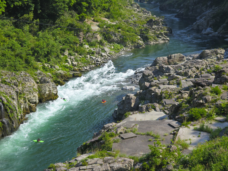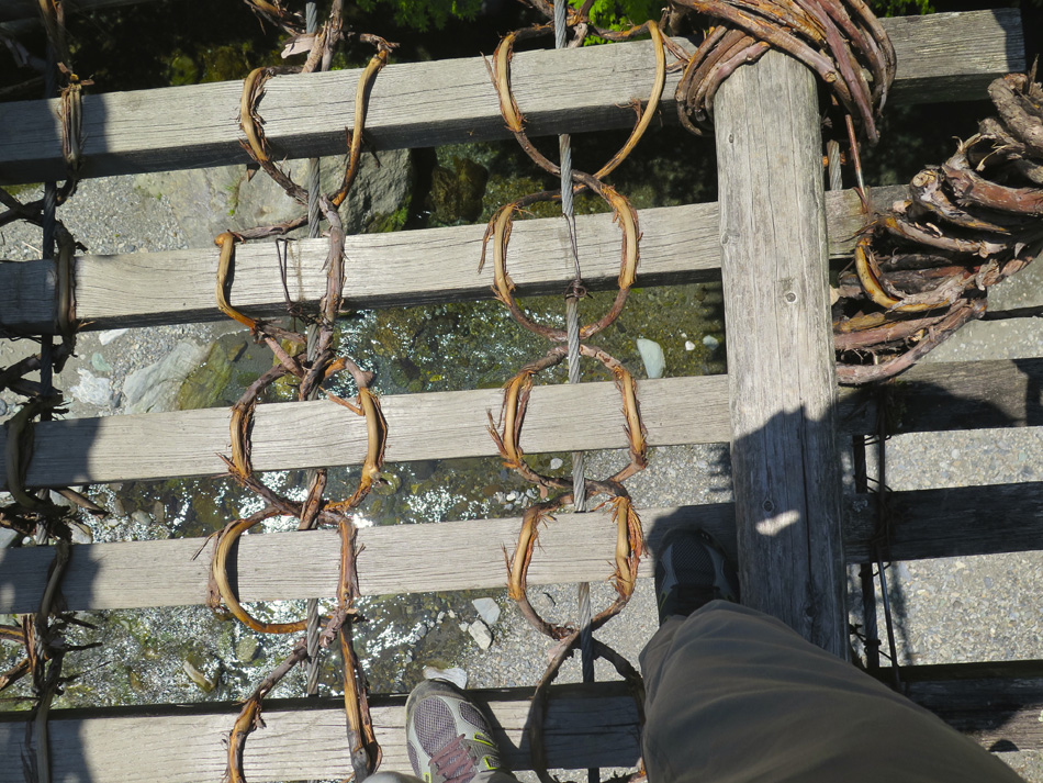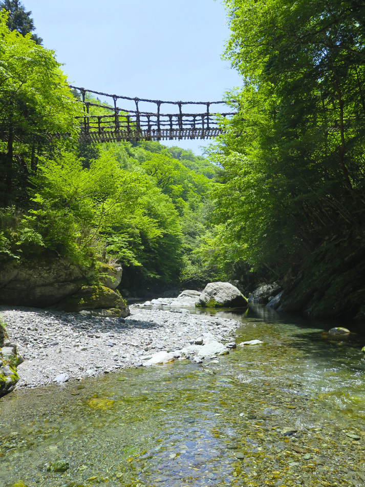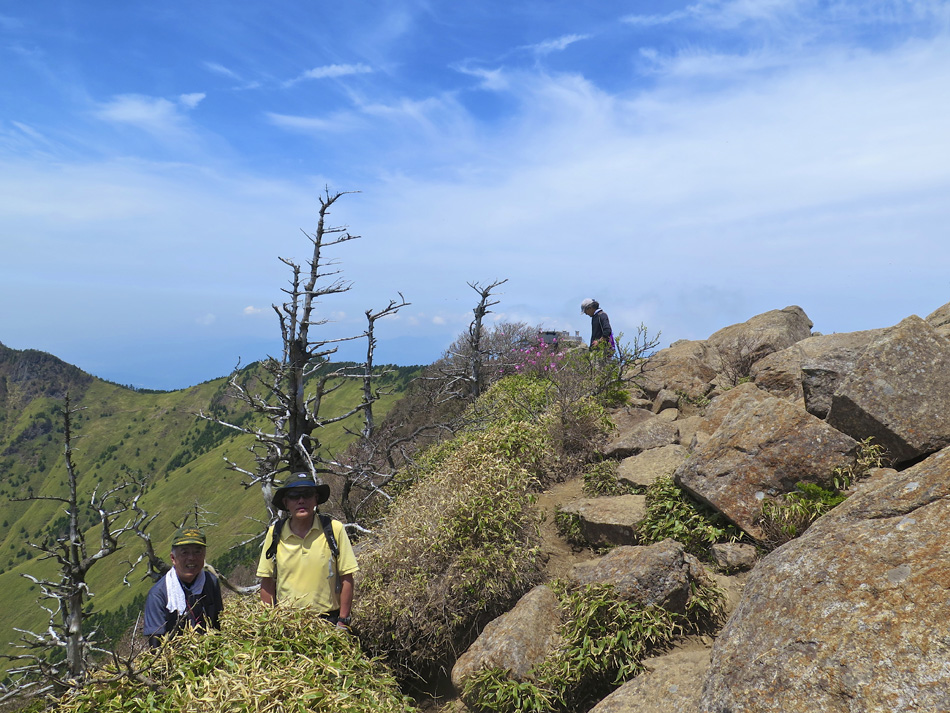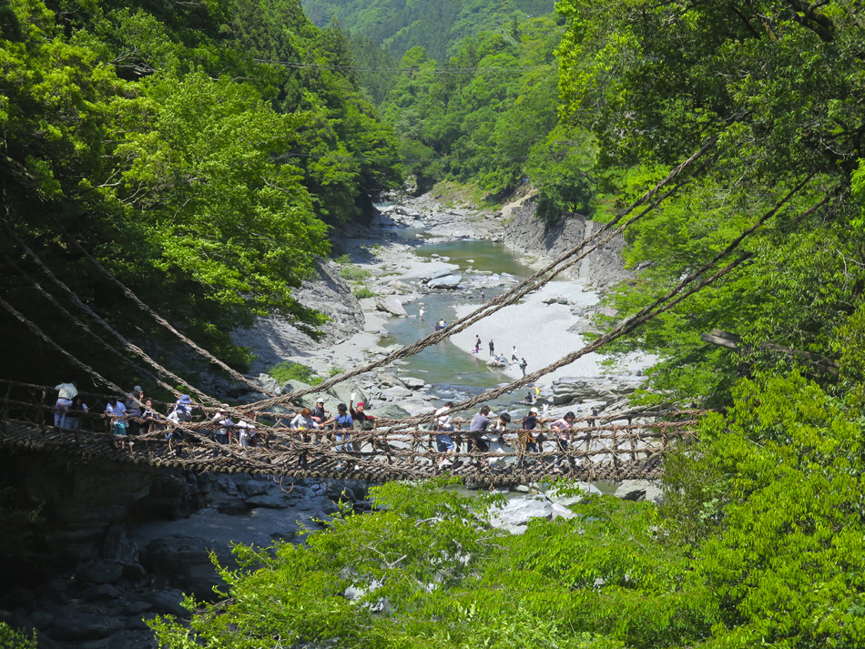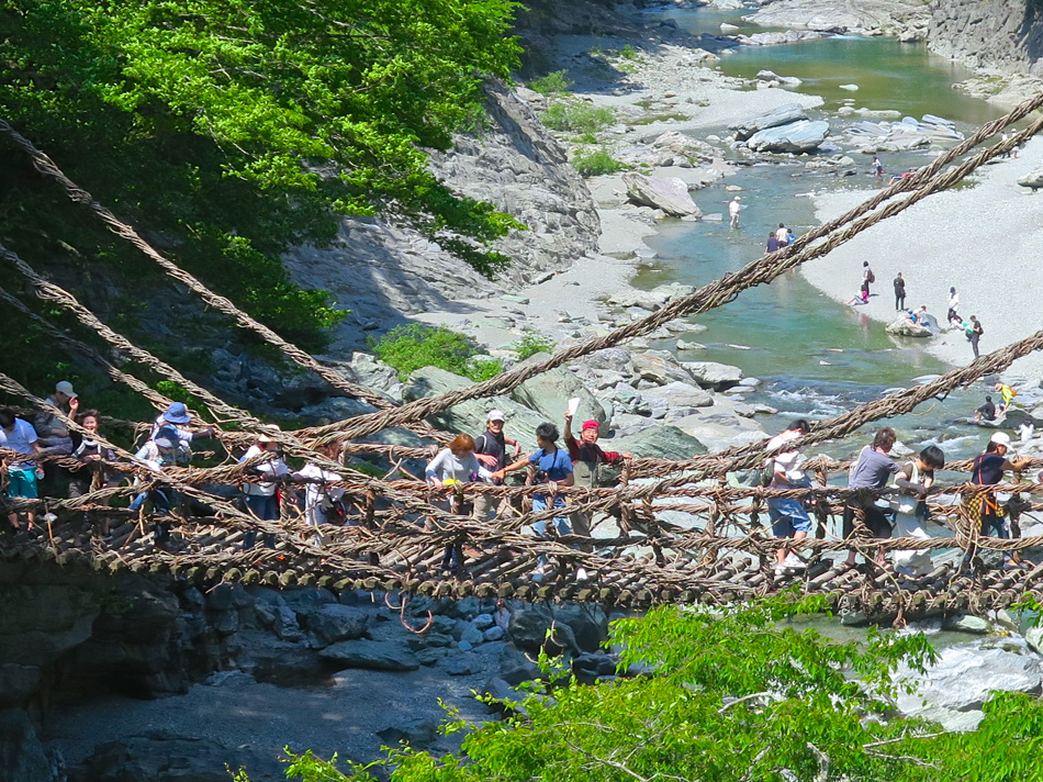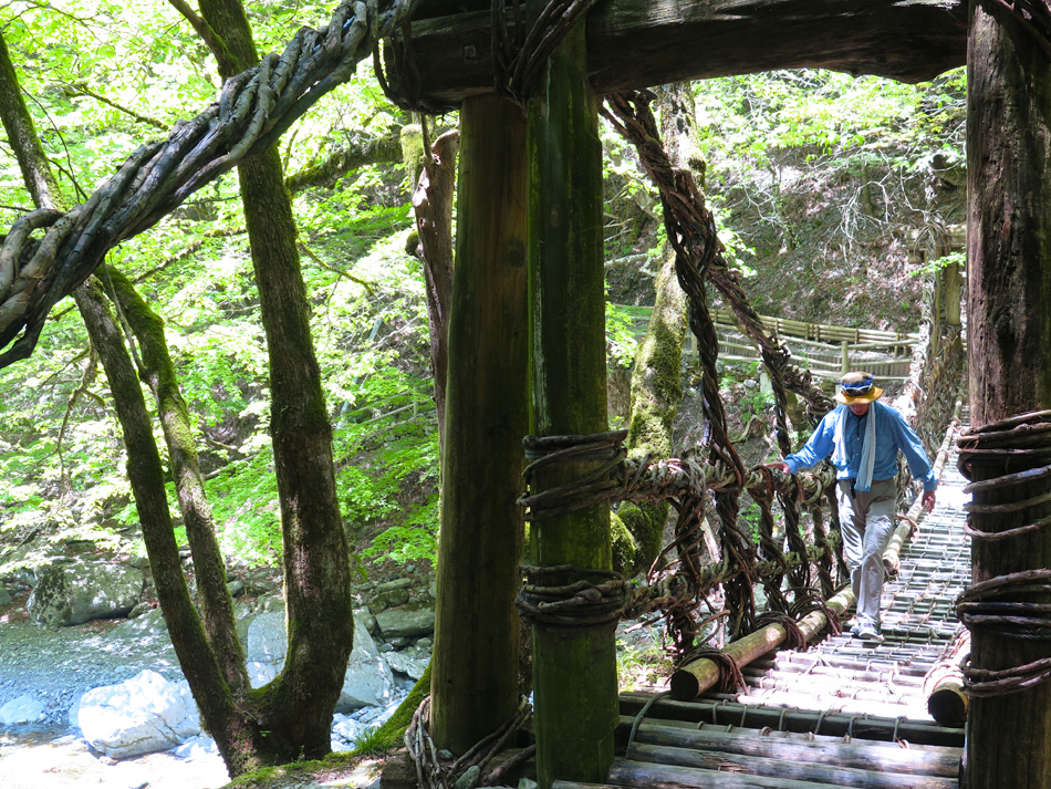 車を走らせリフト乗り場へ。リフトを降りるとそこに待ち 受けるのは無限に続く山々の世界。 今回に備えてトレーニング中に肉離れになった羽田野君は 残念ながらここまで。登れないとわかっていながら参加して 三日間運転役に徹してくれたことに唯々感謝! リフトを降りて歩くこと約30分、剣山本宮宝蔵石神社の すぐ先に山頂がある。 ここでちょっと問題発生。この山頂からの景色だけで満足 できない者約2名・・。 剣山から次郎笈(ジロウギュウ)へ続く尾根道を歩きたい 誘惑を捨てきれなかったのだ。時間優先で来た道を戻る3人 を尻目に尾根道へ向かった・・。 ここからは二人だけが目にした景色。はて?ビール片手に のんびりモードの人物は誰⤴! 困った奴(苦笑) そしてもう一人は山崎君。(最高のルートだったネ これ独り言) 落ちないように気をつけて! 横は絶壁だよ! 自然の恵み満喫の我々に連絡あり。 『リフトで先に下山しとくぜ!』(汗) 歩みを速め大剣神社の大剣岩を目にして一安心したが、い やはやご迷惑お掛けしました・・。 こちらが剣山登山ルート。 リフトを降りて、遅れ馳せの合流。改めて6人全員集合! ここでとんでもない編集ミスに青くなった。なんと、昨日一日がかりで書 いた『早起きは丸笹山の得』の記事全削除⤵⤵⤵(涙)もう一度書く??? しばらく休憩後、かずら橋を二カ所訪れ、大歩危経由で伊 予西条の西条アーバンホテルに投宿した。 気落ちした後ではあるが、かずら橋と大歩危について記事 を続ける。(記事削除した自分も大惚けだ・・。) 先ずは奥祖谷(オクイヤ)のかずら橋、男橋に 女橋 それほど高くはないが、高所が苦手で足がすくみそうだ。 下を見ると足が止まる・・。 こちらはスケールアップの祖谷のかずら橋。 拡大すると、羽田野・山崎両君の姿。 祖谷のかずら橋、渡るのは祖谷とカメラマンに専念した。 今日最後に訪ねたのは大歩危。 大歩危とは、歩くのは大いに危険の意味なのか? 両岸には険しい山々が落ち込んで来て吉野川がその間を削っ て流れる。その流れは魚にとっても過酷なようだ。 魚たちは飛び魚に身を変え空を泳いでいた!(笑) 感動の連続の一日はかくして終わった! もっとも、この後伊予西条の居酒屋で一日の感動を反芻し ながら盛り上がったのはご想像の通りである。 |