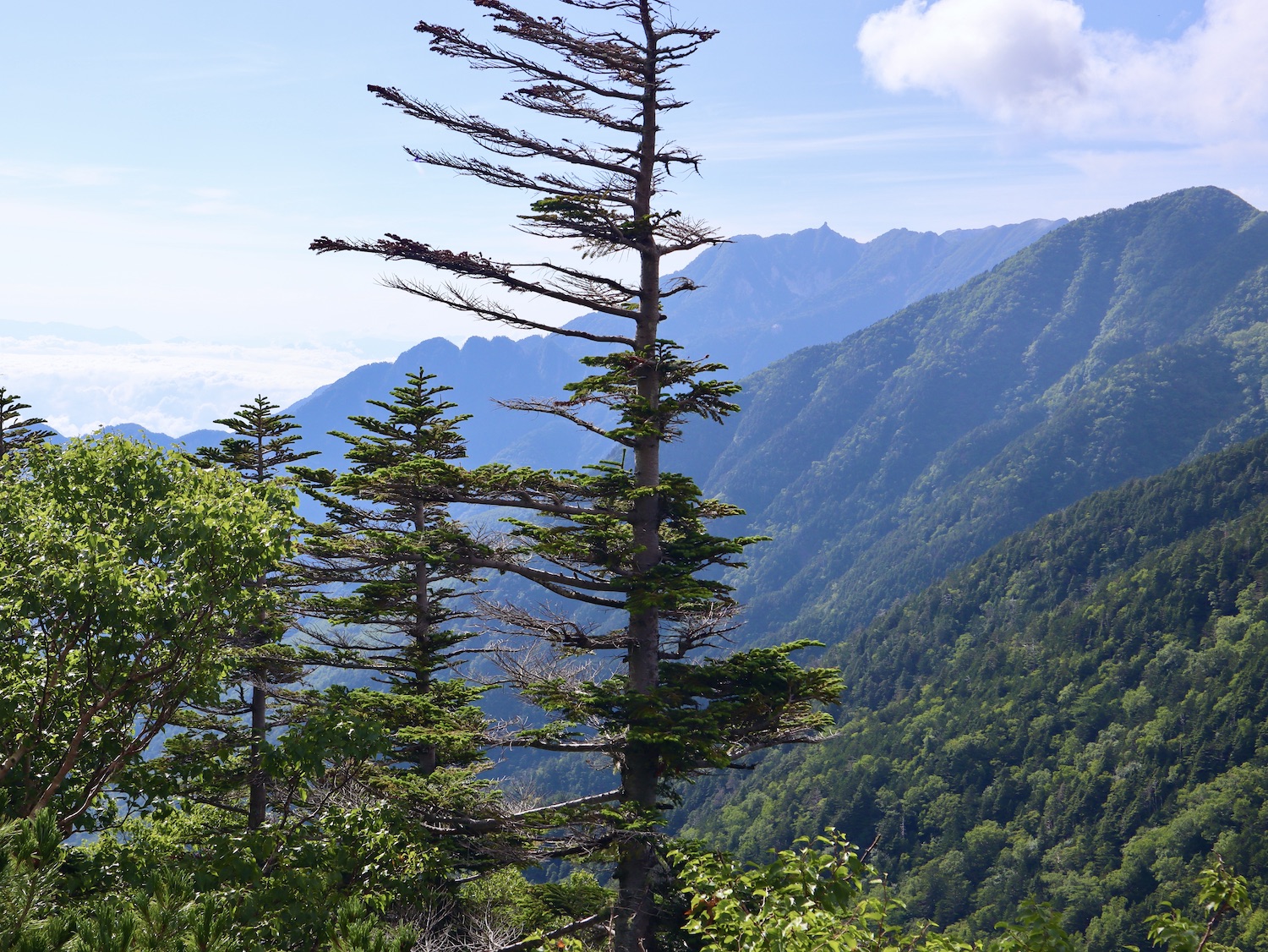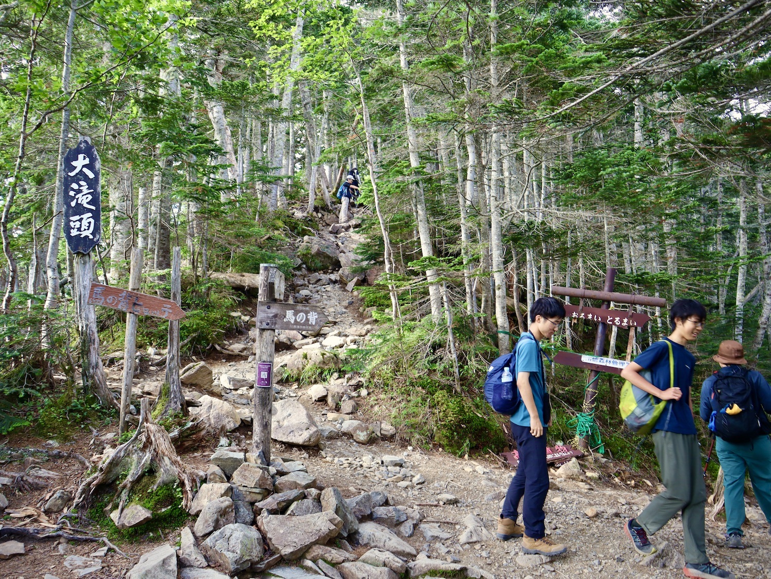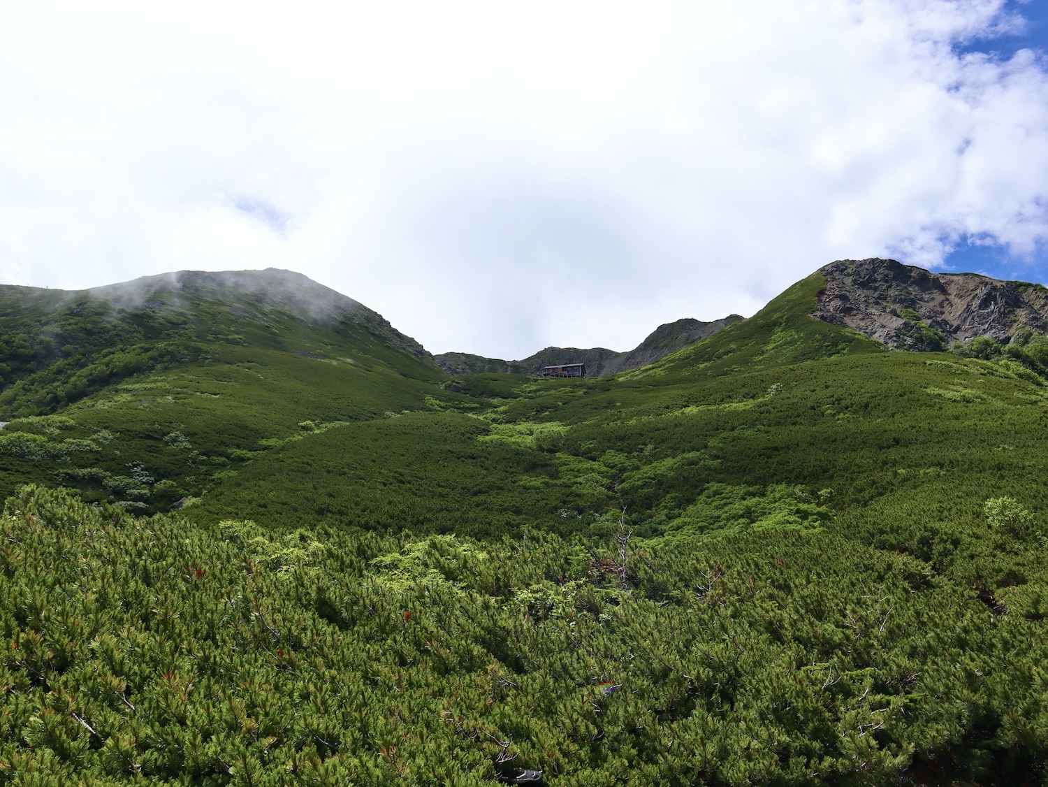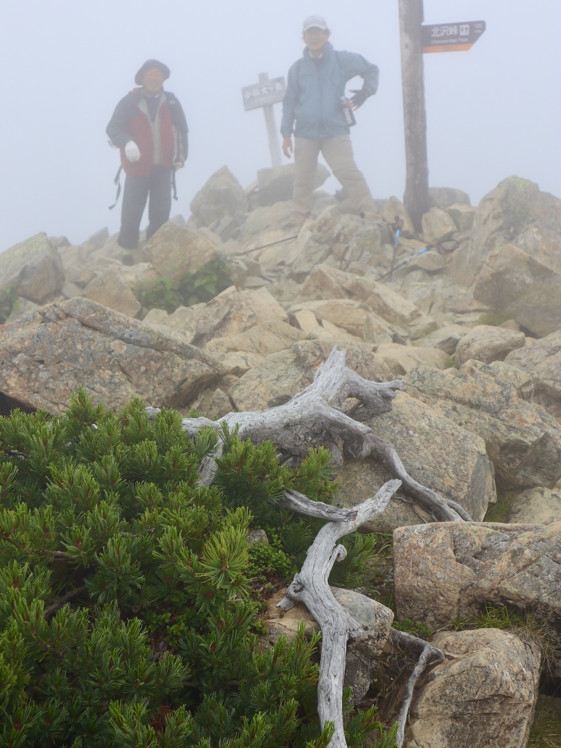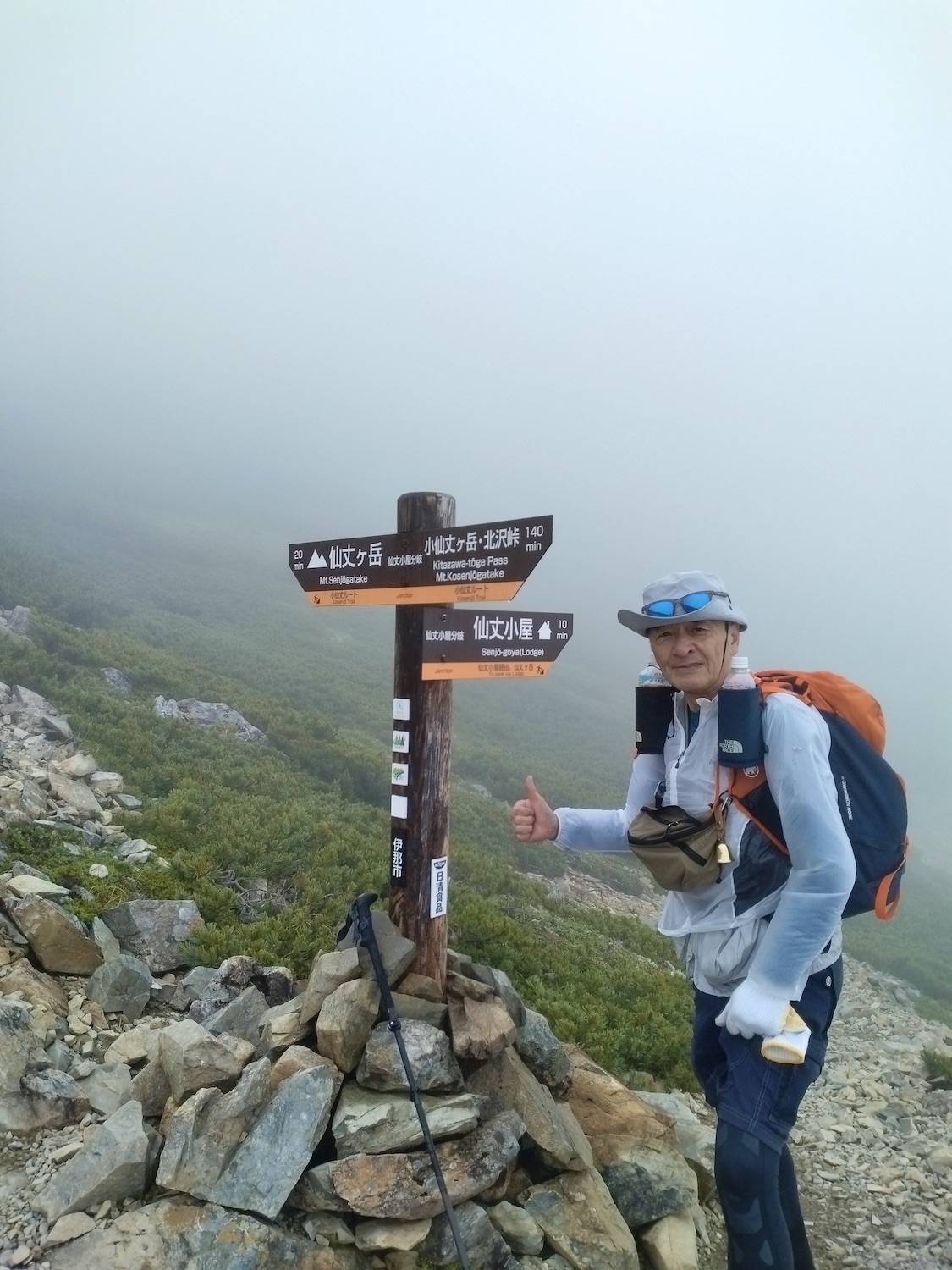 前日令和6年7月29日、山小屋「こもれび山荘」スタッフより『明日は昼前から天気が崩れ昼過ぎ雨になるが、明後日31日は好天の予報です』と報告があった。同行の園田君山﨑君と相談し、メインの甲斐駒ヶ岳登山を31日に回し、今日30日は仙丈ヶ岳登山実施に予定変更した。 山荘は標高2000mで高い山に囲まれ、スマホは使えないしテレビ・新聞もなく、スタッフの情報だけが頼りである。 好天下の活動時間を長くしようと、朝食時間を4:30に早め、弁当を受け取って、5:15山荘を出発した。 山荘周辺の、白っぽい木肌の高木が天を突いて伸びる様に威厳と安らぎを感じたが、登山路に入っても同じだ。 時折樹間から覗く遠い山並みにも元気を貰う。 7:00前、五合目藪沢大滝の頭(2519m)到着。ここから直登し小仙丈ヶ岳をめざすルートを取る。 更に進むこと20分、木々が低くなり背後に鋸岳(2685m)の山並みが見える。そして多分、右手雲の中には木曽駒ヶ岳。 登ること更に5〜6分、刻々と変わる雲の動きが気になる。 と、急速にガスが広がり始め、瞬く間にガスに包まれ強風に見舞われた。山荘に戻ることも考えたが、取り敢えず休憩・補給して様子を見ることにした。 雨は降らず、時折ガスが薄らぐのを幸い、小仙丈ヶ岳(2864m)だけでも登ろうと決し登頂を再開した。 出発から3時間、8:20小仙丈ヶ岳撃破! 園田君、山﨑君の勇姿もガスに霞む。 ガス酷く強風吹く中だが、同じルートを引き返すのも能がないと、仙丈小屋・馬の背ヒュッテ経由で山荘に戻ることにした。山頂を後にする園田・山﨑両君の姿が見る見るガスに溶け込む。 仙丈ヶ岳へ連なる尾根沿いに歩いて、9時過ぎ仙丈小屋との分岐に到着。依然ガス・風が酷く眺望も期待できない。後ろ髪を引かれる思いで仙丈ヶ岳(3032m)登頂断念、仙丈小屋へ向かう・・。 10:00前、仙丈小屋に到着。来し方はガスの中。 ものの10分も経たずにガスが晴れる! 山小屋の厚意で弁当を持ち込んで昼食にした。熱いコーヒーをいただき20分ほど休憩して小屋を出ると仙丈ヶ岳がきれいに見える。 記念に写真を撮り10:00過ぎ仙丈小屋を発った。 10分ほどして振り返ると左に仙丈ヶ岳、右に大仙丈ヶ岳(2975m)、間に仙丈小屋が見える。 西に目を転じると遠く市街地が見える。 雲に隠れてるのは中央アルプスか? 更に40分ほど歩き馬の背へ向かう途中、小仙丈ヶ岳と仙丈ヶ岳を写真1枚に収めた。驚いたことに写真を拡大すると、右端近く仙丈小屋が写っている! デジタルカメラの凄さ? このゆったりした山容ゆえに仙丈ヶ岳は「南アルプスの女王」と呼ばれるらしい。因みに、明日登る甲斐駒ヶ岳は存在感と威圧感の大きさゆえに「山の団十郎」と言われるそうだ。 「馬の背」へ行く目的はお花畑だった。しかし、天気の心配もありここで中断、「馬の背ヒュッテ」へ急ぐことにした。 しか〜し、女王のお花畑は人に優しい。 馬の背ヒュッテへの登山道沿いこそお花畑! 上の黄色い花はマルバダケブギ。 次は有名なトリカブト、見る分には問題なし。 戸台川に連なる流れの傍にはクルマユリの花。 藪沢の流れ沿いをこもれび山荘へ下山開始して間もなく、12:30頃だったろうか、雨脚が一気に強くなり土砂降り状態・・。写真を撮るどころじゃない。 山荘に戻って登山リュックを改めると、中身はまさに水浸し状態。夕食時の明日は好天の言葉が今は救いだ。 途中、雨は収まり最後の山荘への道を歩く。この静寂にして幽玄な雰囲気がとても気に入った。3時前無事山荘に帰着。足の疲れがやや不安だが、ガスあり強風あり本降りの雨あり、勿論絶景あり。苦っ楽しい一日に乾杯〜!! (第1日 完) 『待った〜! タイトルの女神って何じゃい』 これは失礼。今日私は南アルプスの女王に会い、女神に出会った。女王については既に語った。女神について一言。 下りの終点の大平小屋前で休憩していると下山して来た女性が『このサックみなさんのじゃありませんか』 我が雨具サック・・。雨の降り始め、直ぐ使えるよう装着したのを落としたらしい。土砂降りの中、拾ってずっと持って来てくれたのだ! 『なかなかできることじゃないね』と友の言葉 『いや〜、彼女は俺の女神だよ』と私。 女王が見せてくれたさまざまな景色に劣らぬ感動を受け、穏やかで豊かな気持ちになった。『ありがとうございました』お礼は言ったが名前さえ聞いてない。改めてお礼を言えなかったのが心残りだ。