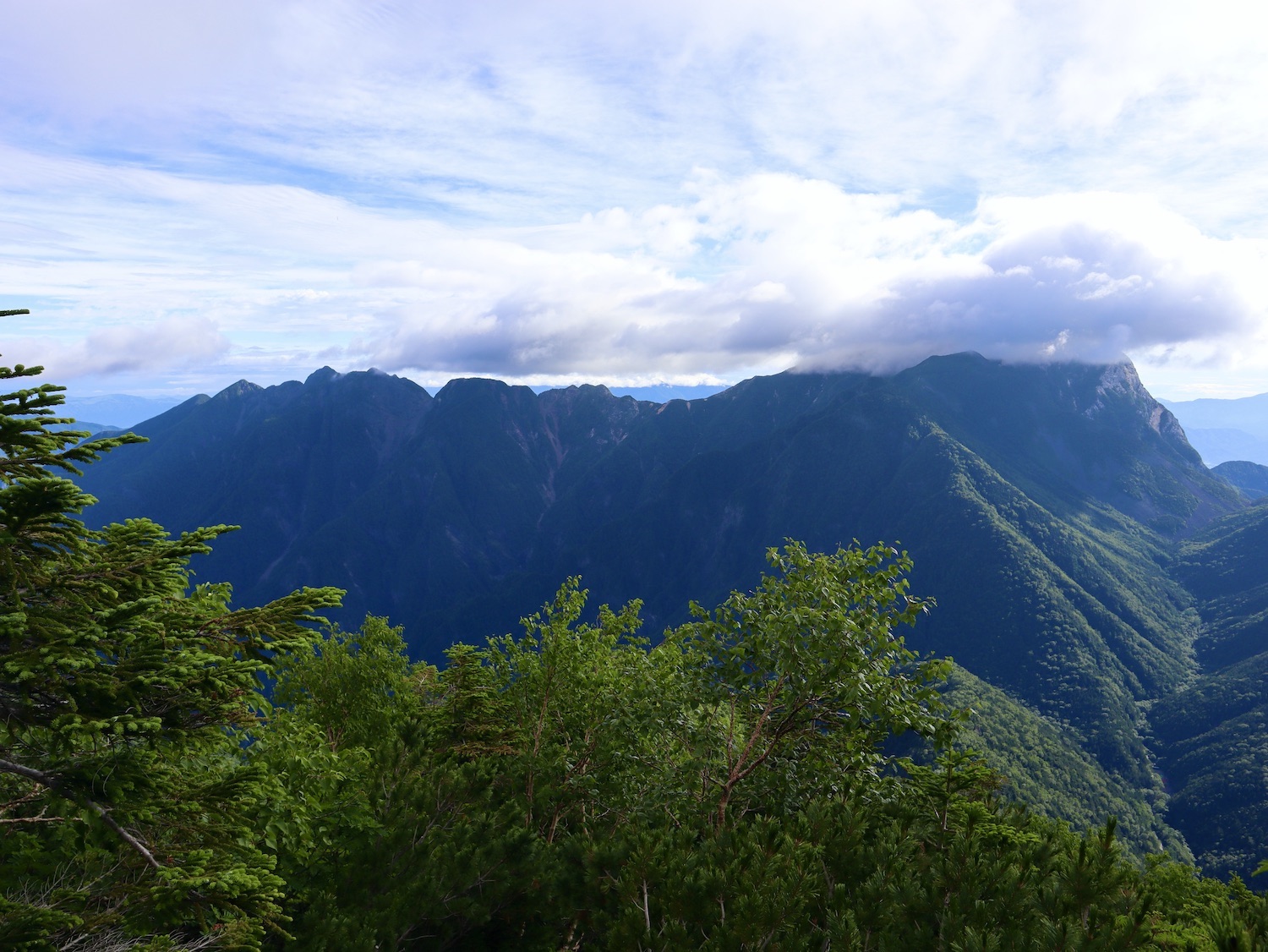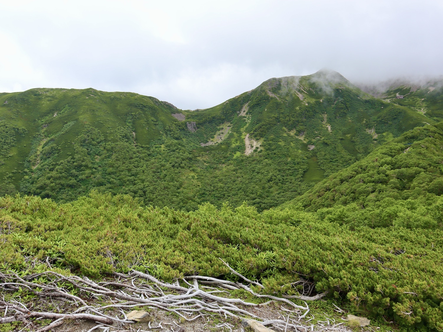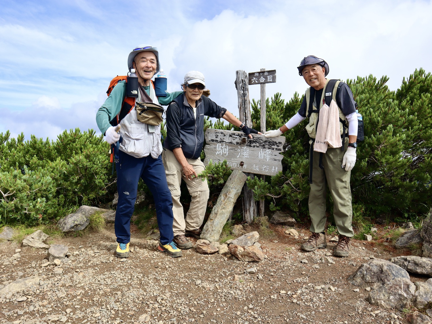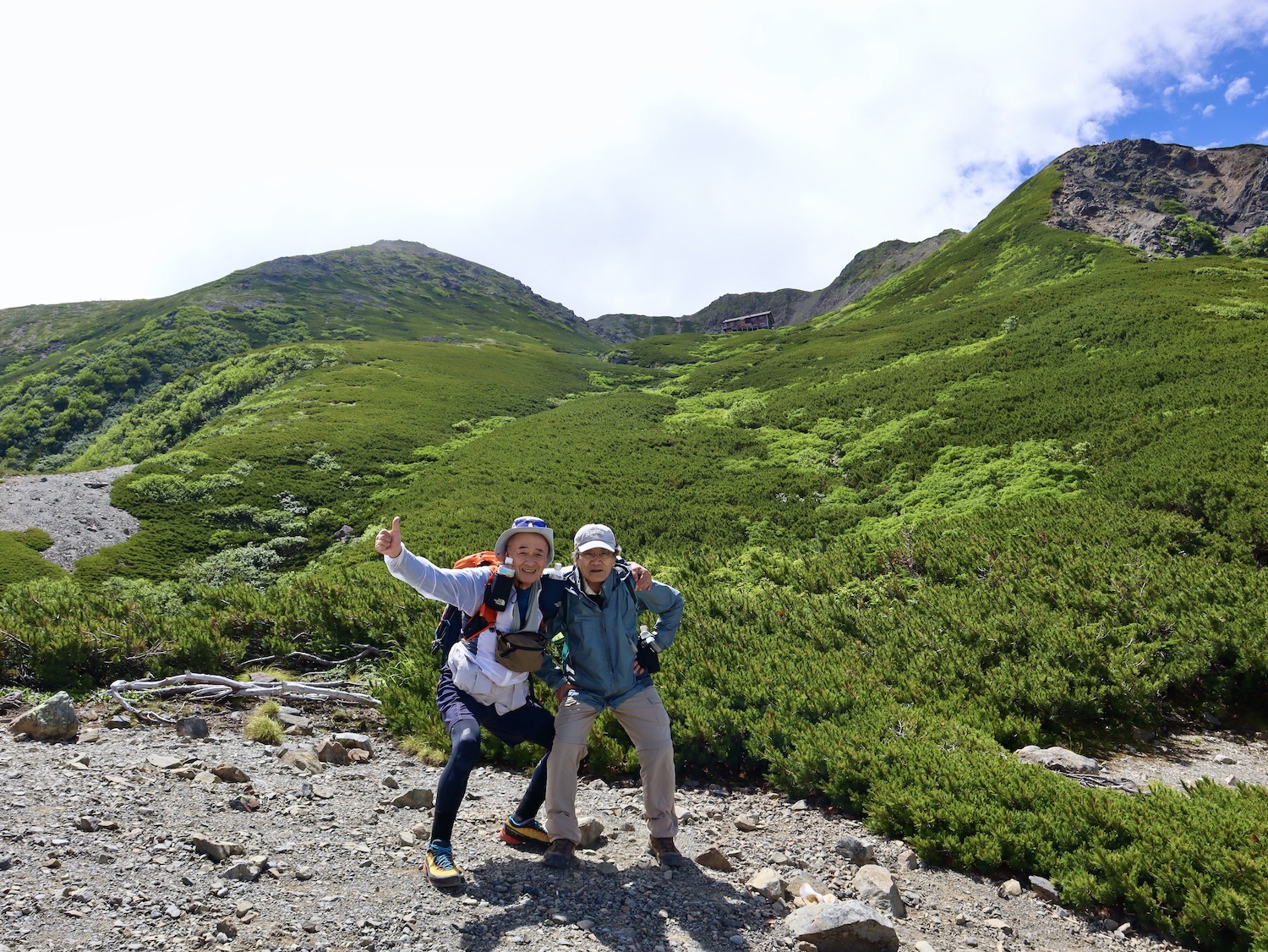 前日令和6年7月29日、山小屋「こもれび山荘」スタッフより『明日は昼前から天気が崩れ昼過ぎ雨になるが、明後日31日は好天の予報です』と報告があった。同行の園田君山﨑君と相談し、メインの甲斐駒ヶ岳登山を31日に回し、今日30日は仙丈ヶ岳登山実施に予定変更した。 山荘は標高2000mで高い山に囲まれ、スマホは使えないしテレビ・新聞もなく、スタッフの情報だけが頼りである。 好天下の活動時間を長くしようと、朝食時間を4:30に早め、弁当を受け取って、5:15山荘を出発した。 山荘周辺の、白っぽい木肌の高木が天を突いて伸びる様に威厳と安らぎを感じたが、登山路に入っても同じだ。 時折樹間から覗く遠い山並みにも元気を貰う。 7:00前、五合目藪沢大滝の頭(2519m)到着。ここから直登し小仙丈ヶ岳をめざすルートを取る。 更に進むこと20分、木々が低くなり背後に鋸岳(2685m)の山並みが見える。そして多分、右手雲の中には木曽駒ヶ岳。 登ること更に5〜6分、刻々と変わる雲の動きが気になる。 と、急速にガスが広がり始め、瞬く間にガスに包まれ強風に見舞われた。山荘に戻ることも考えたが、取り敢えず休憩・補給して様子を見ることにした。 雨は降らず、時折ガスが薄らぐのを幸い、小仙丈ヶ岳(2864m)だけでも登ろうと決し登頂を再開した。 出発から3時間、8:20小仙丈ヶ岳撃破! 園田君、山﨑君の勇姿もガスに霞む。 ガス酷く強風吹く中だが、同じルートを引き返すのも能がないと、仙丈小屋・馬の背ヒュッテ経由で山荘に戻ることにした。山頂を後にする園田・山﨑両君の姿が見る見るガスに溶け込む。 仙丈ヶ岳へ連なる尾根沿いに歩いて、9時過ぎ仙丈小屋との分岐に到着。依然ガス・風が酷く眺望も期待できない。後ろ髪を引かれる思いで仙丈ヶ岳(3032m)登頂断念、仙丈小屋へ向かう・・。 10:00前、仙丈小屋に到着。来し方はガスの中。 ものの10分も経たずにガスが晴れる! 山小屋の厚意で弁当を持ち込んで昼食にした。熱いコーヒーをいただき20分ほど休憩して小屋を出ると仙丈ヶ岳がきれいに見える。 記念に写真を撮り10:00過ぎ仙丈小屋を発った。 10分ほどして振り返ると左に仙丈ヶ岳、右に大仙丈ヶ岳(2975m)、間に仙丈小屋が見える。 西に目を転じると遠く市街地が見える。 雲に隠れてるのは中央アルプスか? 更に40分ほど歩き馬の背へ向かう途中、小仙丈ヶ岳と仙丈ヶ岳を写真1枚に収めた。驚いたことに写真を拡大すると、右端近く仙丈小屋が写っている! デジタルカメラの凄さ? このゆったりした山容ゆえに仙丈ヶ岳は「南アルプスの女王」と呼ばれるらしい。因みに、明日登る甲斐駒ヶ岳は存在感と威圧感の大きさゆえに「山の団十郎」と言われるそうだ。 「馬の背」へ行く目的はお花畑だった。しかし、天気の心配もありここで中断、「馬の背ヒュッテ」へ急ぐことにした。 しか〜し、女王のお花畑は人に優しい。 馬の背ヒュッテへの登山道沿いこそお花畑! 上の黄色い花はマルバダケブギ。 次は有名なトリカブト、見る分には問題なし。 戸台川に連なる流れの傍にはクルマユリの花。 藪沢の流れ沿いをこもれび山荘へ下山開始して間もなく、12:30頃だったろうか、雨脚が一気に強くなり土砂降り状態・・。写真を撮るどころじゃない。 山荘に戻って登山リュックを改めると、中身はまさに水浸し状態。夕食時の明日は好天の言葉が今は救いだ。 途中、雨は収まり最後の山荘への道を歩く。この静寂にして幽玄な雰囲気がとても気に入った。3時前無事山荘に帰着。足の疲れがやや不安だが、ガスあり強風あり本降りの雨あり、勿論絶景あり。苦っ楽しい一日に乾杯〜!! (第1日 完) 『待った〜! タイトルの女神って何じゃい』 これは失礼。今日私は南アルプスの女王に会い、女神に出会った。女王については既に語った。女神について一言。 下りの終点の大平小屋前で休憩していると下山して来た女性が『このサックみなさんのじゃありませんか』 我が雨具サック・・。雨の降り始め、直ぐ使えるよう装着したのを落としたらしい。土砂降りの中、拾ってずっと持って来てくれたのだ! 『なかなかできることじゃないね』と友の言葉 『いや〜、彼女は俺の女神だよ』と私。 女王が見せてくれたさまざまな景色に劣らぬ感動を受け、穏やかで豊かな気持ちになった。『ありがとうございました』お礼は言ったが名前さえ聞いてない。改めてお礼を言えなかったのが心残りだ。
