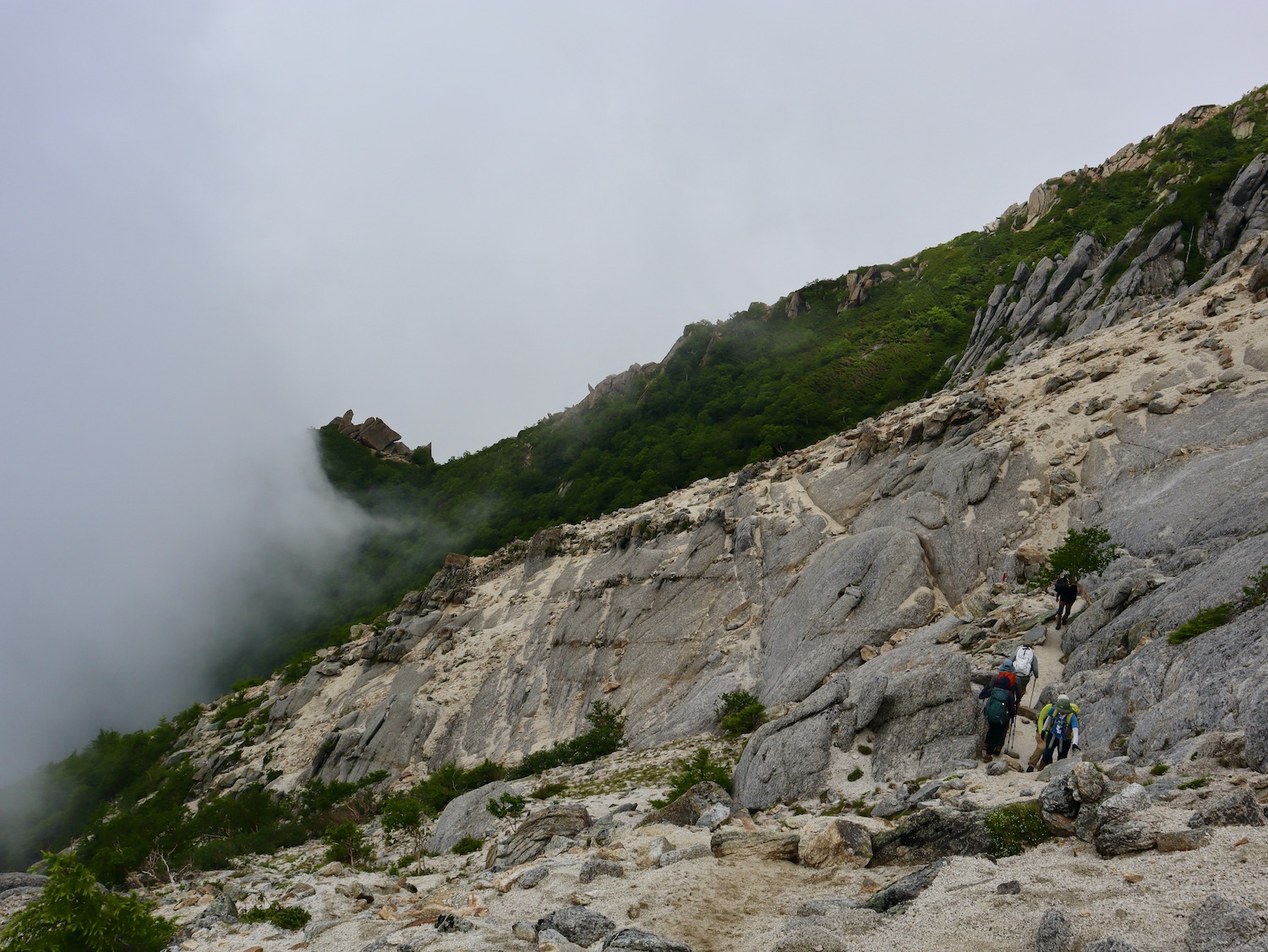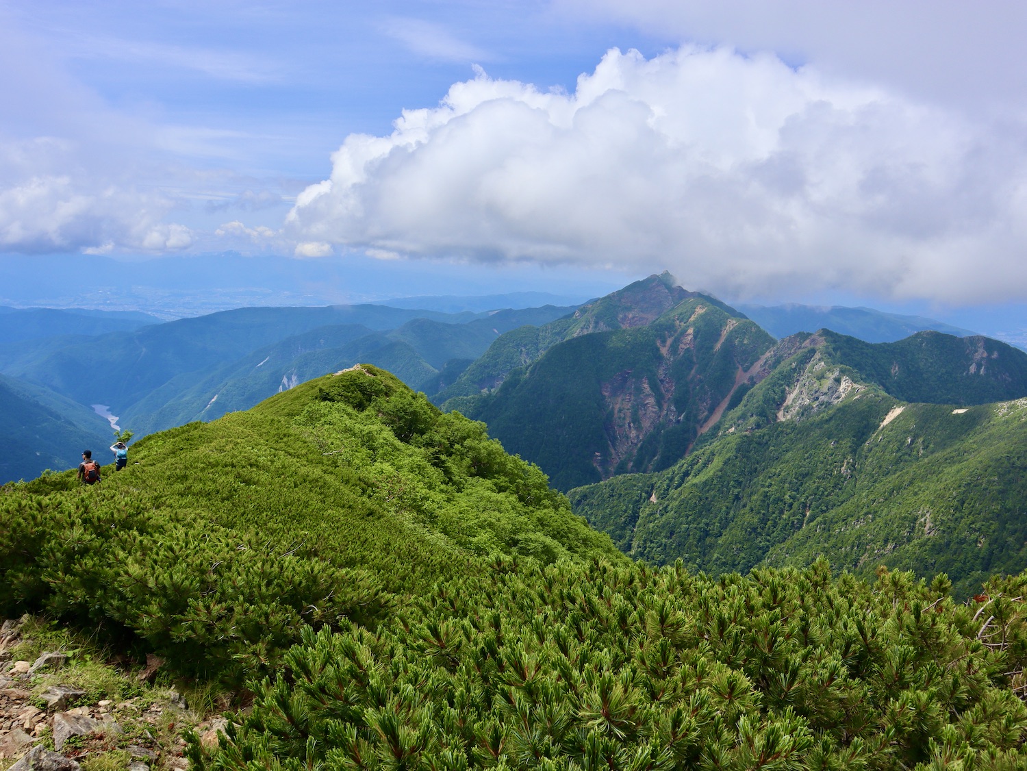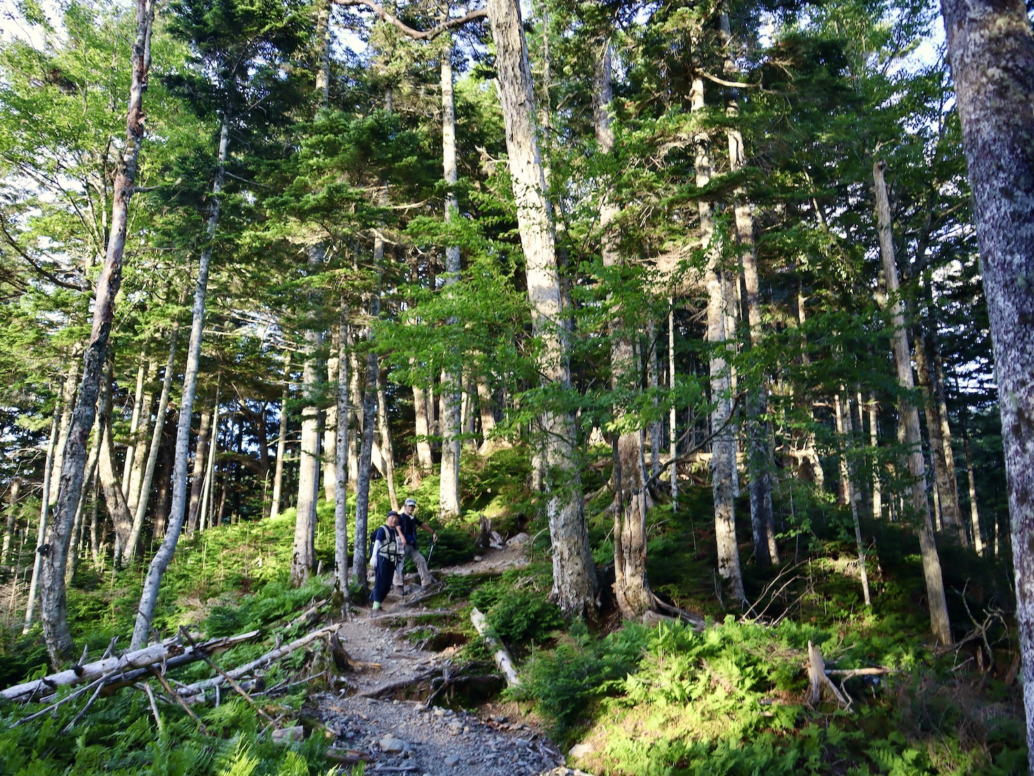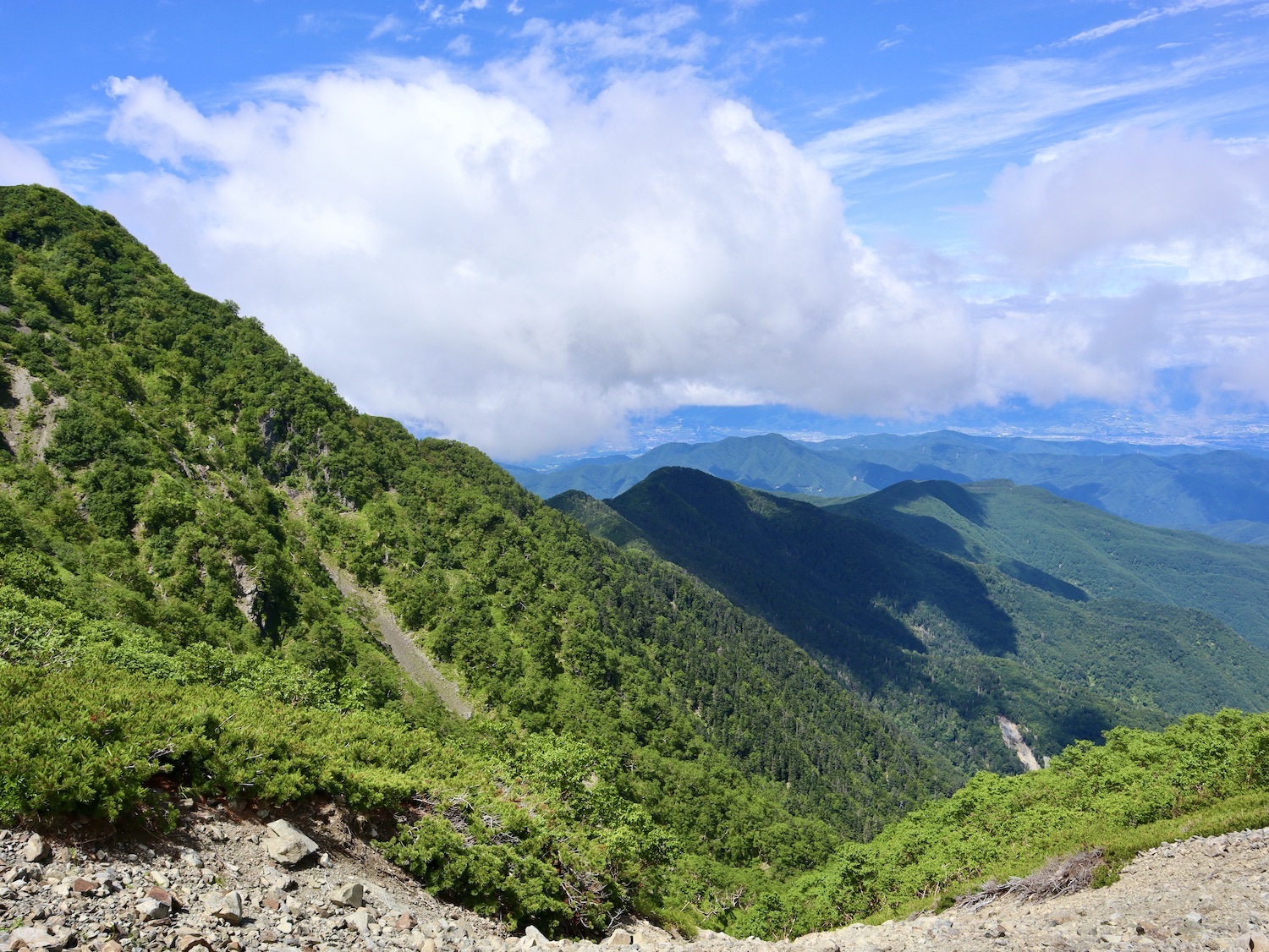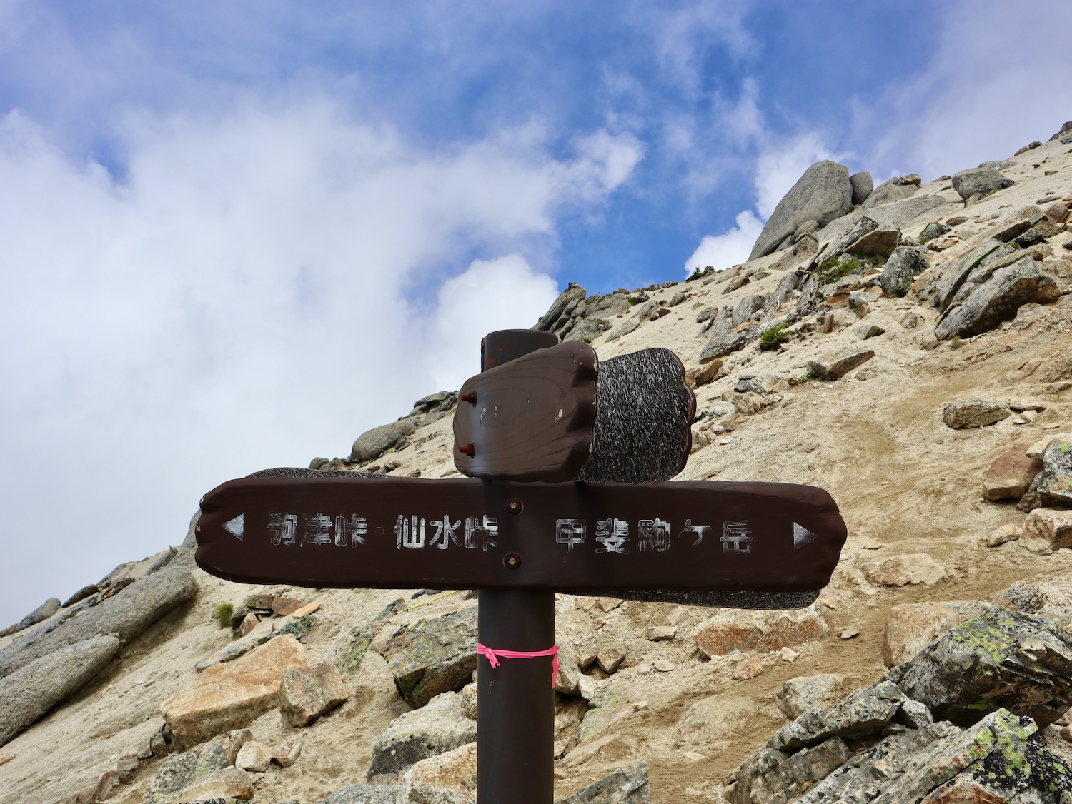 前日令和6年7月29日、山小屋「こもれび山荘」スタッフより『明日は昼前から天気が崩れ昼過ぎ雨になるが、明後日31日は好天の予報です』と報告があった。同行の園田君山﨑君と相談し、メインの甲斐駒ヶ岳登山を31日に回し、今日30日は仙丈ヶ岳登山実施に予定変更した。 山荘は標高2000mで高い山に囲まれ、スマホは使えないしテレビ・新聞もなく、スタッフの情報だけが頼りである。 好天下の活動時間を長くしようと、朝食時間を4:30に早め、弁当を受け取って、5:15山荘を出発した。 山荘周辺の、白っぽい木肌の高木が天を突いて伸びる様に威厳と安らぎを感じたが、登山路に入っても同じだ。 時折樹間から覗く遠い山並みにも元気を貰う。 7:00前、五合目藪沢大滝の頭(2519m)到着。ここから直登し小仙丈ヶ岳をめざすルートを取る。 更に進むこと20分、木々が低くなり背後に鋸岳(2685m)の山並みが見える。そして多分、右手雲の中には木曽駒ヶ岳。 登ること更に5〜6分、刻々と変わる雲の動きが気になる。 と、急速にガスが広がり始め、瞬く間にガスに包まれ強風に見舞われた。山荘に戻ることも考えたが、取り敢えず休憩・補給して様子を見ることにした。 雨は降らず、時折ガスが薄らぐのを幸い、小仙丈ヶ岳(2864m)だけでも登ろうと決し登頂を再開した。 出発から3時間、8:20小仙丈ヶ岳撃破! 園田君、山﨑君の勇姿もガスに霞む。 ガス酷く強風吹く中だが、同じルートを引き返すのも能がないと、仙丈小屋・馬の背ヒュッテ経由で山荘に戻ることにした。山頂を後にする園田・山﨑両君の姿が見る見るガスに溶け込む。 仙丈ヶ岳へ連なる尾根沿いに歩いて、9時過ぎ仙丈小屋との分岐に到着。依然ガス・風が酷く眺望も期待できない。後ろ髪を引かれる思いで仙丈ヶ岳(3032m)登頂断念、仙丈小屋へ向かう・・。 10:00前、仙丈小屋に到着。来し方はガスの中。 ものの10分も経たずにガスが晴れる! 山小屋の厚意で弁当を持ち込んで昼食にした。熱いコーヒーをいただき20分ほど休憩して小屋を出ると仙丈ヶ岳がきれいに見える。 記念に写真を撮り10:00過ぎ仙丈小屋を発った。 10分ほどして振り返ると左に仙丈ヶ岳、右に大仙丈ヶ岳(2975m)、間に仙丈小屋が見える。 西に目を転じると遠く市街地が見える。 雲に隠れてるのは中央アルプスか? 更に40分ほど歩き馬の背へ向かう途中、小仙丈ヶ岳と仙丈ヶ岳を写真1枚に収めた。驚いたことに写真を拡大すると、右端近く仙丈小屋が写っている! デジタルカメラの凄さ? このゆったりした山容ゆえに仙丈ヶ岳は「南アルプスの女王」と呼ばれるらしい。因みに、明日登る甲斐駒ヶ岳は存在感と威圧感の大きさゆえに「山の団十郎」と言われるそうだ。 「馬の背」へ行く目的はお花畑だった。しかし、天気の心配もありここで中断、「馬の背ヒュッテ」へ急ぐことにした。 しか〜し、女王のお花畑は人に優しい。 馬の背ヒュッテへの登山道沿いこそお花畑! 上の黄色い花はマルバダケブギ。 次は有名なトリカブト、見る分には問題なし。 戸台川に連なる流れの傍にはクルマユリの花。 藪沢の流れ沿いをこもれび山荘へ下山開始して間もなく、12:30頃だったろうか、雨脚が一気に強くなり土砂降り状態・・。写真を撮るどころじゃない。 山荘に戻って登山リュックを改めると、中身はまさに水浸し状態。夕食時の明日は好天の言葉が今は救いだ。 途中、雨は収まり最後の山荘への道を歩く。この静寂にして幽玄な雰囲気がとても気に入った。3時前無事山荘に帰着。足の疲れがやや不安だが、ガスあり強風あり本降りの雨あり、勿論絶景あり。苦っ楽しい一日に乾杯〜!! (第1日 完) 『待った〜! タイトルの女神って何じゃい』 これは失礼。今日私は南アルプスの女王に会い、女神に出会った。女王については既に語った。女神について一言。 下りの終点の大平小屋前で休憩していると下山して来た女性が『このサックみなさんのじゃありませんか』 我が雨具サック・・。雨の降り始め、直ぐ使えるよう装着したのを落としたらしい。土砂降りの中、拾ってずっと持って来てくれたのだ! 『なかなかできることじゃないね』と友の言葉 『いや〜、彼女は俺の女神だよ』と私。 女王が見せてくれたさまざまな景色に劣らぬ感動を受け、穏やかで豊かな気持ちになった。『ありがとうございました』お礼は言ったが名前さえ聞いてない。改めてお礼を言えなかったのが心残りだ。