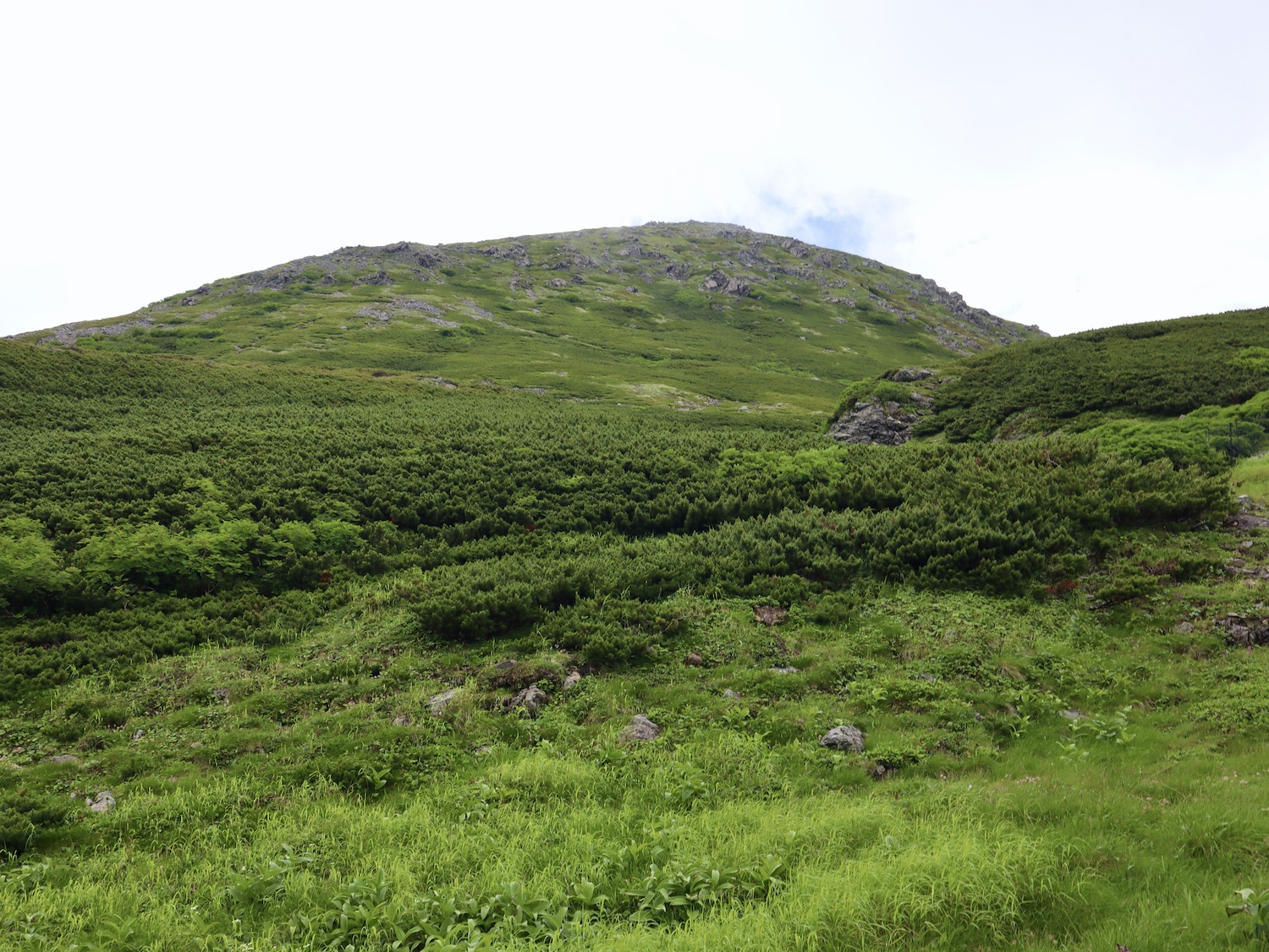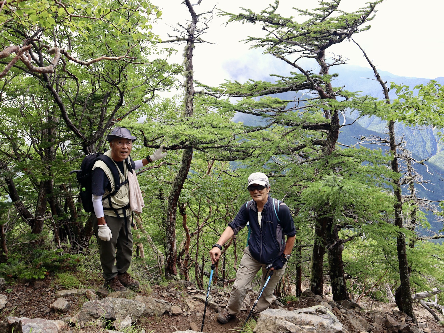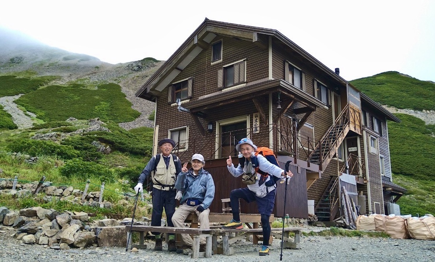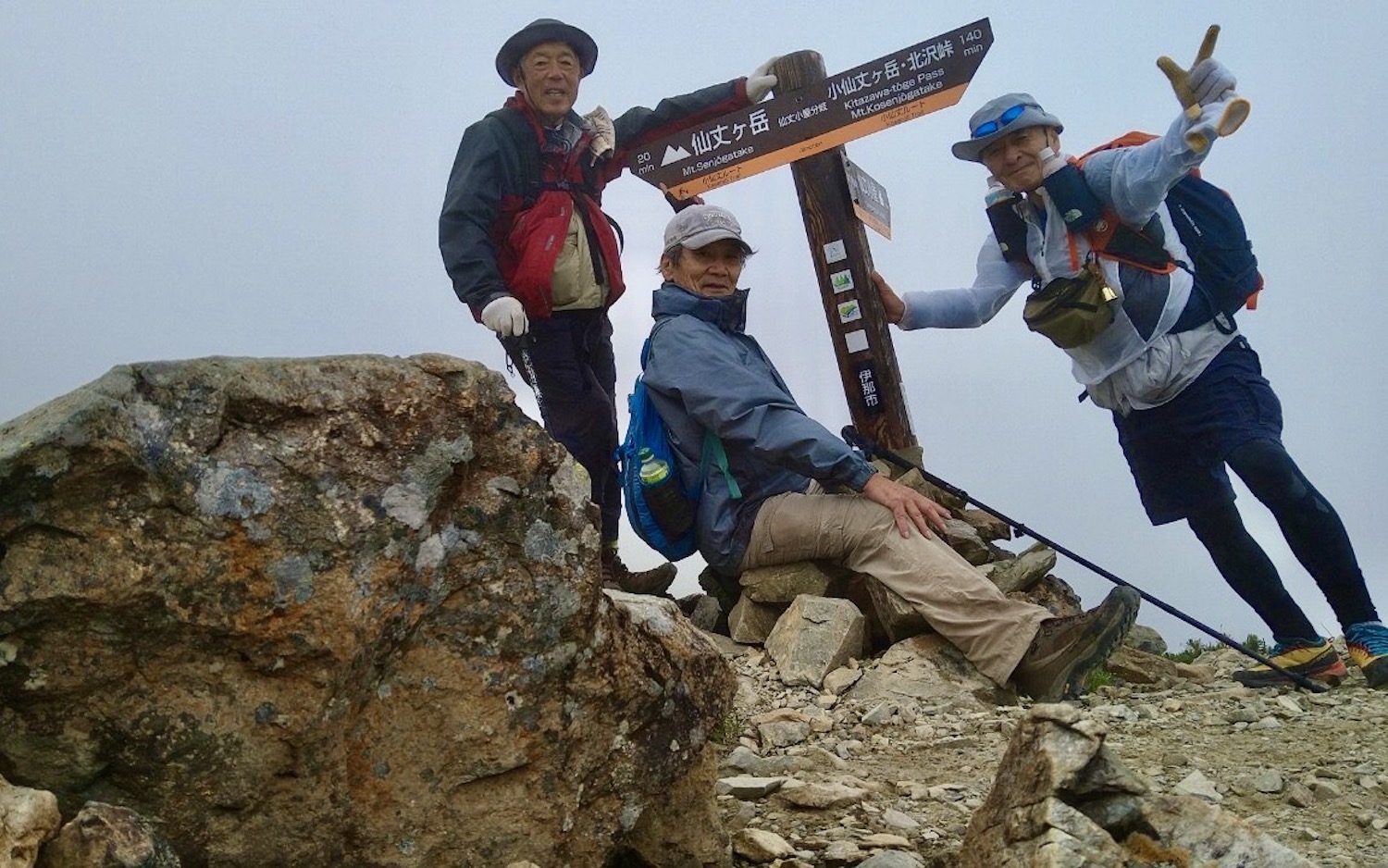 前日令和6年7月29日、山小屋「こもれび山荘」スタッフより『明日は昼前から天気が崩れ昼過ぎ雨になるが、明後日31日は好天の予報です』と報告があった。同行の園田君山﨑君と相談し、メインの甲斐駒ヶ岳登山を31日に回し、今日30日は仙丈ヶ岳登山実施に予定変更した。 山荘は標高2000mで高い山に囲まれ、スマホは使えないしテレビ・新聞もなく、スタッフの情報だけが頼りである。 好天下の活動時間を長くしようと、朝食時間を4:30に早め、弁当を受け取って、5:15山荘を出発した。 山荘周辺の、白っぽい木肌の高木が天を突いて伸びる様に威厳と安らぎを感じたが、登山路に入っても同じだ。 時折樹間から覗く遠い山並みにも元気を貰う。 7:00前、五合目藪沢大滝の頭(2519m)到着。ここから直登し小仙丈ヶ岳をめざすルートを取る。 更に進むこと20分、木々が低くなり背後に鋸岳(2685m)の山並みが見える。そして多分、右手雲の中には木曽駒ヶ岳。 登ること更に5〜6分、刻々と変わる雲の動きが気になる。 と、急速にガスが広がり始め、瞬く間にガスに包まれ強風に見舞われた。山荘に戻ることも考えたが、取り敢えず休憩・補給して様子を見ることにした。 雨は降らず、時折ガスが薄らぐのを幸い、小仙丈ヶ岳(2864m)だけでも登ろうと決し登頂を再開した。 出発から3時間、8:20小仙丈ヶ岳撃破! 園田君、山﨑君の勇姿もガスに霞む。 ガス酷く強風吹く中だが、同じルートを引き返すのも能がないと、仙丈小屋・馬の背ヒュッテ経由で山荘に戻ることにした。山頂を後にする園田・山﨑両君の姿が見る見るガスに溶け込む。 仙丈ヶ岳へ連なる尾根沿いに歩いて、9時過ぎ仙丈小屋との分岐に到着。依然ガス・風が酷く眺望も期待できない。後ろ髪を引かれる思いで仙丈ヶ岳(3032m)登頂断念、仙丈小屋へ向かう・・。 10:00前、仙丈小屋に到着。来し方はガスの中。 ものの10分も経たずにガスが晴れる! 山小屋の厚意で弁当を持ち込んで昼食にした。熱いコーヒーをいただき20分ほど休憩して小屋を出ると仙丈ヶ岳がきれいに見える。 記念に写真を撮り10:00過ぎ仙丈小屋を発った。 10分ほどして振り返ると左に仙丈ヶ岳、右に大仙丈ヶ岳(2975m)、間に仙丈小屋が見える。 西に目を転じると遠く市街地が見える。 雲に隠れてるのは中央アルプスか? 更に40分ほど歩き馬の背へ向かう途中、小仙丈ヶ岳と仙丈ヶ岳を写真1枚に収めた。驚いたことに写真を拡大すると、右端近く仙丈小屋が写っている! デジタルカメラの凄さ? このゆったりした山容ゆえに仙丈ヶ岳は「南アルプスの女王」と呼ばれるらしい。因みに、明日登る甲斐駒ヶ岳は存在感と威圧感の大きさゆえに「山の団十郎」と言われるそうだ。 「馬の背」へ行く目的はお花畑だった。しかし、天気の心配もありここで中断、「馬の背ヒュッテ」へ急ぐことにした。 しか〜し、女王のお花畑は人に優しい。 馬の背ヒュッテへの登山道沿いこそお花畑! 上の黄色い花はマルバダケブギ。 次は有名なトリカブト、見る分には問題なし。 戸台川に連なる流れの傍にはクルマユリの花。 藪沢の流れ沿いをこもれび山荘へ下山開始して間もなく、12:30頃だったろうか、雨脚が一気に強くなり土砂降り状態・・。写真を撮るどころじゃない。 山荘に戻って登山リュックを改めると、中身はまさに水浸し状態。夕食時の明日は好天の言葉が今は救いだ。 途中、雨は収まり最後の山荘への道を歩く。この静寂にして幽玄な雰囲気がとても気に入った。3時前無事山荘に帰着。足の疲れがやや不安だが、ガスあり強風あり本降りの雨あり、勿論絶景あり。苦っ楽しい一日に乾杯〜!! (第1日 完) 『待った〜! タイトルの女神って何じゃい』 これは失礼。今日私は南アルプスの女王に会い、女神に出会った。女王については既に語った。女神について一言。 下りの終点の大平小屋前で休憩していると下山して来た女性が『このサックみなさんのじゃありませんか』 我が雨具サック・・。雨の降り始め、直ぐ使えるよう装着したのを落としたらしい。土砂降りの中、拾ってずっと持って来てくれたのだ! 『なかなかできることじゃないね』と友の言葉 『いや〜、彼女は俺の女神だよ』と私。 女王が見せてくれたさまざまな景色に劣らぬ感動を受け、穏やかで豊かな気持ちになった。『ありがとうございました』お礼は言ったが名前さえ聞いてない。改めてお礼を言えなかったのが心残りだ。
