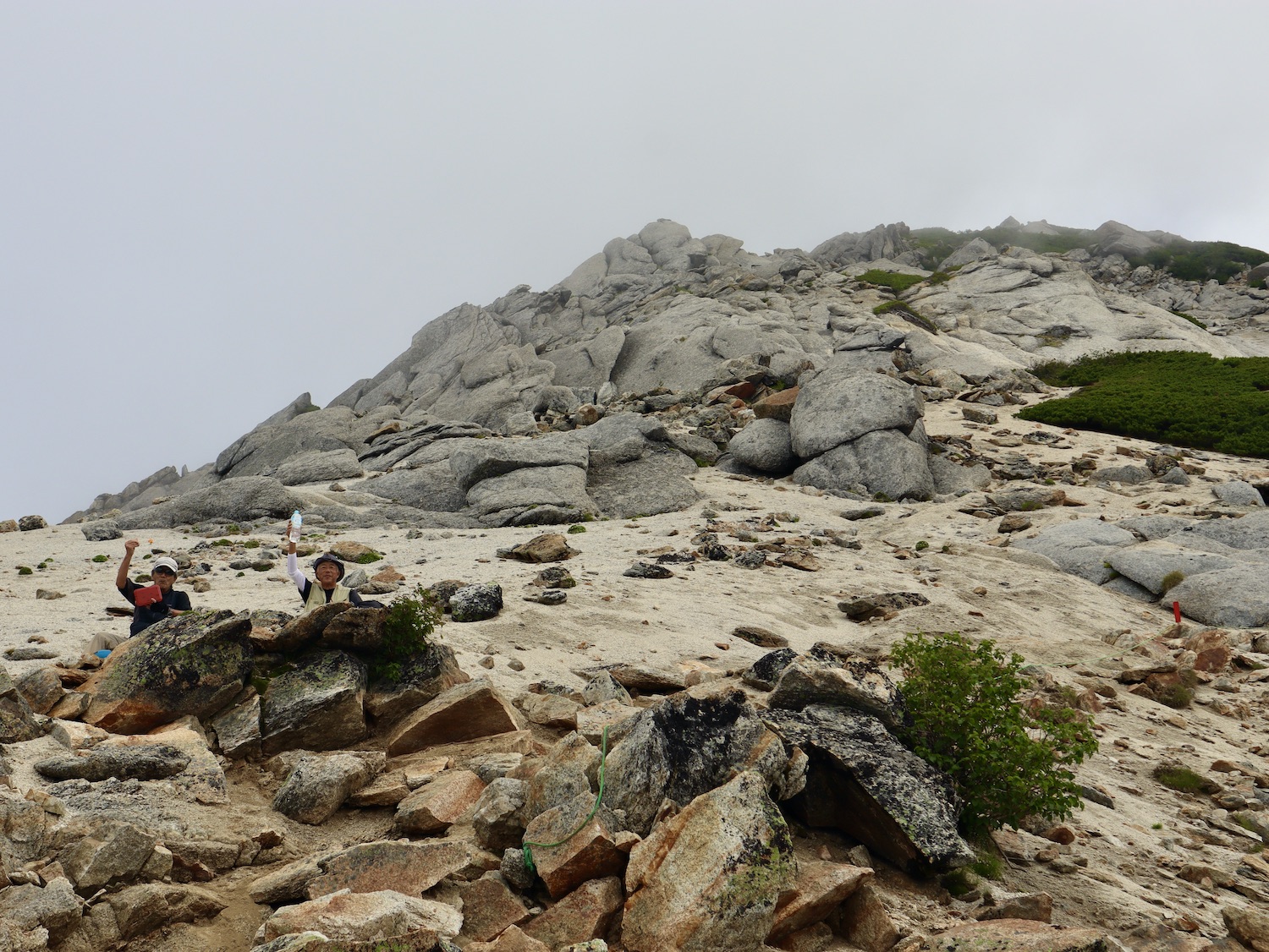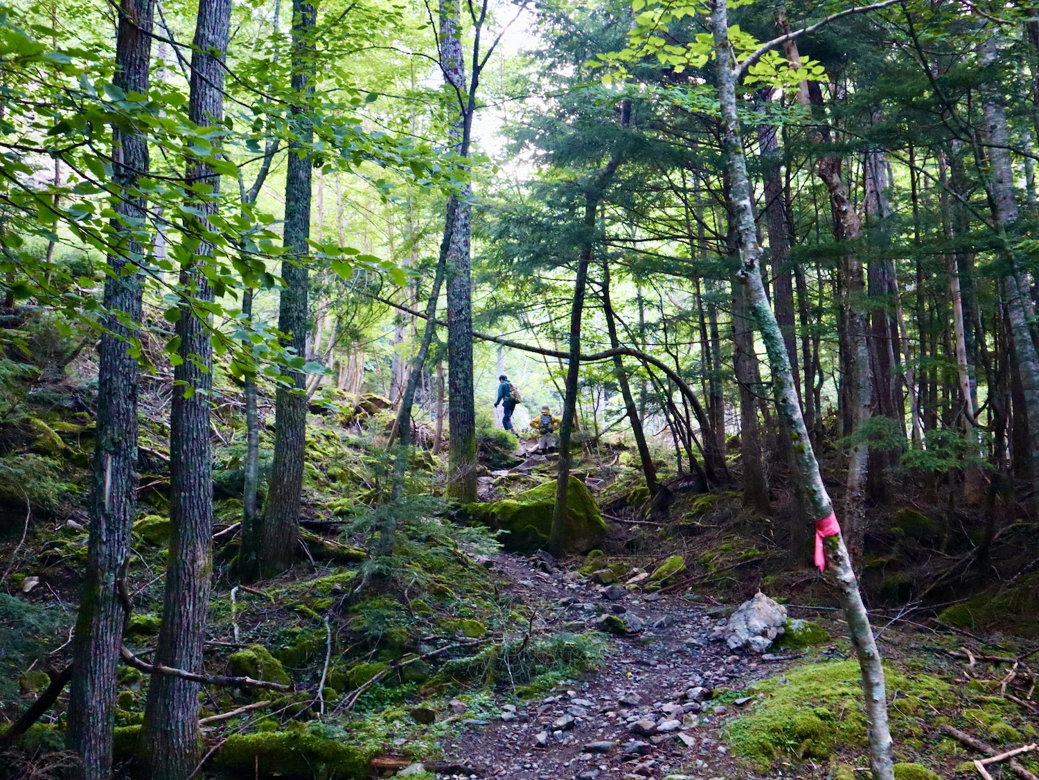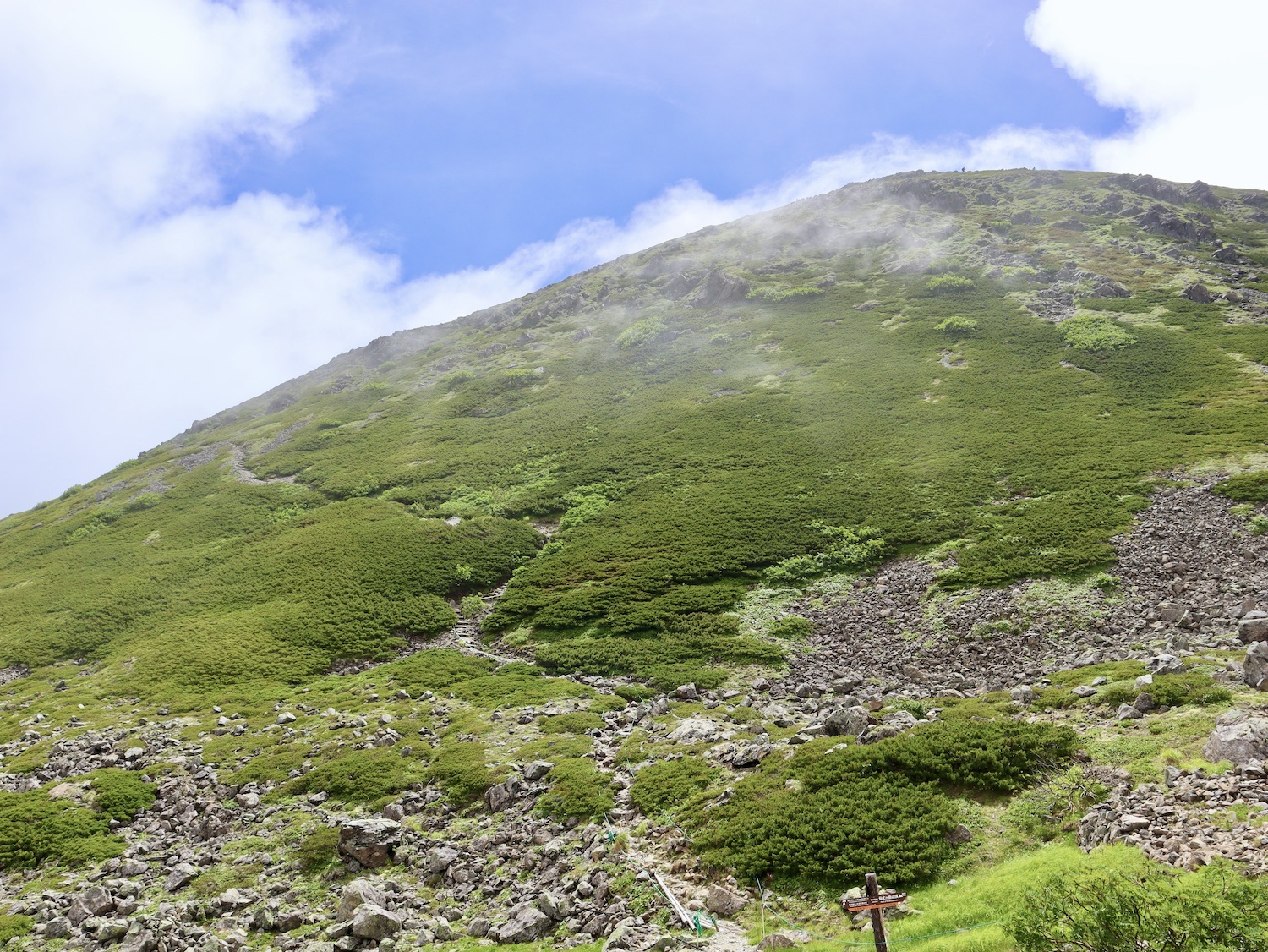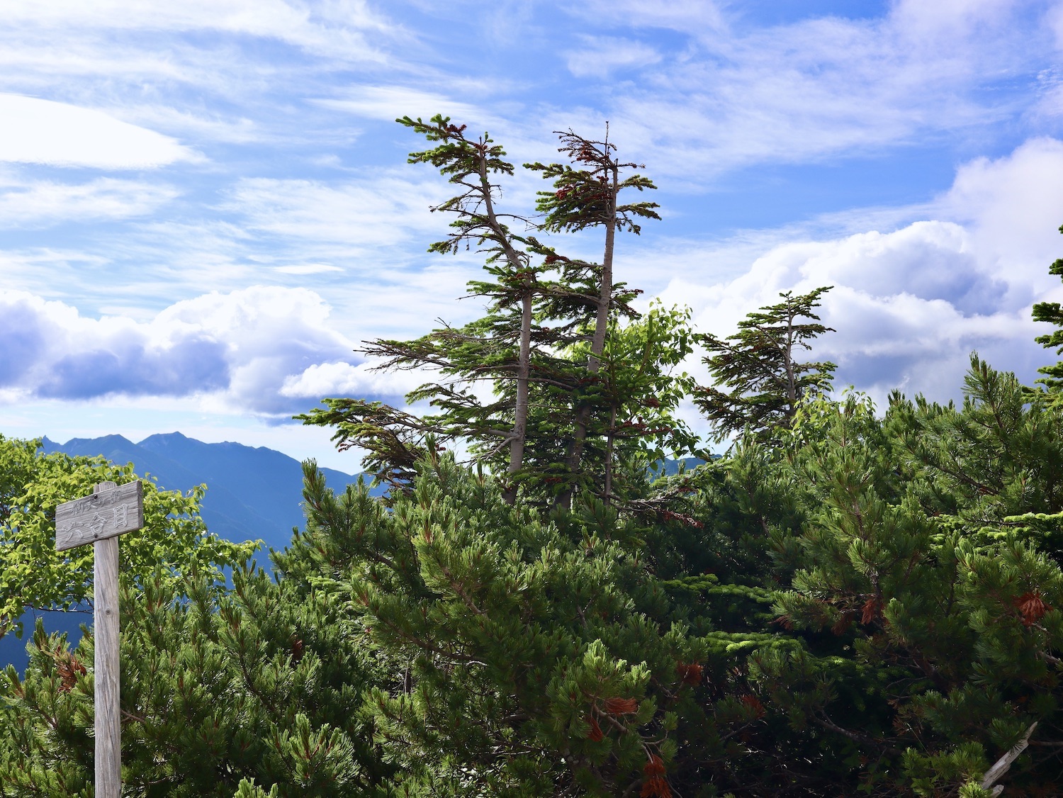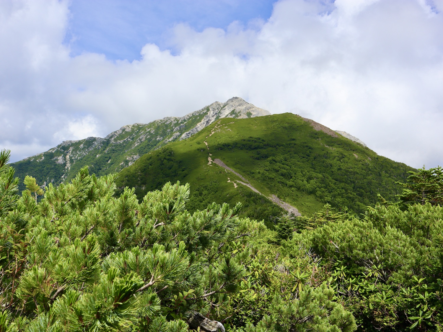 前日令和6年7月29日、山小屋「こもれび山荘」スタッフより『明日は昼前から天気が崩れ昼過ぎ雨になるが、明後日31日は好天の予報です』と報告があった。同行の園田君山﨑君と相談し、メインの甲斐駒ヶ岳登山を31日に回し、今日30日は仙丈ヶ岳登山実施に予定変更した。 山荘は標高2000mで高い山に囲まれ、スマホは使えないしテレビ・新聞もなく、スタッフの情報だけが頼りである。 好天下の活動時間を長くしようと、朝食時間を4:30に早め、弁当を受け取って、5:15山荘を出発した。 山荘周辺の、白っぽい木肌の高木が天を突いて伸びる様に威厳と安らぎを感じたが、登山路に入っても同じだ。 時折樹間から覗く遠い山並みにも元気を貰う。 7:00前、五合目藪沢大滝の頭(2519m)到着。ここから直登し小仙丈ヶ岳をめざすルートを取る。 更に進むこと20分、木々が低くなり背後に鋸岳(2685m)の山並みが見える。そして多分、右手雲の中には木曽駒ヶ岳。 登ること更に5〜6分、刻々と変わる雲の動きが気になる。 と、急速にガスが広がり始め、瞬く間にガスに包まれ強風に見舞われた。山荘に戻ることも考えたが、取り敢えず休憩・補給して様子を見ることにした。 雨は降らず、時折ガスが薄らぐのを幸い、小仙丈ヶ岳(2864m)だけでも登ろうと決し登頂を再開した。 出発から3時間、8:20小仙丈ヶ岳撃破! 園田君、山﨑君の勇姿もガスに霞む。 ガス酷く強風吹く中だが、同じルートを引き返すのも能がないと、仙丈小屋・馬の背ヒュッテ経由で山荘に戻ることにした。山頂を後にする園田・山﨑両君の姿が見る見るガスに溶け込む。 仙丈ヶ岳へ連なる尾根沿いに歩いて、9時過ぎ仙丈小屋との分岐に到着。依然ガス・風が酷く眺望も期待できない。後ろ髪を引かれる思いで仙丈ヶ岳(3032m)登頂断念、仙丈小屋へ向かう・・。 10:00前、仙丈小屋に到着。来し方はガスの中。 ものの10分も経たずにガスが晴れる! 山小屋の厚意で弁当を持ち込んで昼食にした。熱いコーヒーをいただき20分ほど休憩して小屋を出ると仙丈ヶ岳がきれいに見える。 記念に写真を撮り10:00過ぎ仙丈小屋を発った。 10分ほどして振り返ると左に仙丈ヶ岳、右に大仙丈ヶ岳(2975m)、間に仙丈小屋が見える。 西に目を転じると遠く市街地が見える。 雲に隠れてるのは中央アルプスか? 更に40分ほど歩き馬の背へ向かう途中、小仙丈ヶ岳と仙丈ヶ岳を写真1枚に収めた。驚いたことに写真を拡大すると、右端近く仙丈小屋が写っている! デジタルカメラの凄さ? このゆったりした山容ゆえに仙丈ヶ岳は「南アルプスの女王」と呼ばれるらしい。因みに、明日登る甲斐駒ヶ岳は存在感と威圧感の大きさゆえに「山の団十郎」と言われるそうだ。 「馬の背」へ行く目的はお花畑だった。しかし、天気の心配もありここで中断、「馬の背ヒュッテ」へ急ぐことにした。 しか〜し、女王のお花畑は人に優しい。 馬の背ヒュッテへの登山道沿いこそお花畑! 上の黄色い花はマルバダケブギ。 次は有名なトリカブト、見る分には問題なし。 戸台川に連なる流れの傍にはクルマユリの花。 藪沢の流れ沿いをこもれび山荘へ下山開始して間もなく、12:30頃だったろうか、雨脚が一気に強くなり土砂降り状態・・。写真を撮るどころじゃない。 山荘に戻って登山リュックを改めると、中身はまさに水浸し状態。夕食時の明日は好天の言葉が今は救いだ。 途中、雨は収まり最後の山荘への道を歩く。この静寂にして幽玄な雰囲気がとても気に入った。3時前無事山荘に帰着。足の疲れがやや不安だが、ガスあり強風あり本降りの雨あり、勿論絶景あり。苦っ楽しい一日に乾杯〜!! (第1日 完) 『待った〜! タイトルの女神って何じゃい』 これは失礼。今日私は南アルプスの女王に会い、女神に出会った。女王については既に語った。女神について一言。 下りの終点の大平小屋前で休憩していると下山して来た女性が『このサックみなさんのじゃありませんか』 我が雨具サック・・。雨の降り始め、直ぐ使えるよう装着したのを落としたらしい。土砂降りの中、拾ってずっと持って来てくれたのだ! 『なかなかできることじゃないね』と友の言葉 『いや〜、彼女は俺の女神だよ』と私。 女王が見せてくれたさまざまな景色に劣らぬ感動を受け、穏やかで豊かな気持ちになった。『ありがとうございました』お礼は言ったが名前さえ聞いてない。改めてお礼を言えなかったのが心残りだ。