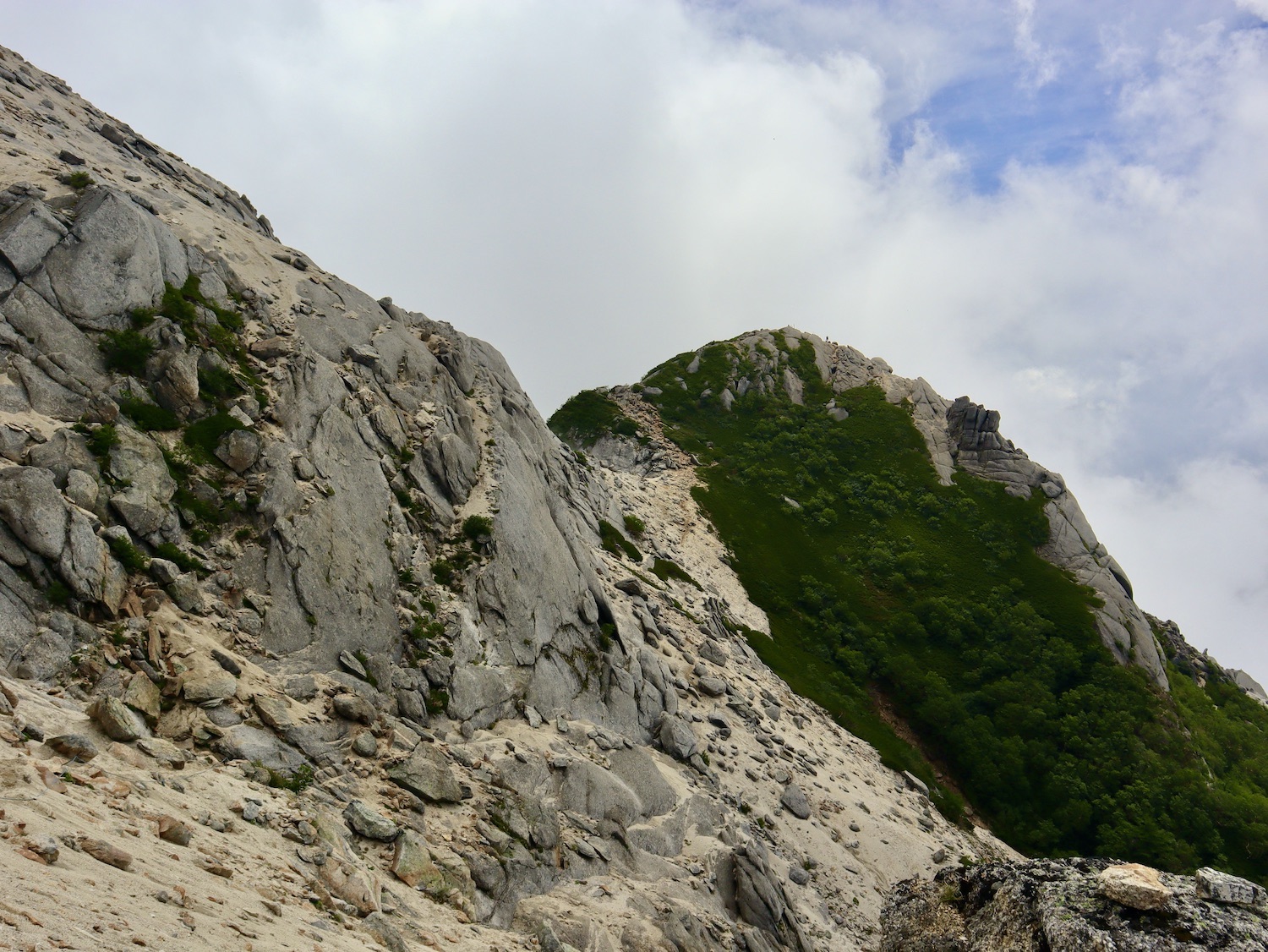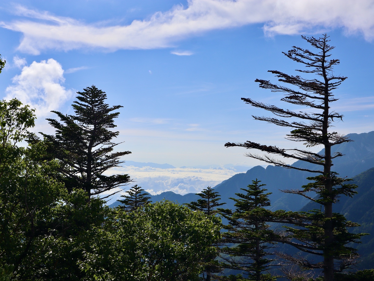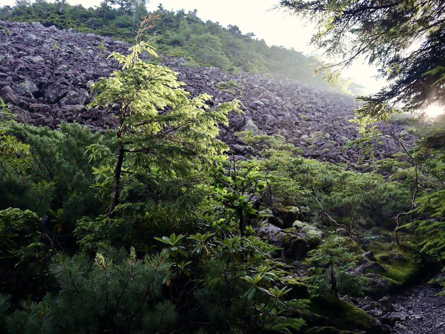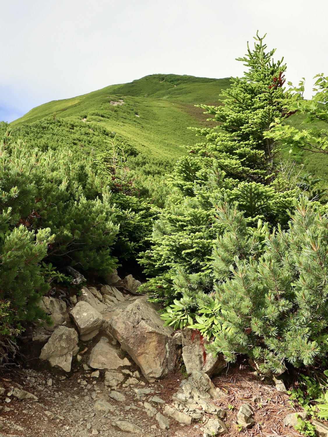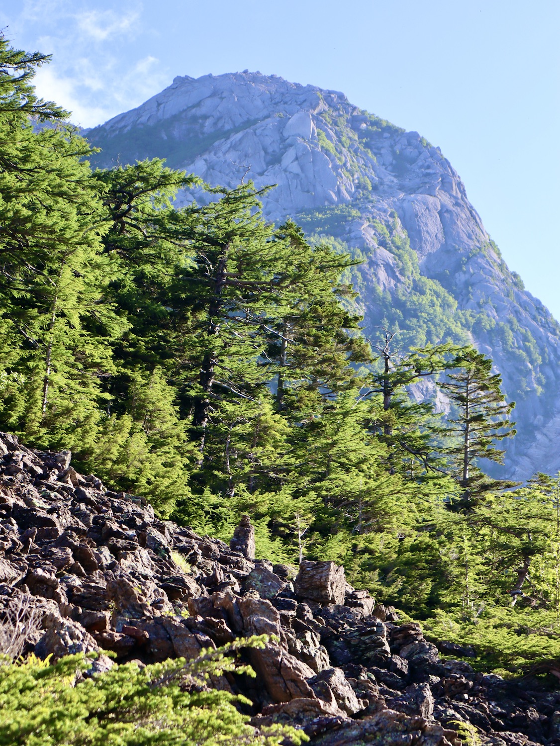 前日令和6年7月29日、山小屋「こもれび山荘」スタッフより『明日は昼前から天気が崩れ昼過ぎ雨になるが、明後日31日は好天の予報です』と報告があった。同行の園田君山﨑君と相談し、メインの甲斐駒ヶ岳登山を31日に回し、今日30日は仙丈ヶ岳登山実施に予定変更した。 山荘は標高2000mで高い山に囲まれ、スマホは使えないしテレビ・新聞もなく、スタッフの情報だけが頼りである。 好天下の活動時間を長くしようと、朝食時間を4:30に早め、弁当を受け取って、5:15山荘を出発した。 山荘周辺の、白っぽい木肌の高木が天を突いて伸びる様に威厳と安らぎを感じたが、登山路に入っても同じだ。 時折樹間から覗く遠い山並みにも元気を貰う。 7:00前、五合目藪沢大滝の頭(2519m)到着。ここから直登し小仙丈ヶ岳をめざすルートを取る。 更に進むこと20分、木々が低くなり背後に鋸岳(2685m)の山並みが見える。そして多分、右手雲の中には木曽駒ヶ岳。 登ること更に5〜6分、刻々と変わる雲の動きが気になる。 と、急速にガスが広がり始め、瞬く間にガスに包まれ強風に見舞われた。山荘に戻ることも考えたが、取り敢えず休憩・補給して様子を見ることにした。 雨は降らず、時折ガスが薄らぐのを幸い、小仙丈ヶ岳(2864m)だけでも登ろうと決し登頂を再開した。 出発から3時間、8:20小仙丈ヶ岳撃破! 園田君、山﨑君の勇姿もガスに霞む。 ガス酷く強風吹く中だが、同じルートを引き返すのも能がないと、仙丈小屋・馬の背ヒュッテ経由で山荘に戻ることにした。山頂を後にする園田・山﨑両君の姿が見る見るガスに溶け込む。 仙丈ヶ岳へ連なる尾根沿いに歩いて、9時過ぎ仙丈小屋との分岐に到着。依然ガス・風が酷く眺望も期待できない。後ろ髪を引かれる思いで仙丈ヶ岳(3032m)登頂断念、仙丈小屋へ向かう・・。 10:00前、仙丈小屋に到着。来し方はガスの中。 ものの10分も経たずにガスが晴れる! 山小屋の厚意で弁当を持ち込んで昼食にした。熱いコーヒーをいただき20分ほど休憩して小屋を出ると仙丈ヶ岳がきれいに見える。 記念に写真を撮り10:00過ぎ仙丈小屋を発った。 10分ほどして振り返ると左に仙丈ヶ岳、右に大仙丈ヶ岳(2975m)、間に仙丈小屋が見える。 西に目を転じると遠く市街地が見える。 雲に隠れてるのは中央アルプスか? 更に40分ほど歩き馬の背へ向かう途中、小仙丈ヶ岳と仙丈ヶ岳を写真1枚に収めた。驚いたことに写真を拡大すると、右端近く仙丈小屋が写っている! デジタルカメラの凄さ? このゆったりした山容ゆえに仙丈ヶ岳は「南アルプスの女王」と呼ばれるらしい。因みに、明日登る甲斐駒ヶ岳は存在感と威圧感の大きさゆえに「山の団十郎」と言われるそうだ。 「馬の背」へ行く目的はお花畑だった。しかし、天気の心配もありここで中断、「馬の背ヒュッテ」へ急ぐことにした。 しか〜し、女王のお花畑は人に優しい。 馬の背ヒュッテへの登山道沿いこそお花畑! 上の黄色い花はマルバダケブギ。 次は有名なトリカブト、見る分には問題なし。 戸台川に連なる流れの傍にはクルマユリの花。 藪沢の流れ沿いをこもれび山荘へ下山開始して間もなく、12:30頃だったろうか、雨脚が一気に強くなり土砂降り状態・・。写真を撮るどころじゃない。 山荘に戻って登山リュックを改めると、中身はまさに水浸し状態。夕食時の明日は好天の言葉が今は救いだ。 途中、雨は収まり最後の山荘への道を歩く。この静寂にして幽玄な雰囲気がとても気に入った。3時前無事山荘に帰着。足の疲れがやや不安だが、ガスあり強風あり本降りの雨あり、勿論絶景あり。苦っ楽しい一日に乾杯〜!! (第1日 完) 『待った〜! タイトルの女神って何じゃい』 これは失礼。今日私は南アルプスの女王に会い、女神に出会った。女王については既に語った。女神について一言。 下りの終点の大平小屋前で休憩していると下山して来た女性が『このサックみなさんのじゃありませんか』 我が雨具サック・・。雨の降り始め、直ぐ使えるよう装着したのを落としたらしい。土砂降りの中、拾ってずっと持って来てくれたのだ! 『なかなかできることじゃないね』と友の言葉 『いや〜、彼女は俺の女神だよ』と私。 女王が見せてくれたさまざまな景色に劣らぬ感動を受け、穏やかで豊かな気持ちになった。『ありがとうございました』お礼は言ったが名前さえ聞いてない。改めてお礼を言えなかったのが心残りだ。