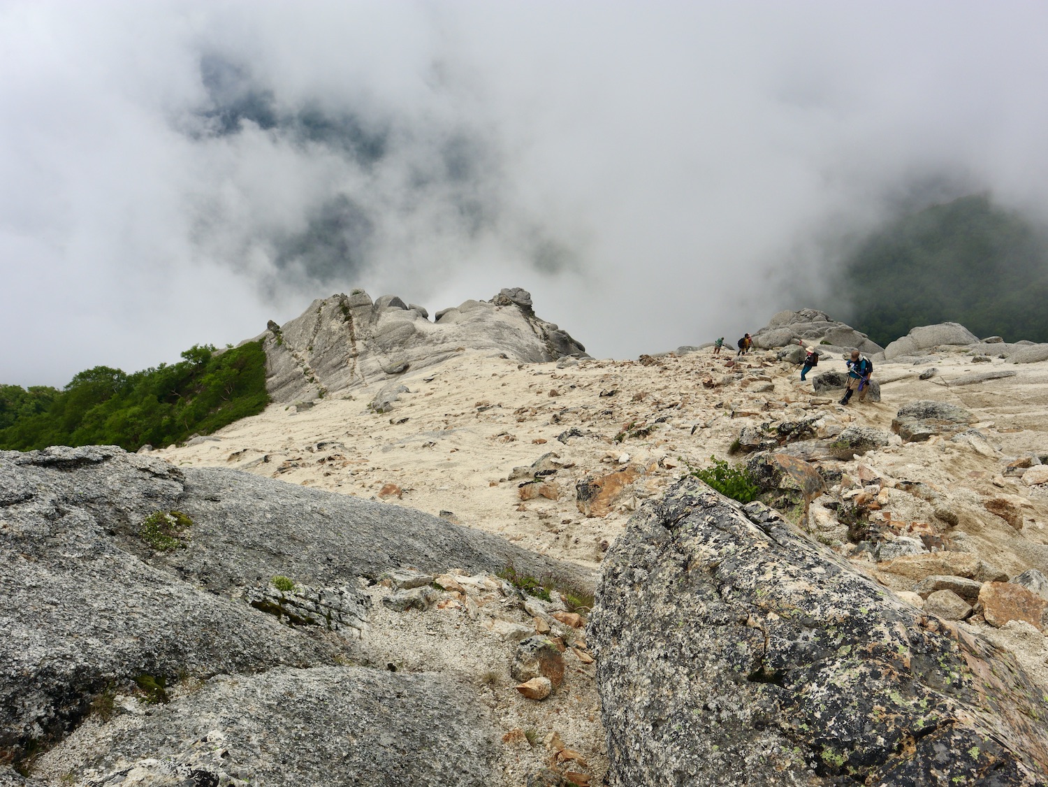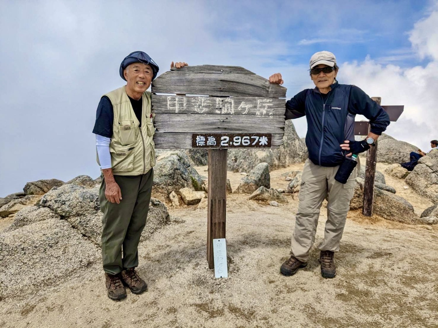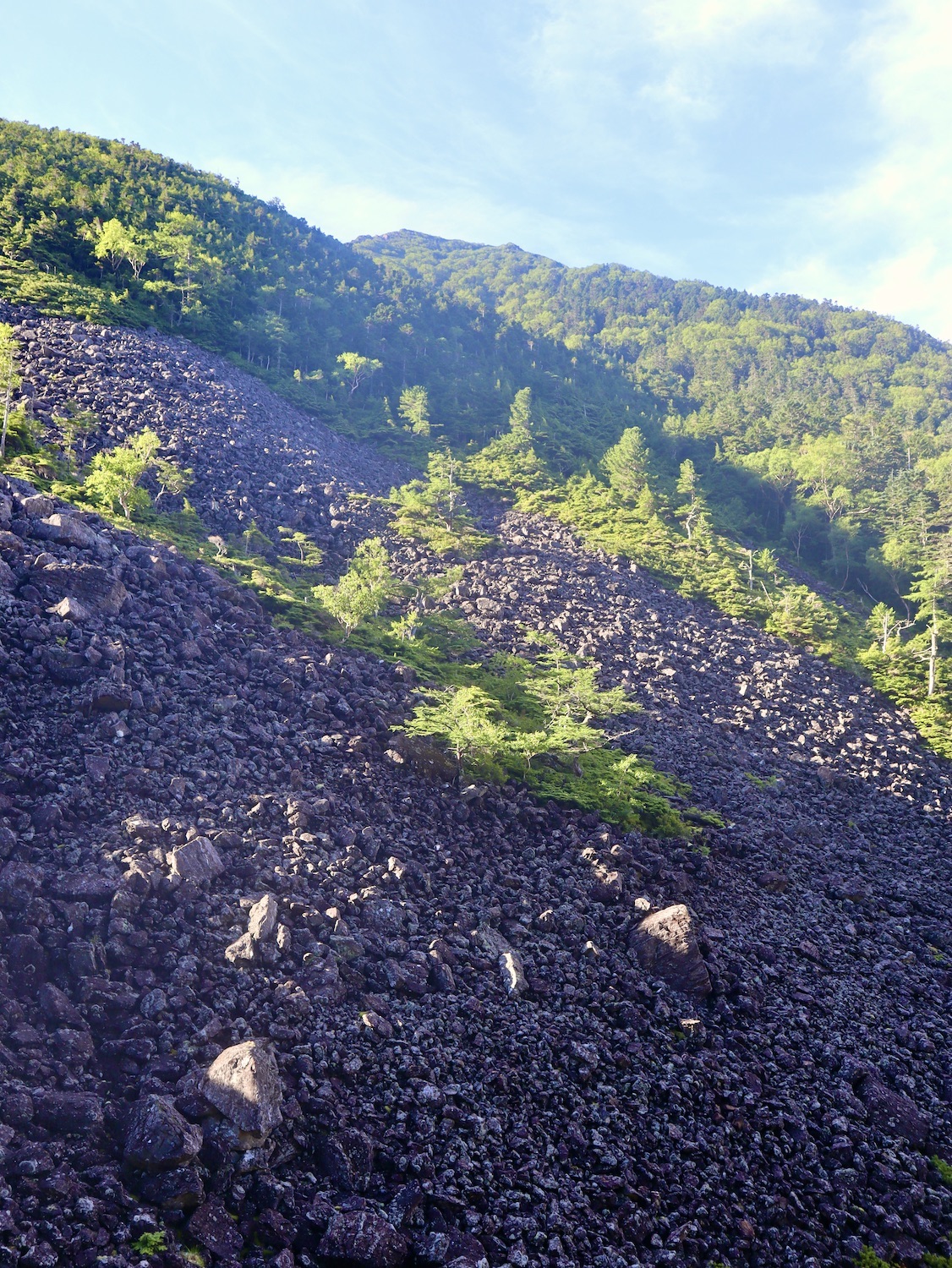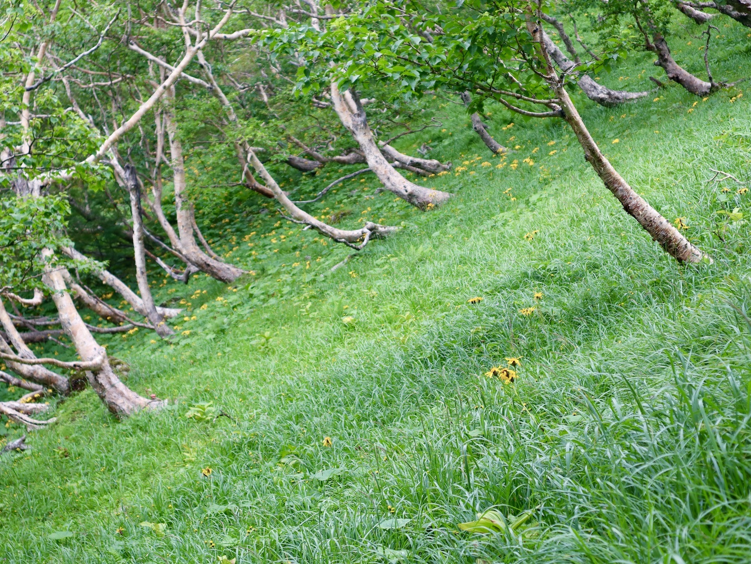前日令和6年7月29日、山小屋「こもれび山荘」スタッフより『明日は昼前から天気が崩れ昼過ぎ雨になるが、明後日31日は好天の予報です』と報告があった。同行の園田君山﨑君と相談し、メインの甲斐駒ヶ岳登山を31日に回し、今日30日は仙丈ヶ岳登山実施に予定変更した。 山荘は標高2000mで高い山に囲まれ、スマホは使えないしテレビ・新聞もなく、スタッフの情報だけが頼りである。 好天下の活動時間を長くしようと、朝食時間を4:30に早め、弁当を受け取って、5:15山荘を出発した。 山荘周辺の、白っぽい木肌の高木が天を突いて伸びる様に威厳と安らぎを感じたが、登山路に入っても同じだ。 時折樹間から覗く遠い山並みにも元気を貰う。 7:00前、五合目藪沢大滝の頭(2519m)到着。ここから直登し小仙丈ヶ岳をめざすルートを取る。 更に進むこと20分、木々が低くなり背後に鋸岳(2685m)の山並みが見える。そして多分、右手雲の中には木曽駒ヶ岳。 登ること更に5〜6分、刻々と変わる雲の動きが気になる。 と、急速にガスが広がり始め、瞬く間にガスに包まれ強風に見舞われた。山荘に戻ることも考えたが、取り敢えず休憩・補給して様子を見ることにした。 雨は降らず、時折ガスが薄らぐのを幸い、小仙丈ヶ岳(2864m)だけでも登ろうと決し登頂を再開した。 出発から3時間、8:20小仙丈ヶ岳撃破! 園田君、山﨑君の勇姿もガスに霞む。 ガス酷く強風吹く中だが、同じルートを引き返すのも能がないと、仙丈小屋・馬の背ヒュッテ経由で山荘に戻ることにした。山頂を後にする園田・山﨑両君の姿が見る見るガスに溶け込む。 仙丈ヶ岳へ連なる尾根沿いに歩いて、9時過ぎ仙丈小屋との分岐に到着。依然ガス・風が酷く眺望も期待できない。後ろ髪を引かれる思いで仙丈ヶ岳(3032m)登頂断念、仙丈小屋へ向かう・・。 10:00前、仙丈小屋に到着。来し方はガスの中。 ものの10分も経たずにガスが晴れる! 山小屋の厚意で弁当を持ち込んで昼食にした。熱いコーヒーをいただき20分ほど休憩して小屋を出ると仙丈ヶ岳がきれいに見える。 記念に写真を撮り10:00過ぎ仙丈小屋を発った。 10分ほどして振り返ると左に仙丈ヶ岳、右に大仙丈ヶ岳(2975m)、間に仙丈小屋が見える。 西に目を転じると遠く市街地が見える。 雲に隠れてるのは中央アルプスか? 更に40分ほど歩き馬の背へ向かう途中、小仙丈ヶ岳と仙丈ヶ岳を写真1枚に収めた。驚いたことに写真を拡大すると、右端近く仙丈小屋が写っている! デジタルカメラの凄さ? このゆったりした山容ゆえに仙丈ヶ岳は「南アルプスの女王」と呼ばれるらしい。因みに、明日登る甲斐駒ヶ岳は存在感と威圧感の大きさゆえに「山の団十郎」と言われるそうだ。 「馬の背」へ行く目的はお花畑だった。しかし、天気の心配もありここで中断、「馬の背ヒュッテ」へ急ぐことにした。 しか〜し、女王のお花畑は人に優しい。 馬の背ヒュッテへの登山道沿いこそお花畑! 上の黄色い花はマルバダケブギ。 次は有名なトリカブト、見る分には問題なし。 戸台川に連なる流れの傍にはクルマユリの花。 藪沢の流れ沿いをこもれび山荘へ下山開始して間もなく、12:30頃だったろうか、雨脚が一気に強くなり土砂降り状態・・。写真を撮るどころじゃない。 山荘に戻って登山リュックを改めると、中身はまさに水浸し状態。夕食時の明日は好天の言葉が今は救いだ。 途中、雨は収まり最後の山荘への道を歩く。この静寂にして幽玄な雰囲気がとても気に入った。3時前無事山荘に帰着。足の疲れがやや不安だが、ガスあり強風あり本降りの雨あり、勿論絶景あり。苦っ楽しい一日に乾杯〜!! (第1日 完) 『待った〜! タイトルの女神って何じゃい』 これは失礼。今日私は南アルプスの女王に会い、女神に出会った。女王については既に語った。女神について一言。 下りの終点の大平小屋前で休憩していると下山して来た女性が『このサックみなさんのじゃありませんか』 我が雨具サック・・。雨の降り始め、直ぐ使えるよう装着したのを落としたらしい。土砂降りの中、拾ってずっと持って来てくれたのだ! 『なかなかできることじゃないね』と友の言葉 『いや〜、彼女は俺の女神だよ』と私。 女王が見せてくれたさまざまな景色に劣らぬ感動を受け、穏やかで豊かな気持ちになった。『ありがとうございました』お礼は言ったが名前さえ聞いてない。改めてお礼を言えなかったのが心残りだ。