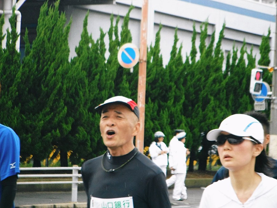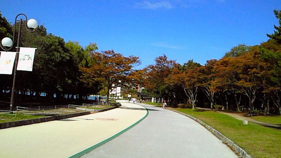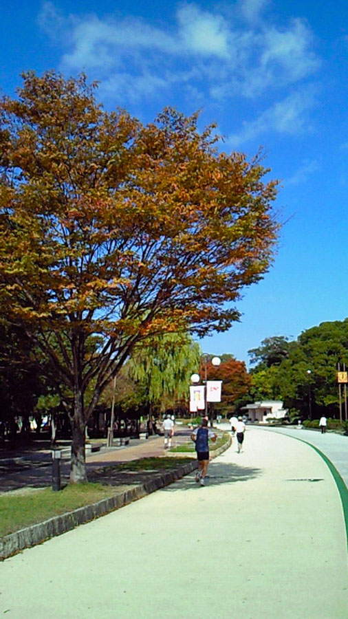 まだ万全とはいかないものの、筋肉の張りは余り感じない状態になりました。明日の天気予報、雨のち曇りは、寒さへの不安はあるものの晴天の暑さよりはましだと思われます。 自転車仲間のyamamenさん、まっこちさん、グレッグさんには大変ご迷惑をおかけしますが、明日早朝から会場まで送って頂くことになりました。私にとっては非常なプレッシャーですが、応援して頂くことにもなりそうです。 振り返ってみれば、ジョギング年間1000㎞の目標ギブアップが嫌なばかりに、急遽申し込んでエントリーされた下関海響マラソン。ダメで元々。ここ2〜3日、夢にまでマラソンが出てくる状況は、考えようによっては滑稽ですらあります。 精一杯走ってきます。この続き、結果報告は明日帰宅後に、、 またもや報告が遅れました。昨日は疲労と太腿の痛みとビールの飲み過ぎとでパソコンに向かう気力が残っていませんでした。 明けて今朝は、そして今も、久し振りに階段を下りるのもままならない状態です。手すりと壁を支えにする情けない姿。しかし、ストレッチとマッサージをして早速大濠公園へ!ジョギングとウォーキングで2周しました。紅葉と青空が爽やかです。 ゴール前、『笑顔でゴールして下さ〜い!』のアナウンス。 『糞っ食らえ』です!30キロ過ぎから、絶対に歩かない、唯それだけを言い聞かせながら脚の痛みに耐え、立ち止まりたい誘惑を振り払い走り抜いてきたのです。ゴール前だけの写真用の作り笑いなど、、。 恐らく最後の力を振り絞る鬼のような形相をしていたのではないかと、、? σ(^^) しかし、ごく自然に出ました。ゴールラインを越えるその瞬間、右手の拳を突き上げて『やったー!』恐らく声には出さなかったはずですが、心の中では確かに叫んでいました。やっと走り続けることから解放され、痛みに耐えながら歩きます。そこら中のランナーが戦友に見えます。 maple tsutsumi さんの実走アドバイスに従って、前半ペースを抑えたことが、30キロ過ぎの苦しさを乗り越える力を残してくれました。そして、早朝5時から雨の中を下関まで一緒して頂き、沿道のあちこちで声援して下さった自転車仲間yamamenさん、まっこちさん、グレッグさん。そして陰ながら応援して頂いた皆さん。それら総てのおかげで実現した完走だと感謝しています。本当にありがとうございました。<m(__)m>