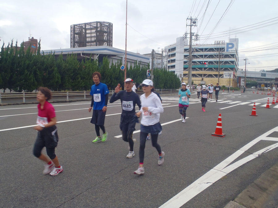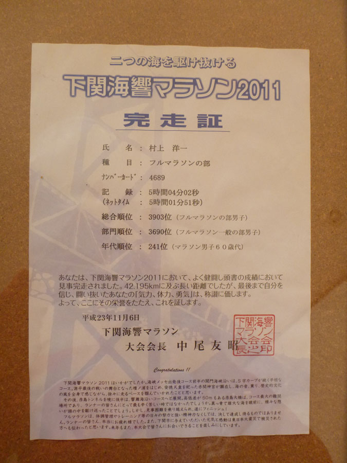 いよいよ明日。シティマラソン福岡の日です。今月は今日22日迄にジョギング132㎞、自転車587㎞をこなしました。マラソンメインの人に比べれば、練習量は少ないでしょうが、自分としては満足です。 しか〜〜し、不安材料もあります。ふくらはぎに強い張りがあります。若い女性ランナーたちと練習したのがまずかった?σ(^◇^;) 最初から全く付いて行けなかった、付いて行くつもりもなかったのですが、ついつい頑張ってしまったようです。 翌20日、かなり張りがあるのがわかっていながら、油山ジョギング(A)、そして、昨21日は大濠3周。 今日は、朝から湿布しマッサージを繰り返していますが、、。急遽大濠3周の予定を変更。前日受付のヤフードームまで往復7㎞のウオーキング主体の調整をすることに決断します。 失敗に備えての、醜い予防線、言い訳はこれで十分。(^^ゞ これまでのシティマラソン福岡の記録(ネットタイム)を公開します。 2008年11月 2日 2時間10分20秒 2010年10月31日 2時間04分22秒 ここで、一旦編集作業中止です。続きは、明日帰宅後に書くことにします!果たして気持ち良く書き続けることができるやら? 申し訳ありませ〜〜ん!一昨日、昨日と38度を超す熱がありまして、ブログ編集のゆとりがありませんでした。(軟弱者!) この書き出しで察していただけると思いますが、、。はい、2時間切りはできませんでした。ネットタイム 2時間03分56秒。これが今回の記録です。そして初めて知りました。西日本新聞に、2時間以内完走者の名前が掲載されることを〜〜!念のため、完走証は多分スタートの号砲から2時間10〜20分で走ればもらえます。次の完走証が証拠です。σ(^◇^;) やや悔しさが込み上げています。(>_<)ゞ ただ今宣言します!来年は100%新聞に掲載される記録を達成します!!もっとも、来年もエントリーされるかどうかが問題ですが、、。 さてスタート直後、短時間ですが晴れ間が広がり陽が刺し、気温も上昇。後半に備えキロ6分を少し切るペースで走りました。今思えば、このアバウトさが最大の敗因です。もっと明確な時間設定をしておくべきでした。(×_×) おまけに、一緒に走ったyamamenさん(初ハーフ挑戦、いきなり2時間切り達成!)を始め、沿道で応援していただいた自転車仲間の皆さんが企画して下さった慰労BBQパーティーを、体調不良で途中脱落!!本当に申し訳ありませ〜ん。と、これは食べ物・飲み物への謝罪の言葉。それと、何かとお世話になったyamamen夫人への感謝の言葉です。f(^ー^; (皆さんへの感謝です!今更言っても遅いか?) 自転車仲間にいただいた写真から1枚。題して『知らぬが仏』 今回の反省も込めて、11月6日の下関海響マラソンは、実力相応?の無歩行での5時間内完走だけを目指します。また熱を出さなければ、(^^ゞ レース当日中に結果を報告するよう努力します。 完走の自信?今の私の心の支えはこの方だけです。 最後に、改めて報告が遅れ、ご心配をおかけしたことをお詫び申し上げます。