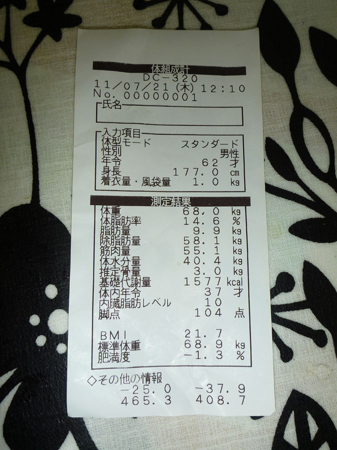 しか〜〜し、このコース、まだ本の序盤に過ぎません。箱石峠に登り、アップダウンを繰り返して昼食を取ったあとには、誰が言ったか地獄峠──地蔵峠──、そして最後には俵山峠が待っています。 箱石峠めざして 地蔵峠からの眺め 俵山峠からゴール方向 今月の自転車 910km、ジョギング 68kmとなりました。自転車の2大イベントも終了。しばらくは楽しく走ります。 節電と猛暑の砌、皆さん呉々もご自愛下さい。 ツール・ド・国東は完走は当たり前、タイムが問題。しかし、『阿蘇望』は完走が最大の勲章。挑戦すること6回、完走は2回だけです。大会名称は『阿蘇望』而してその実態は『修行』か『苦行』か! 昨年5月からのトレーニングで、自転車力は格段に向上し(多分)、体力的にもパワーアップ。写真は整骨院で計量した結果です。拡大して体内年齢だけでも見てやって下さい。まっ、自慢ですから無視されて結構ですが、、。 阿蘇望の完走、必要なのは雑草の逞しさに違いありません。明日は逞しさの芽のかけらを育むために遊んできます (^。^) 皆さん、完走の念力を送って下さいね〜。 |