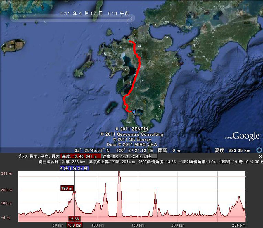 今回は記録更新状況のお知らせの筈でしたが、予定変更!20日(水)のサイクリングの報告をします。記録更新については、四王寺山に挑戦し、25か26日に報告したいと思います。 さて20日、鹿児島ツアーで筋肉の疲労が溜まっている感じ。自転車仲間のyamamenさんに軽いポタリングにお付き合いをお願いします。兎に角無理せず平地を走るだけ、やや気乗りしない志賀島ツアーに出掛けます。少しでも変化をと、海の中道海浜公園へ急遽予定を変更。気乗りしないままに、、、。 西サイクリングセンター口で開園前の時間潰し。最新の自転車を背景に愛車の撮影をします。どう見ても子供向けの雰囲気。所在なげにyamamenさんもブラブラしています。 しか〜し、園内を進み展望台のシーサイドヒルシオヤに来る頃には、二人共に気持ちが高揚してきます。玄界灘の素晴らしい眺めが得られます。 左手には志賀島 シーサイドヒルシオヤ 右手は和白方面 公園は、和白方向に拡張され以前の倍近くになっています。玄界灘を眺めながらの海沿いの道!景色を楽しみ、潮風を受けながら爽やかな気分で自転車を走らせます。 走り詰めたところに陸橋があり、県道59号を渡り博多湾側へ行きます。この陸橋から撮ったのが、記事の冒頭の写真です。左手に能古島、右手に志賀島が見えます。飛行機まで飛んで気持ちを高めてくれます。(笑) 見晴らしのよさでは、陸橋を渡った環境共生の森も負けてはいません。玄界灘と博多湾の両方を写真に収められます。玄界灘側と博多湾側、甲乙つけ難い眺望です。 道路を下ったカモ池周辺の眺めもいけ(池)ます!今回写真が多いですが、せめて良さそうなのだけでもクリック拡大して楽しんで下さい。 レンタサイクルでなければ、このカモ池口からも帰れますが、今回は今来たこの道帰りゃんせ。花を楽しむために西口へ引き返しました。厳選3枚を披露して終わりです。 さすが国営です!海の中道海浜公園は都会のオアシス、大人のための公園でもあります。5月1日の日曜サイクリングは海中決定。ツール・ド・国東に出場の皆さん、これまでの疲れを、海中で癒しレースに向けて英気を養いましょう。 最悪であったが、収穫の多い旅でもあった。収穫の第1は脚力アップ。同行したメンバーが健脚揃い。前半熊本入りまでは、時に40km/hを超えるハイペースだったが、何とか付いて走れた。 月・岩・海 〜静寂〜 ⇒ 距離や高低差など、難易度の高いツアーをグループで走ると、それぞれの持ち味が発揮される。誰もが皆何か優れたものを持っていて、そのすぐれた部分に気付かされるのも楽しい。 鹿児島の、『川久』のトンカツの旨さ、これは文句なし。小食の私だが、上ロースカツ定食2人前は大丈夫である。ライスは別だが、、。全員一致で上ロースカツ定食とビールを注文したが、個人的にはみそかつ丼も魅力。来年はこれで決まり!? しかし、嬉しかったのは心の反応である。『ガアーン』ではない。軽い『あ〜っ』である。最初こそ、メカに強い同行のグレッグおかさんの修理技術に祈る思いだったが、いつの間にか挑戦心の方が勝っていた。 去年までとは違う!いざとなればダンシングで1時間走られるし、どれだけ進化したか試してやろう!『身体を鍛え、精神も鍛える』上手く行ったようだ。何事にも臆せず淡々と取り組む自分を発見する昨今である。 傷ついた愛車で朝靄の中に眠る鹿児島郊外を通り抜け320km完走!平均時速 25km。鹿児島到着。やったぜ!乾杯だ〜〜っ! 次回は、練習コースでの記録更新状況の報告をします。 今回は、10日、日曜日の久留米・鷹取山への行路で発見した景色です。花にしろ、食べ物にしろ、何にしろ、我々が知らないだけで、それぞれの土地に穴場的な場所があるに違いありません。そんな隠れたものの発見には、心躍る楽しみがあります。 ご紹介するのは、筑前町は草場川の桜です。筑紫野市と日田市を結ぶ国道386号線を走っていて目に留まり、立ち寄りました。周囲に広がる緑の田園風景との対比で、桜と菜の花の色が鮮やかで、草場川の清流に映る影も印象的です。 草場川以外でも素晴らしい春の景色をゲットしました。 普段仕事に忙しく、花を楽しむ暇もないという方もあるかもしれません。そんな方のために今春撮った桜の写真ベスト8をお届けします。 最後に、自転車生活の報告です。10日迄に、自転車に乗ったのは7日間約560km。滑り出しは順調ですが、、、。 自粛ムードの中で、やきもきしていたツール・ド・国東の開催も最終的に決定。大会での自己記録短縮だけを目標に1年間練習してきましたが、今月20日過ぎには、お約束していた練習コースでの記録更新への取り組みの結果を報告したいと思います。 |