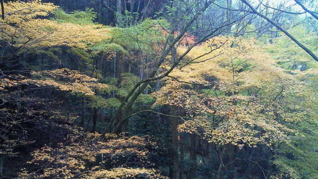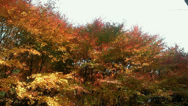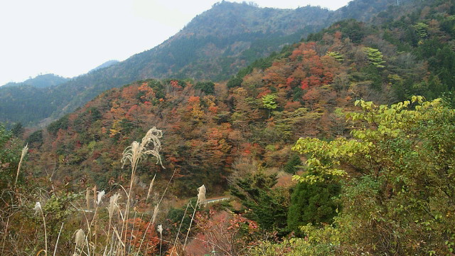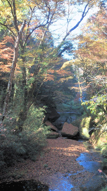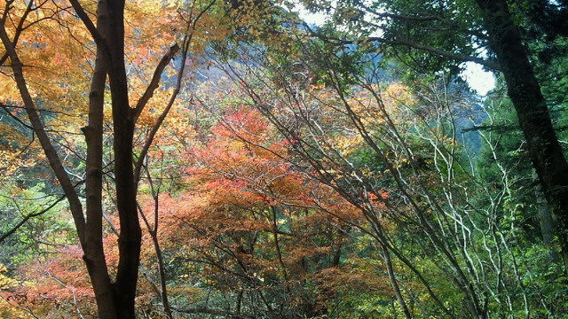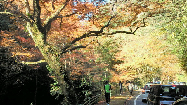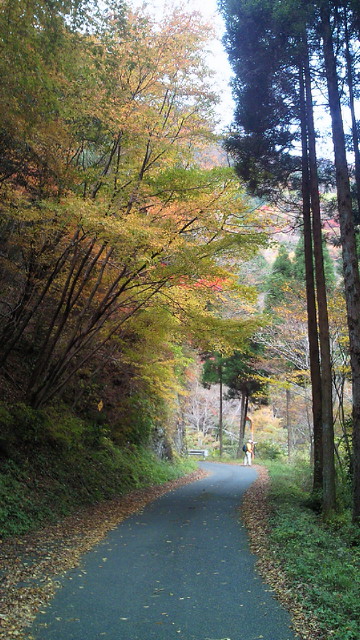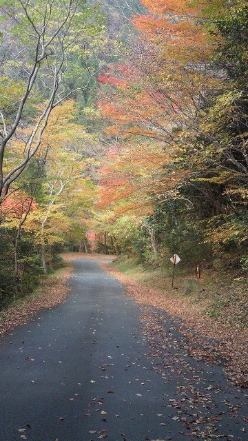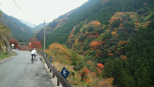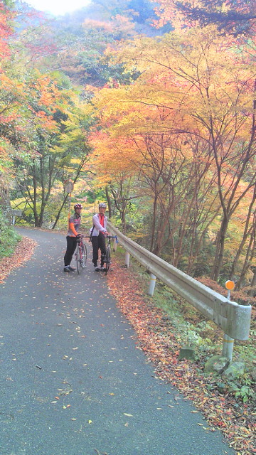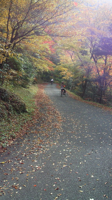 「汗流し つかみ取る秋 輝けり」 黒木町、矢部村、釈迦岳、そして浮羽町とアップ・ダウンの連続 見てくれる人も少ない山奥でも、自然は精一杯命を燃やして輝いています。その美しさは汗を流した者だけが味わえる贅沢です。 「ありがたや 深山の錦繍 誰ぞ知る」 釈迦岳の後は、日田スーパー林道を走るのですが、これが最も素晴らしい!かなり長い区間が車両通行止めで、自動車は通れません。つまり自転車専用の紅葉観光道路です。 道路一面に散り敷かれた落ち葉を踏みながら、紅葉のトンネルを走ります。聞こえるのは、車輪に踏まれカサカサと奏でられる音だけ。そんな静寂さの中、木々は惜しみなく美の極致を見せてくれます。 もっとも、そんな静かな錦繍の絵巻の世界にあって、年甲斐もなく、感動のあまり一人嘆声を発し続け、静けさを掻き乱していたことを正直に告白致します。 (ブログ本文中の写真は全てクリックで拡大できます)
