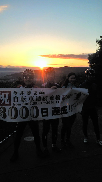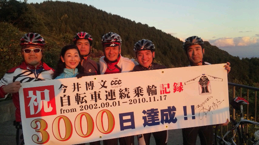 そして21日には、サイクリング仲間と朝6時に福岡を出発。 牧歌的朝靄の風景あり、美味しいものあり、紅葉あり、日田からは高速バス中の宴会ありで楽しく贅沢な一日を過ごしました。 約160kmを走り、今月の走行距離は早くも1200km突破です!人はこれを快挙と呼ぶ。 なんてのは針小棒大の誇大表現。単に『頑張ってますね』の言葉で十分。真に快挙の言葉に値すること、それは私の身近に起こった次のような出来事だと思います。 以前 Cycle 86 にもよく参加いただきました。 その今井さん、2002年9月1日に始まり、2010年11月17日まで3000日間、雨の日も、風の日も、雪の日も、台風の日でさえも一日も欠かすことなく自転車に乗り続けたのです。 『継続は力なり』自分の専売特許の如くに繰り返し使った言葉。多くの人が使った、あるいは使う言葉ではないでしょうか。そして、私を筆頭に多くの人が口先だけで終わらせている。 『言うは易く行うは難し』趣味、学習、仕事、家事、その他何であろうと、少なくとも私には3000日連続して何かをやり抜くなど、夢のまた夢です。しかしそれをやり抜く人こそ、 真に人生を楽しむ達人になる資格があると思います。逆境に在ってもたくましく生き抜く人になりうると思います。 その達成の瞬間に立ち会うことができたことは、有り難いことだと感謝しています。 この快挙を目の当たりにし、自分のこれからを改めて考え直し、悔いのない人生を送りたいと思っています。 この快挙に思いを致すうちに、ふと思い浮かんだのが長濱くんのことです。どうなったのだろう? 便利な世の中です。早速インターネットでアクセス! 日本一周の旅の折、徳島から和歌山へのフェリーで出会った彼。 何度かブログを見ましたが、日本一周が終わって1年5ヶ月、すっかり忘れていました。その長濱くん、何とその間もずっと旅を続けていたのです! 『自転車で世界一周!』私の勝手な思い込みとは違って、自転車は日本国内のみ、後は様々な移動手段での旅であったようですが、これも間違いなく快挙だと思います。更に、彼の他にも実に多くの人が世界一周に挑んでいることを知りました。 私たちがあくせく生活しているこの瞬間にも、様々なチャレンジがあっている。旅に限らず、日常の仕事や生活の中、いろいろな場面で挑戦している人たちがいる。そのことも心に留めながら、お互いの生活・人生をより充実させるよう心がけたいですね。 今月の自転車、超いいペースです。行きも行ったり、四王寺山3回、三瀬峠2回、久留米・鷹取山、八女・立花町、唐津・鏡山、そして釈迦岳。