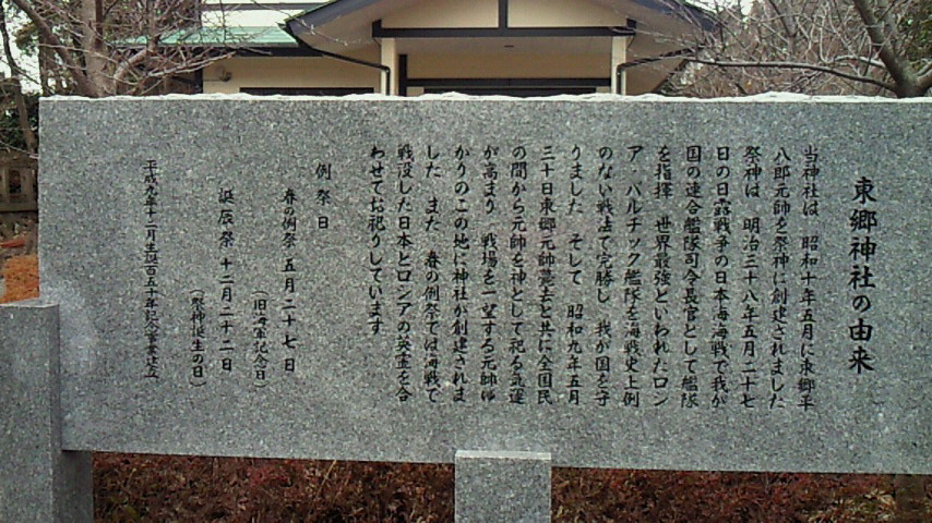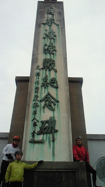 中学1年の春、ある日突然くしゃみと、鼻水に襲われたのを覚えています。当時、花粉症なる言葉があったかどうか。それ以来40数年、春先は恨めしい季節でもあります。こればかりは継続しても免疫にならないようです。 14日の日曜サイクリングの最中、今年もその時を迎えたようです。走りは冴えず、喉のいがらっぽさに悩む夜。暫く忍耐力養成に専念です。 花粉症はともかく、サイクリングは楽しいものでした。目的地は宗像の国民宿舎『ひびき』。途中、福津市津屋崎の東郷神社に寄りました。神社手前には内海があり、沢山の鴨が群れをなし水面に黒く点々と見えます。 内海と外海の間に架かる津屋崎橋から1キロ半ほど。小高い丘の頂上近くに東郷神社はあります。確か高校の遠足以来40数年振りの再訪問。昔の記憶はほとんどありませんが、昨年末『坂の上の雲』のテレビ放送があったこともあり感慨一入。神社には連合艦隊旗艦『三笠』の主砲の一部も残っています。 頂上まで足を延ばすと、日本海海戦記念広場があります。記念碑の向かって右手には、東郷司令長官の許可の下、秋山真之が掲揚を命じたZ旗の信号文『皇国の興廃、此の一戦に在り。各員一層奮励努力せよ。』があります。北方には玄界灘が広がっています。日露両国艦隊の砲声が響き渡ったのでしょうか。生憎の曇り空でよい写真がありません。次回訪問の折りには素晴らしい眺めをお裾分けします。 メインの『ひびき』勿論言うことなし!これ目当てのツーリングです。5階から見晴らす玄界灘と料理。至福の時が流れます。今回はアラカブ煮付け定食。アラカブの睨みつけるが如き、吼えるが如き面相をものともせず、骨の髄まで美味しく頂戴。不味い時は『あら、株で失敗』と受けをねらって下さい。(お粗末) さて、軟弱でなまっちろい生活を反省。油山1日5往復を2月の目標にしましたが、最近の低調な記録にその達成には悲観的でした。しかし、まがりなりにもトレーニングを続けてきた甲斐がありました。16日小雨降る中、意を決しいざ油山!寒さによる指の痛みと闘いながら挑戦。報われました。12月7日以来、実に2ヶ月振りの5往復!その時、雨は上がり、遠くには晴れ間さえ覗きました。『天の祝福!奇跡だ!』 と日記には書いておこう(^o^)。