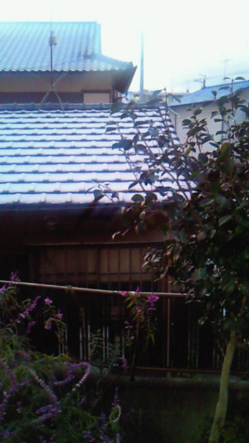 17日は私の誕生日。寒い日ですが油山を目指します。坂を上る途中。ほんの一瞬(数秒間)雪がチラリ。年内の雪を諦めかけていただけにホッ。しかし、初雪と言えるのかどうか?展望台から見ると雲が博多湾に低く垂れ込め、いかにも寒々とした眺めです。夜は娘からのプレゼントに頬がゆるみます。皆さん!どんなものでも親は嬉しいのです。親孝行お忘れなく〜。 18日も一瞬の降雪。3枚目の写真、クリックしてよ〜くご覧下さい。隣の家の板壁に白い幾つかの縦線。雪です。『空飛ぶ素麺』ではありません。そして19日の朝。初雪だぁ〜!我が家の庭先の屋根。うっすらと雪が。温暖化が叫ばれる近年、この程度の雪でさえ有り難く思われます。