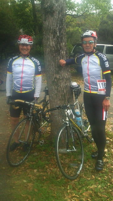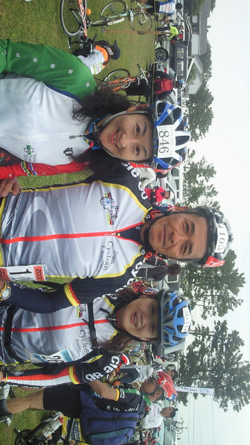 しかし、痛めた足が腫れて、氷でアイシング。テンションが上がりません。 スタート地点に行く途中、Cycle 86の西塔さんに出会って(写真)、俄然戦闘モード。 赤く腫れた足では、しかし、如何ともしがたいもの。言うことをきかない脚との戦いでした。曇天の好条件にもかかわらず、記録はワースト。6時間42分03秒。でもいいや。完走したんだから。 おまけに、チームの女性メンバーを両手に、記念の写真撮影(写真)までしたのだから! でも、これだけは言っておきます。来年は必ず5時間台で完走すると。 好記録の皆さん!ご覚悟!な~んちゃって(笑)。 レース後の、一人淋しいはずの夕食は、北九州市のご夫妻と意気投合。三人でテーブルを囲み、大いに盛り上がったのであります。 以上、報告終わり!